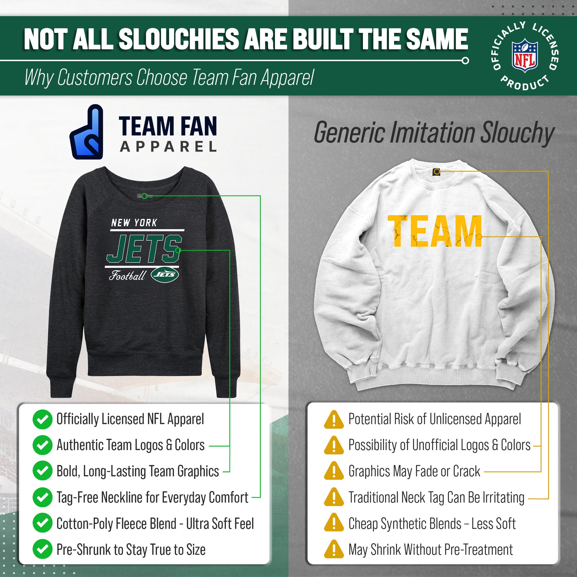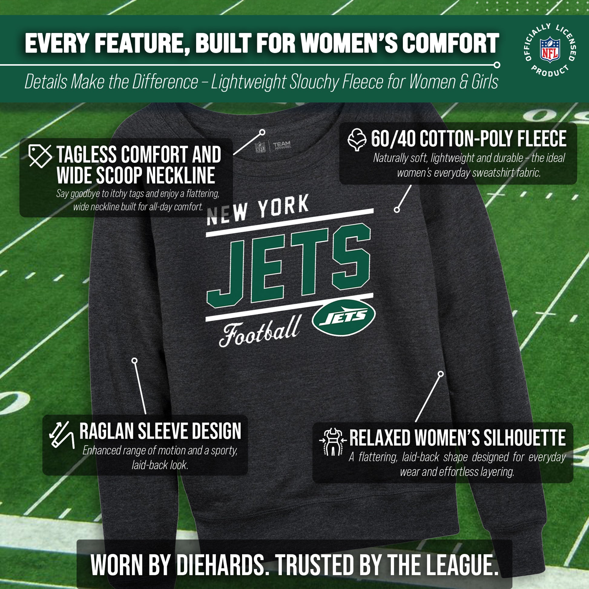 Our officially licensed New York Jets long sleeve crew neck pullover is super comfortable, runs true to size, and is great for showing off your Jets pride. The high-quality thermal printed logo will look fresh after years of wear, making it a great alternative to wearing a New York Jets womens jersey. Our womens long sleeve Gameday crewneck has a relaxed fit for a casual, comfortable look. The long sleeve Jets crew will look great with shorts at tailgates in warmer months, or with jeans or leggings when it gets cooler. Layer it with a hoodie or even a New York football jersey when the weather gets cold. Available in plus sizes up to 3XW, this is a New York Jets pullover that women who are plus size or straight size will feel comfortable in. If you're looking to give the gift of ladies Jets apparel, our long sleeved New York Jets Slouchy Crew is the perfect gift. Officially licensed to ensure no counterfeit designs or colors, these New York crews for women are perfect for super fans. Made from a cotton poly blend to keep you comfortable, the womens raglan long sleeve Gameday Slouchy Crew will definitely become one of your favorite pieces of New York Jets apparel.