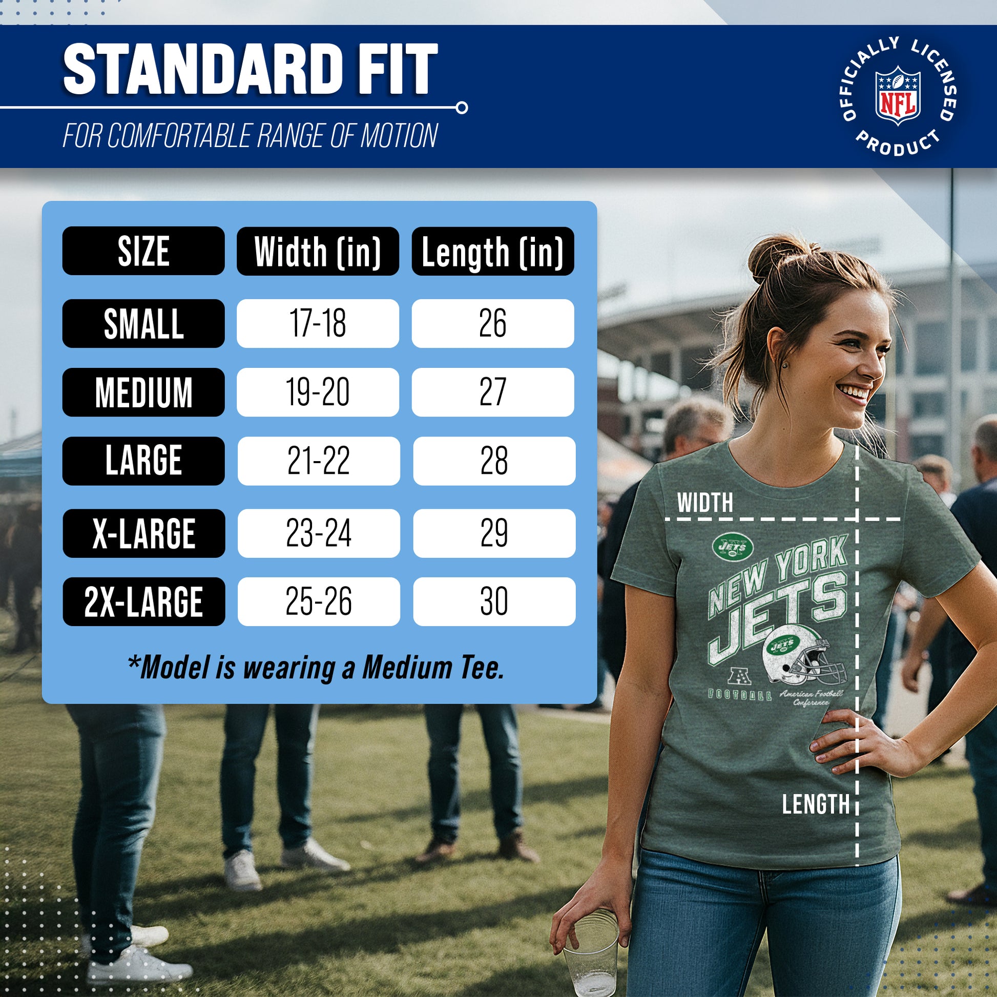 Calling all ladies! Get ready to rock game day with the Women's Team Fan Apparel Distressed Helmet T-Shirt! This comfortable and stylish New York Jets womens tee is perfect for any female football fan, whether you're cheering on your favorite team at the stadium or watching from home. Made from a super soft cotton fabric , this shirt will keep you cool and comfortable all game long. The helmet, team name, team logo and official team color adds a touch of retro flair, while the tag-less design ensures itch-free wear. Whether you're a die-hard fan or just love a good simple look, this shirt is perfect for showing off your team spirit. Available in a wide range of women's sizes, it's suitable for all shapes and sizes! So grab your girlfriends and get ready to cheer on your team in style with the Women's Team Fan Apparel Distressed Helmet T-Shirt!