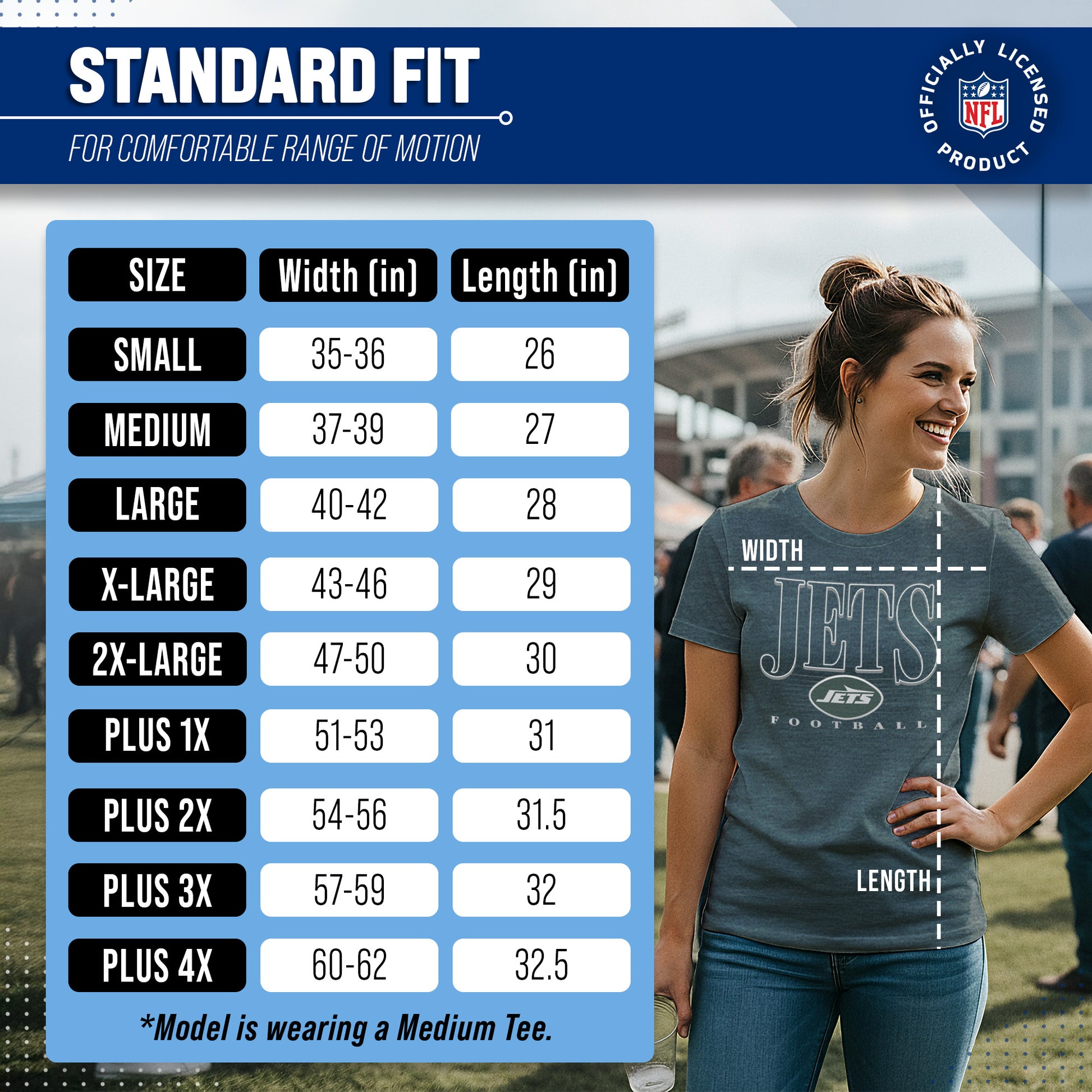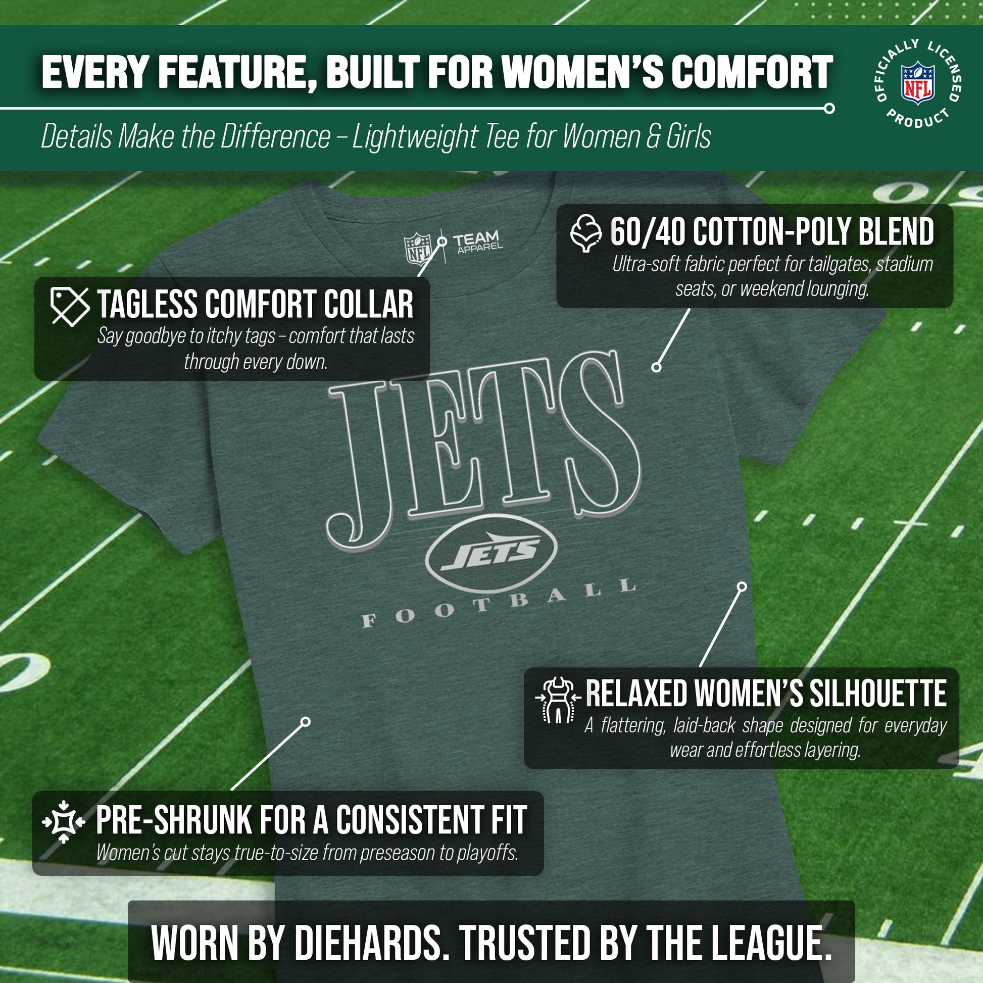 Calling all ladies! Get ready to rock game day with the Women's Team Fan Apparel Overtime Blueprint T-Shirt! This comfortable and stylish New York Jets womens tee is perfect for any female football fan, whether you're cheering on your favorite team at the stadium or watching from home. Made from a super soft cotton fabric , this shirt will keep you cool and comfortable all game long. The text, logo and official team color adds a touch of retro flair, while the tag-less design ensures itch-free wear. Whether you're a die-hard fan or just love a good classic look, this shirt is perfect for showing off your team spirit. Available in a wide range of women's sizes, it's suitable for all shapes and sizes! So grab your girlfriends and get ready to cheer on your team in style with the Women's Team Fan Apparel Overtime Blueprint T-Shirt!