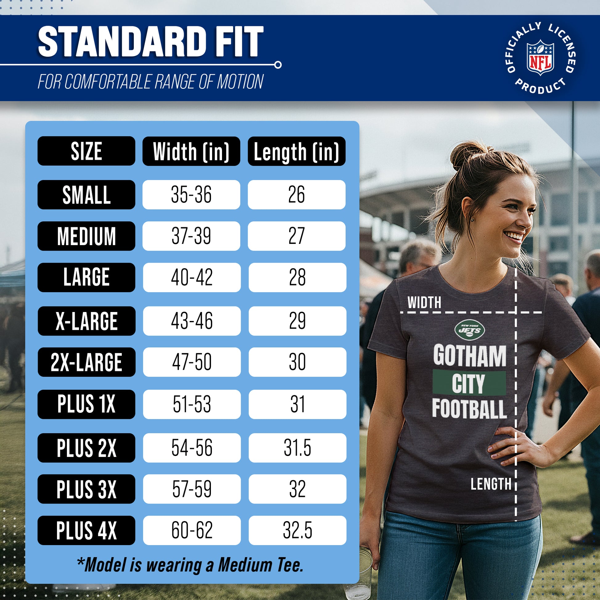 Our officially licensed womens slogan shirt is super comfortable, runs true to size, and is great for showing off your New York Jets pride. Stand out in the crowd with the New York Jets slogan tshirts! The high-quality thermal printed logo will look fresh after years of wear, making it a great alternative to your womens New York Jets jersey. Our womens football t-shirt has a relaxed yet contoured fit for a casual yet feminine look. The short sleeve shirt is perfect with shorts for tailgates in warmer months, or with jeans or leggings and a sweater during colder months. Available in plus sizes up to 3XW, our New York football shirts for women plus size or straight size will make anyone feel comfortable enough to show off their love for the New York Jets team. If you're looking to give team t shirts for women as a gifts, our slogan tshirt is the New York shirt women will love. Officially licensed to ensure no counterfeit designs or colors, our New York Jets womens shirts are great for superfans. Made from a blend of cotton and polyester, this piece of womens New York apparel is designed to keep you cool and comfortable all year long. The womens football shirt will definitely become one of your favorite New York tops.
