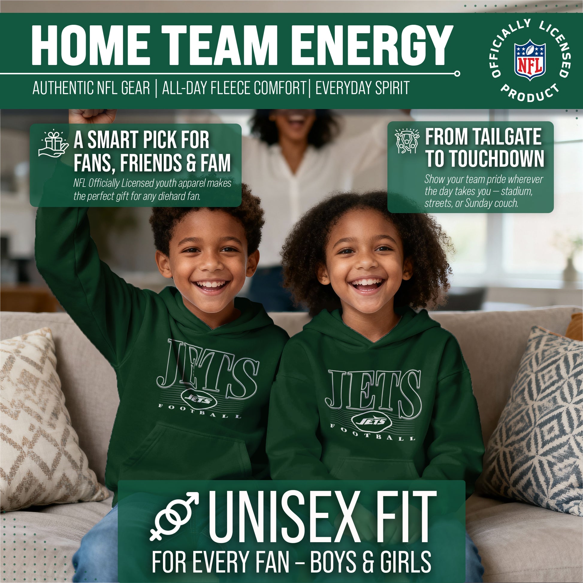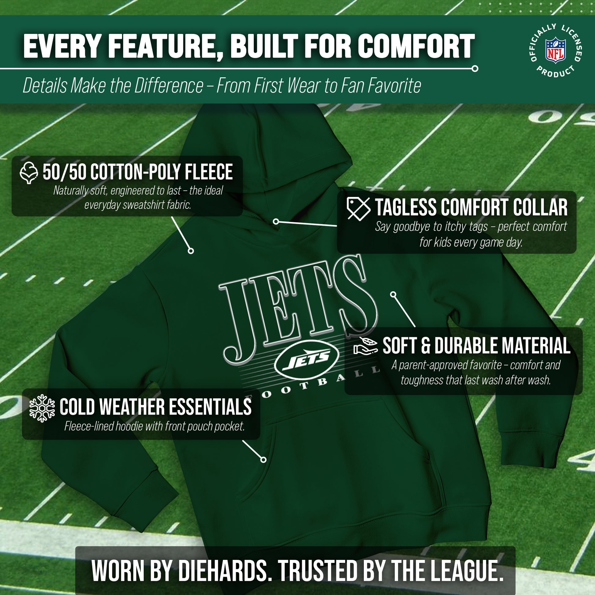Hey there, young sports fans! Get ready to show off your team spirit with the Team Fan Apparel New York Jets Youth Overtime Blueprint Football Fleece Hooded Sweatshirt! This sweatshirt is made from a soft and cozy cotton polyester fleece and is perfect for staying warm on game day or any day. The unisex design makes it suitable for both boys and girls, and its tag-less feature ensures ultimate comfort all day long. Featuring an original outlined design with their vintage logo that proudly displays the team's colors, this youth hoodie will be turning heads everywhere it's worn. The front pouch pocket will keep you warm on those cold game days as you cheer on your Jets! Just pull it on and go! So whether you're at the stadium or hanging out with friends, make sure you're representing your team in style with our NFL youth apparel. Printed and designed in the USA, have confidence your sweatshirt will last! Order now and get your future pro geared up to be the next super fan!