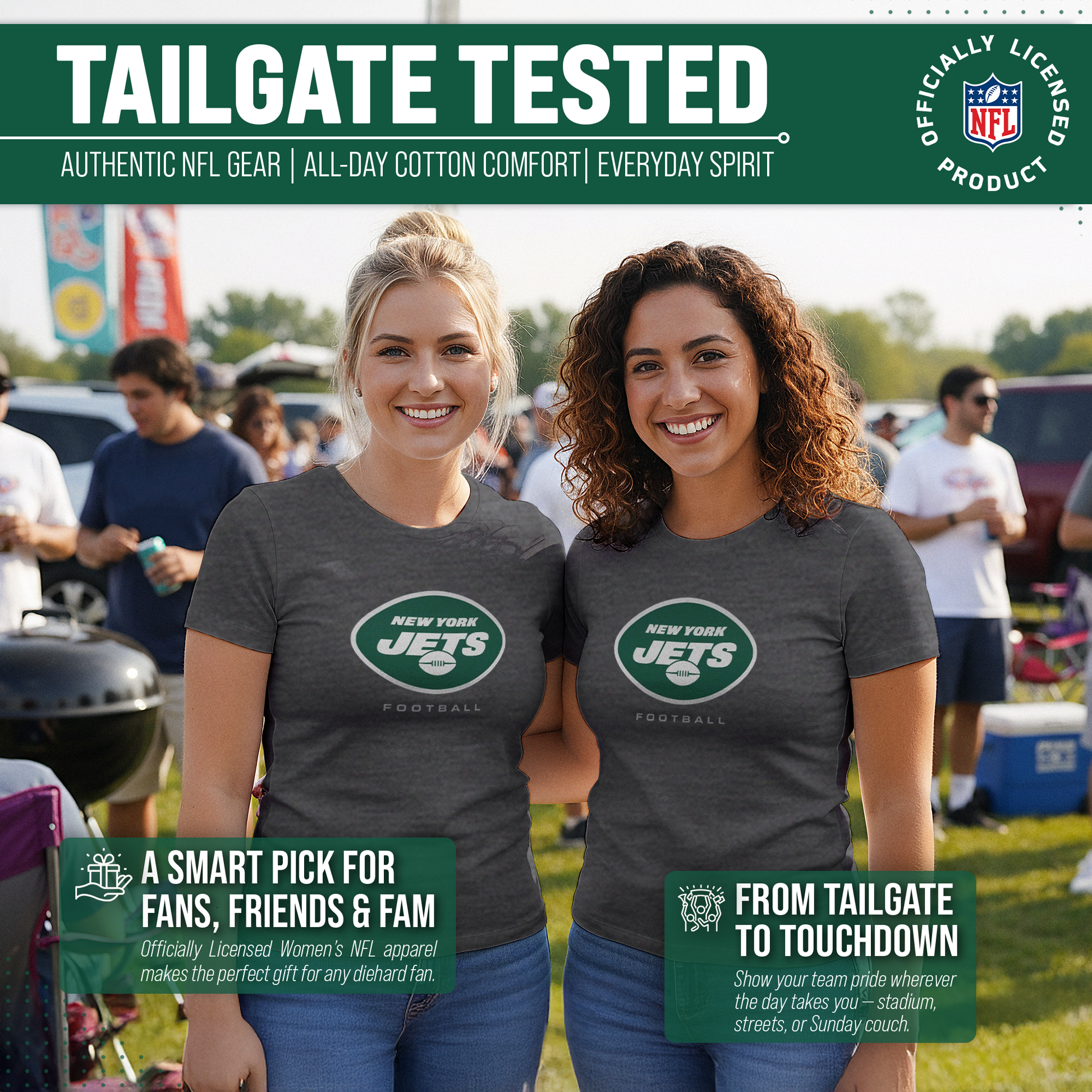 Score with Team Fan Apparel, the ultimate destination for officially licensed NFL apparel for men and women. We use only the highest-quality screen printing techniques to bring you the most comfortable, durable, and stylish clothing possible. Go ahead and show your team pride at the big game or any time! This premium womens t-shirt comes in small, medium, large, XL, and XXL. So needless to say, it fits New York Jets fans of all types! Maybe you aren't a Jets fan but you know someone who is? Don't worry! This high-quality t-shirt is soft, lightweight, breathable, and a GREAT gift for any birthday, anniversary, Mother's day, Valentine's day, or Christmas gift! So, if you want to stand out as the #1 female fan at the next big game or watch party, you're going to want to be wearing one of these New York Jets Women's Big Logo t-shirts.