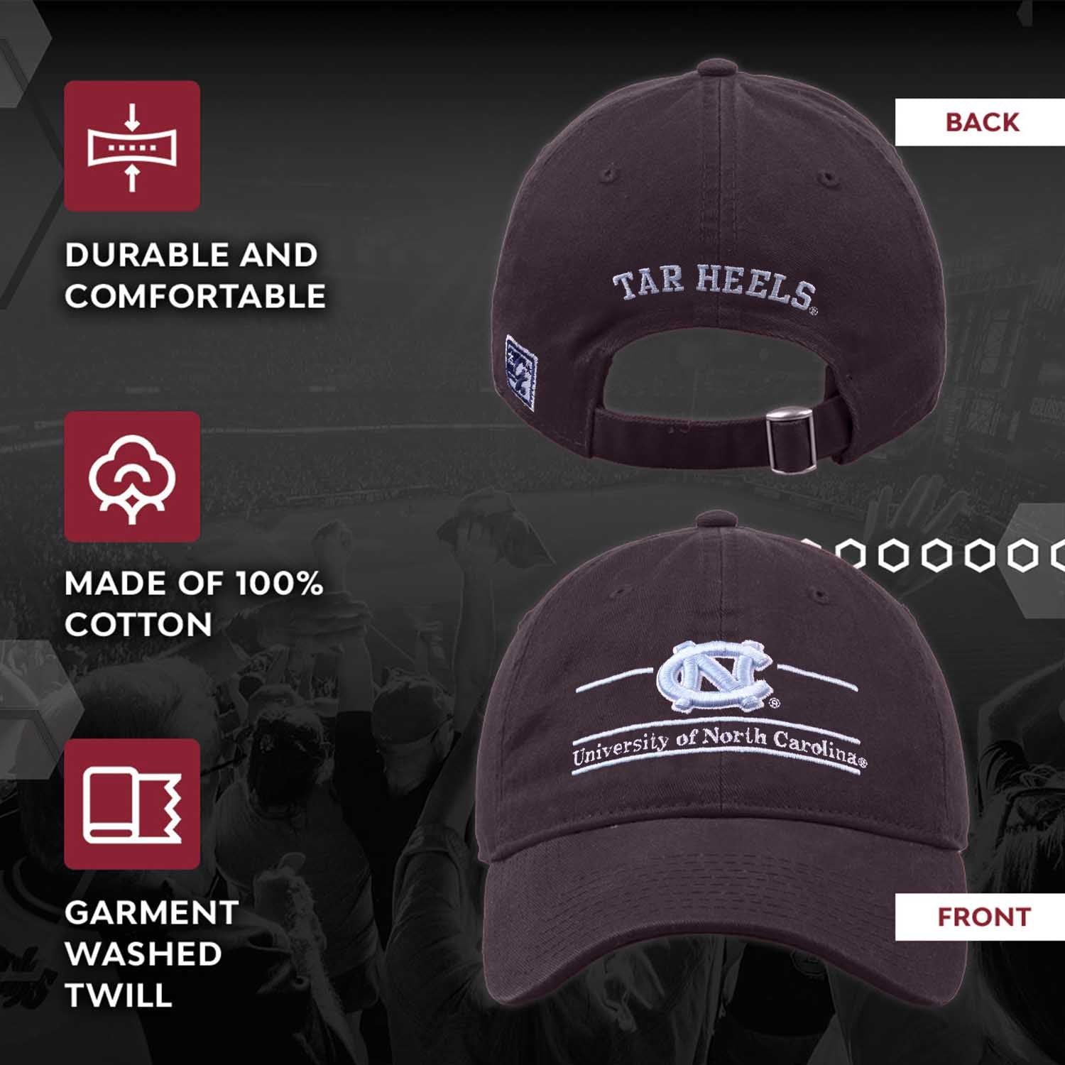 Looking for a way to support your team? Try this North Carolina Tar Heels game bar hat! These North Carolina Tar Heels caps are made from 100% garment-washed cotton twill. This North Carolina hat also features a relaxed and unstructured design, making it a perfect North Carolina Tar Heels fitted Tar Heels hat. It boldly displays the North Carolina Tar Heels embroidered logo so you can represent the North Carolina. In addition, the North Carolina Tar Heels logo with the school wordmark is on the front of the hat in a bar design. The team wordmark is on the back of the Tar Heels baseball cap. This gameday hat has a metal closure to ensure an adjustable size. Wear these caps for women and men along with your favorite North Carolina clothes, clothing & apparel. These ball caps for men and women are the perfect North Carolina Tar Heels gifts for men. Buy one for yourself, your dad, or any fan. Whether tailgating at North Carolina football games or cheering from home, show your team pride by wearing your North Carolina gear with your North Carolina cap.