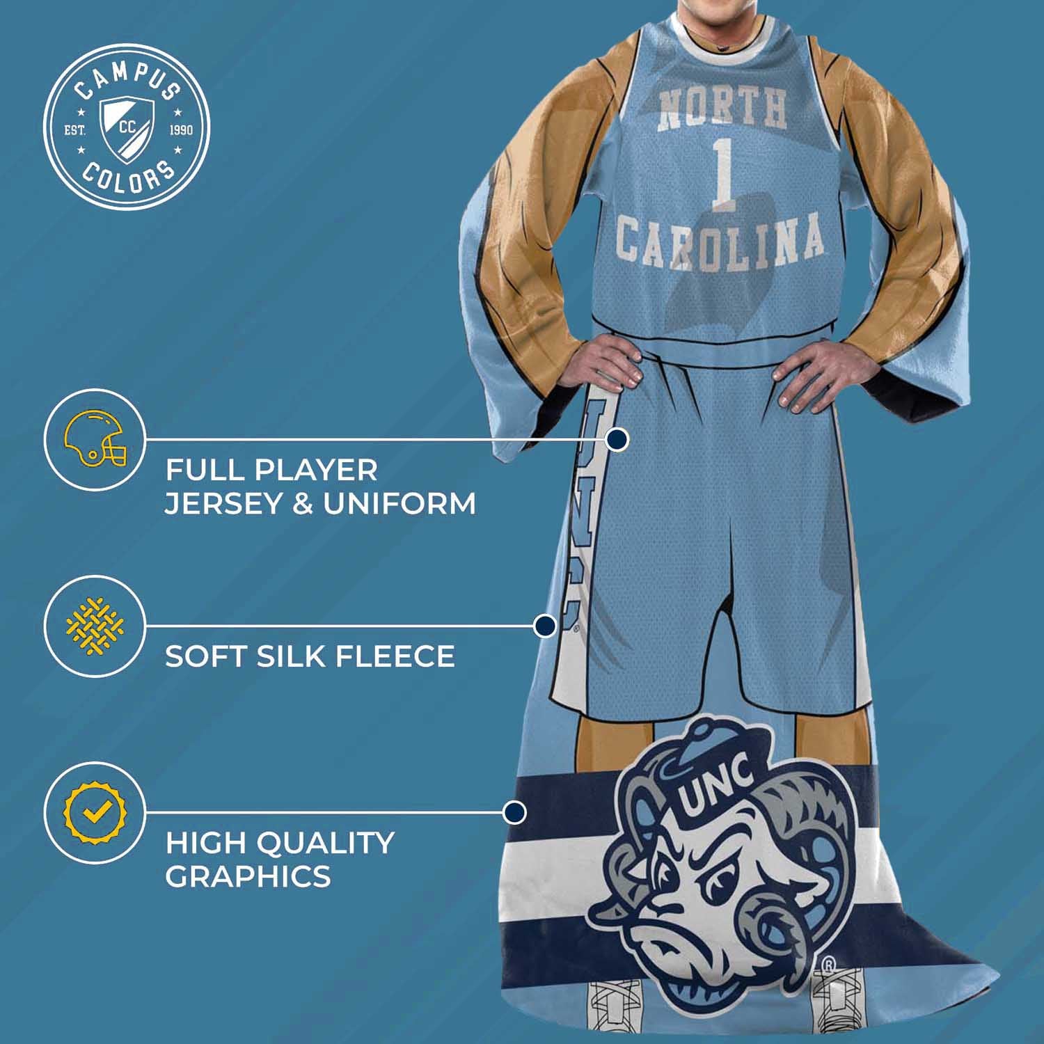 This is the ultimate officially licensed wearable North Carolina Tar Heels fleece throw blanket for sports fans. Our soft blanket comes with sleeves, making it perfect to wear in the stadium, at tailgates, or at home! Wherever you are, watch the big game in our cozy North Carolina blanket with sleeves. This North Carolina blanket features full front coverage to keep you warm, with arm sleeves and an open back for mobility. The fleece blanket features a full North Carolina Tar Heels replica jersey. Use this wearable blanket for adults at football, basketball or any other sporting events to cheer on your favorite college team. North Carolina blankets make great gifts for fans of all ages. These lazy blankets with sleeves are the perfect North Carolina gifts for everyone. This cuddle wrap blanket with arms is ideal for North Carolina fans who go to every game or watch from the couch. North Carolina Tar Heels merchandise makes the perfect gift for anyone who loves following the team! This North Carolina wearable blanket can also keep you warm at home. Use as bedding, a super warm winter blanket, or man cave decor. Our wearable blanket with sleeves gives you full movement while staying warm under the blanket robe. Our wearable blankets and throws are machine washable with cold water. Machine dry this lazy sleeve blanket using the gentle cycle. Our wearable blanket robe is made of 100% polyester fleece material. This cozy blanket with sleeves measures 48"" W x 71"" L.