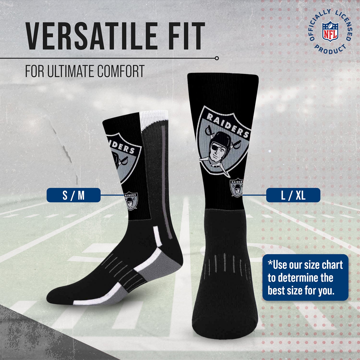 These Oakland Raiders socks for children are great for showing off your Oakland pride from head to toe. The unisex Oakland youth socks are comfortable. The crew length and poly-spandex blend featuring a supportive formed heel make them a comfortable choice for showcasing your love for your team all year long.    Oakland youth socks are great additions to a collection of Oakland Raiders stuff. Wear them with shorts, your favorite jersey, and Oakland Raiders shoes for a superfan look, or rock them in the office for an alternative to argyle on casual friday. On a lazy day, wear them with your underwear or pajamas and Oakland Raiders house shoes while you put your feet up and enjoy a game in the house.    Oakland Raiders youth socks make great birthday gifts for all ages.    The officially-licensed team logo, colors, and graphics make these socks the Oakland socks kid superfans will love. Fabric content is 95% polyester, 2% nylon, 2% rubber, and 1% spandex. Machine washable, tumble dry low.