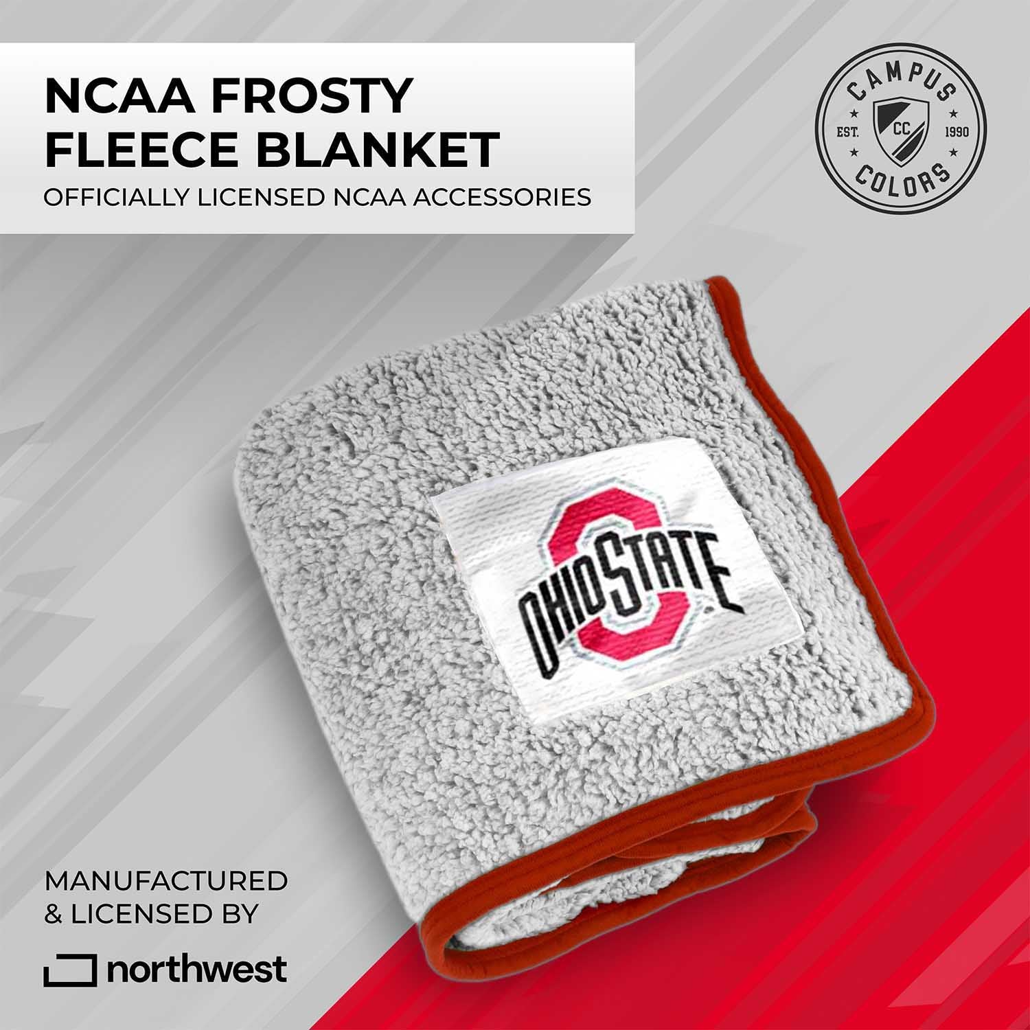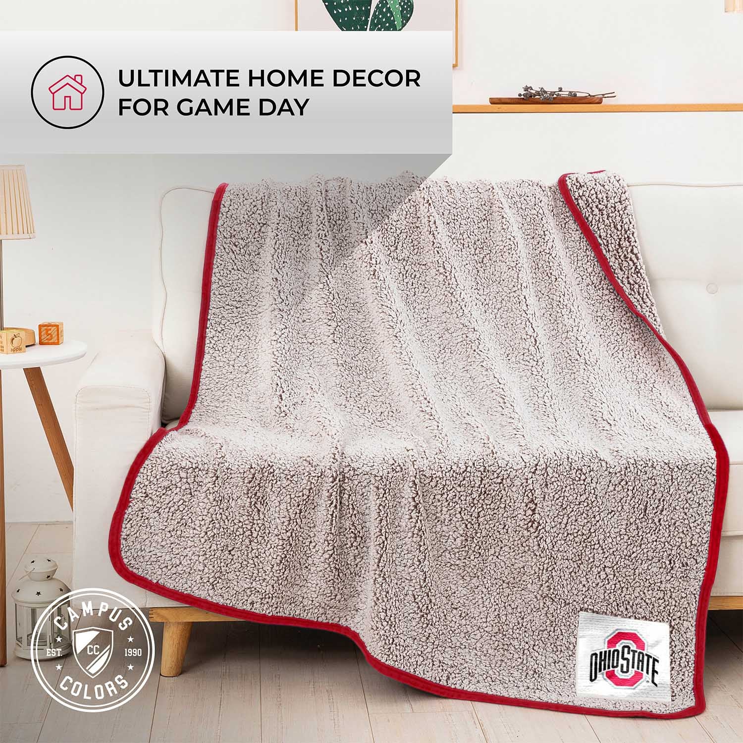 Keep your fandom warm all season long with the super soft and cozy two tone sherpa throw college blanket! Calling all Ohio State Buckeyes fans! The Ohio State Buckeyes sherpa 60"" x 50"" blanket is this season's college accessory that you do not want to miss out on. The two tone frosty blanket features thick team color trim and an official team logo woven patch. Plus, the frosty tipped, high-pile Sherpa material is super cozy and warm. If you're in the market for Ohio State gifts, this blanket is perfect. Each Buckeyes blanket is shipped folded, making it the perfect gift for college students, university alum, and college sports fans. The Ohio State Buckeyes blanket is great gift for birthdays, Christmas, and other holidays. Whether you are sitting in the stands of a Ohio State football or baseball game, watching from home, you can stay warm and display your fandom wherever you take your sherpa blanket! The high-pile sherpa material will keep you warm and cozy all winter and fall. This super soft blanket is lightweight and perfect to bring to tailgates or into the big game. This cozy blanket is also perfect for cuddling up at home; keep it in the living room, on a college couch bed, or on a cozy chair in a college-themed den full of Ohio State room decorations. It's a great blanket to use as bedding or a comforter in a college dorm or apartment. The fluffy material makes it great for putting on a college bed.