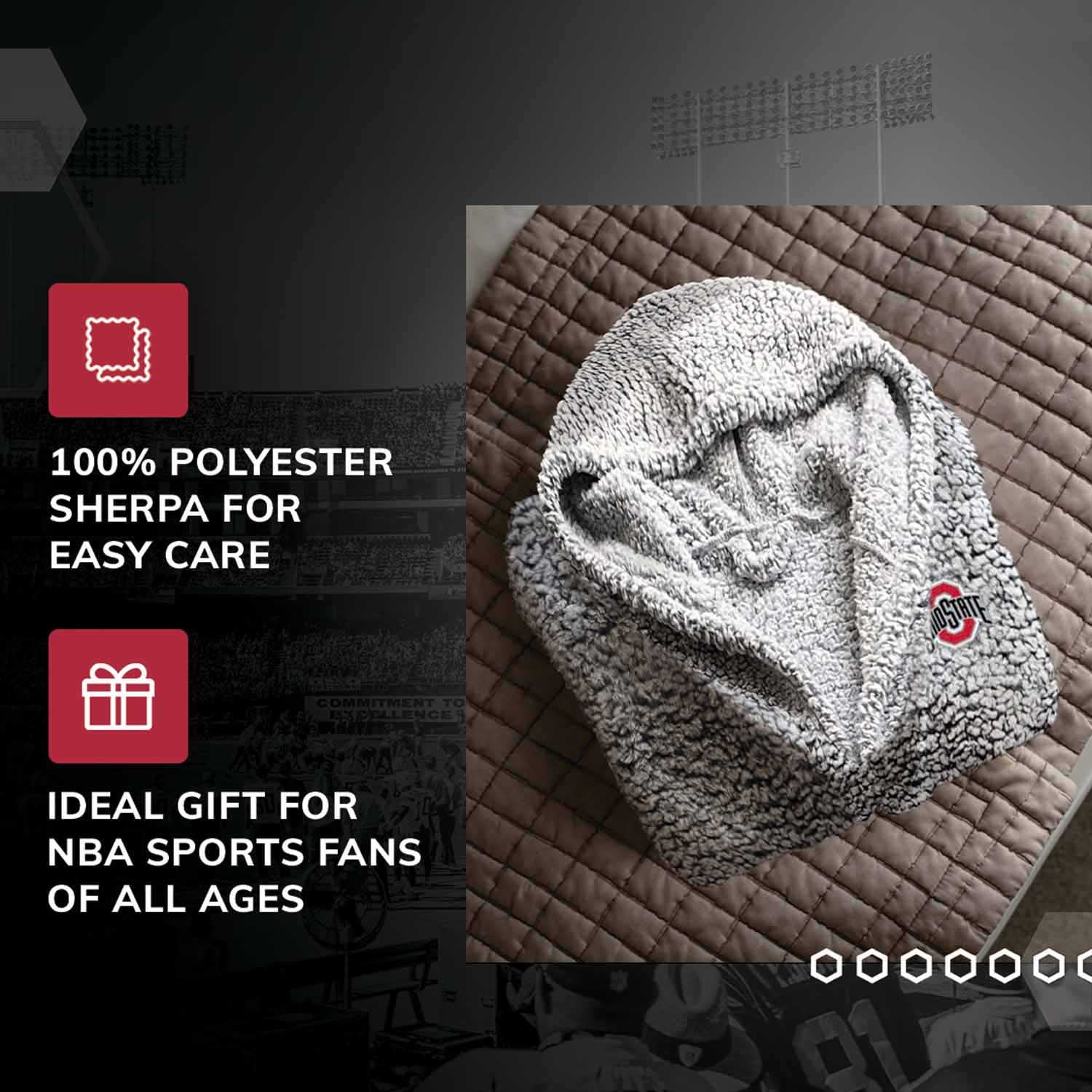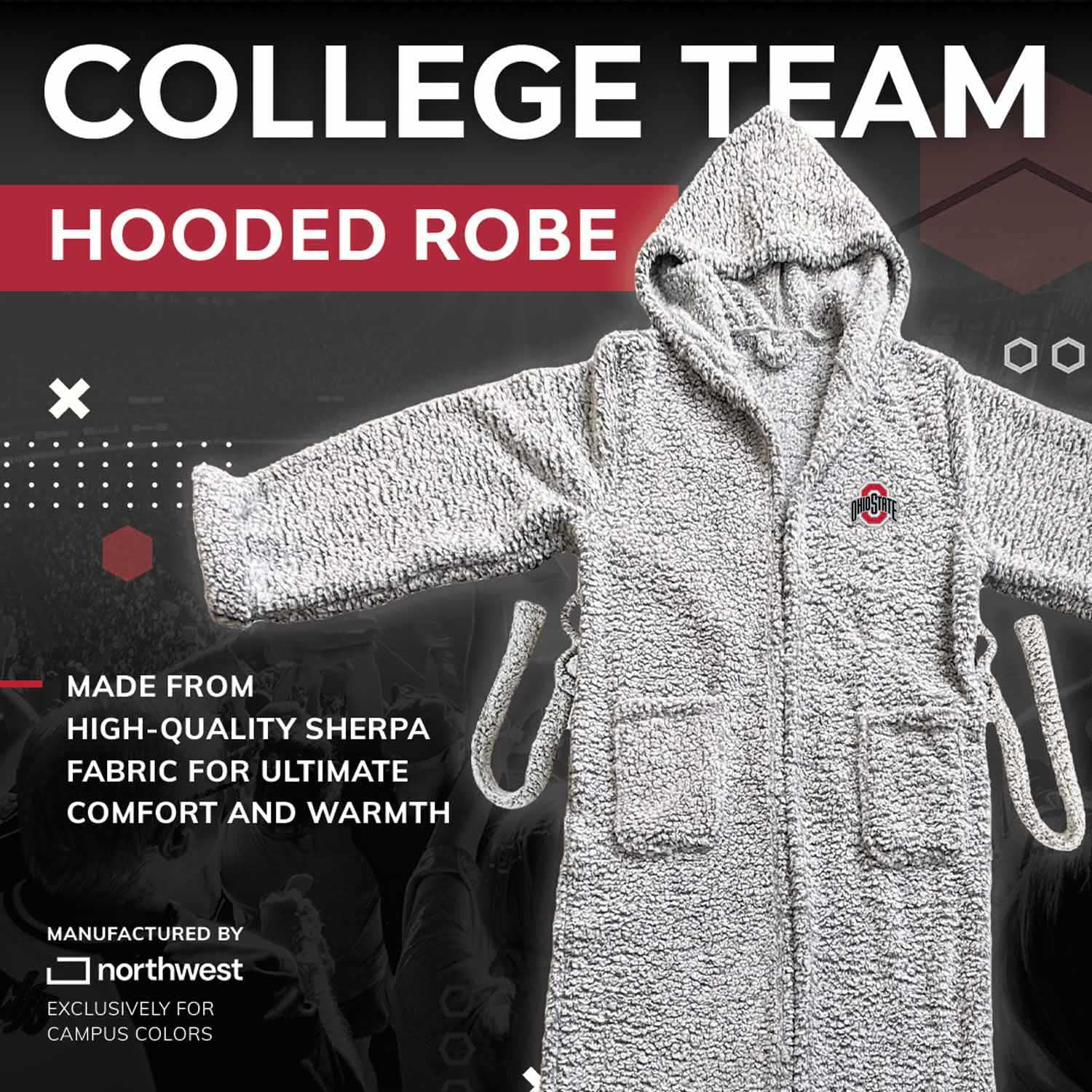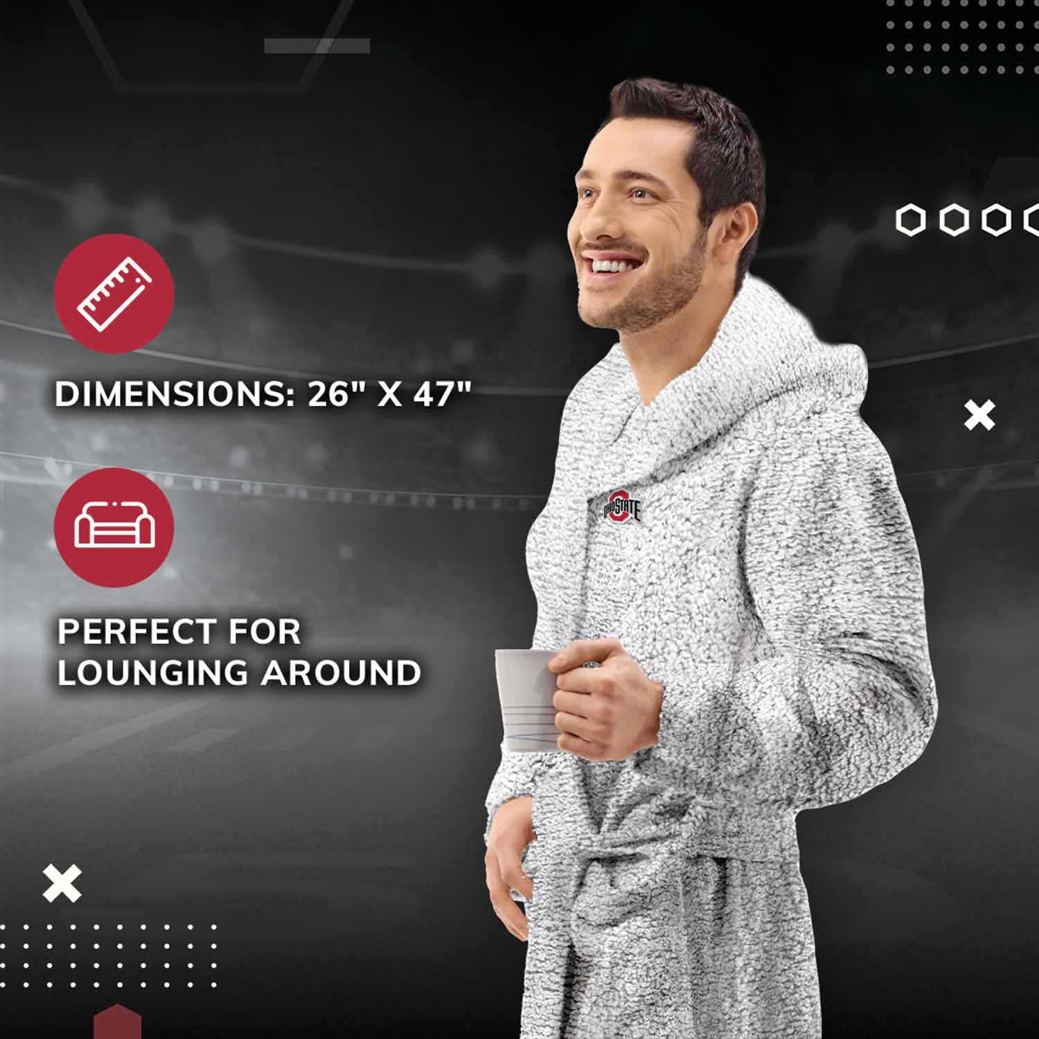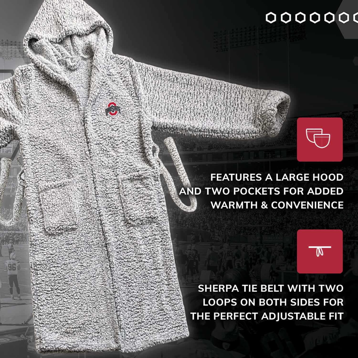 Show off your team pride with this officially licensed Ohio State Buckeyes sherpa robe with hood and mens shower robe. This Ohio State Buckeyes robe is soft, warm, and comfortable. Wear as an accessory to mens sleepware. It's unisex and fits both men and women. This officially licensed Ohio State Buckeyes merchandise features the school name embroidered on the left chest area, helping you keep your head comfortable no matter where you go, while the two pockets allow you to store small accessories or other personal items. With its durable construction and tie belt with two belt loops on both sides, this cozy robe will keep you warm at home or out and about. It's the perfect robe with hood for women and the best bath robe for men.