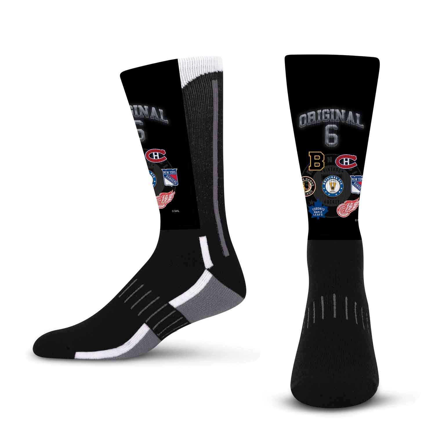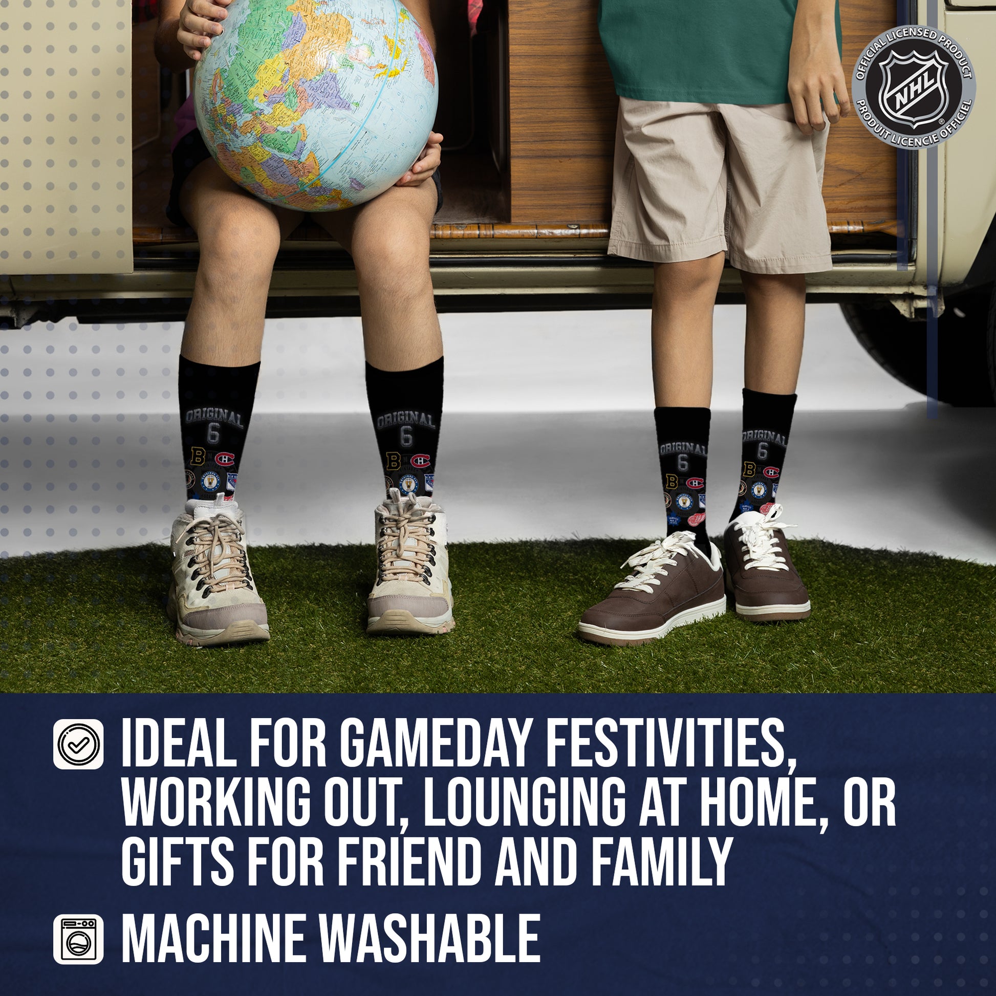 These Original 6 crew socks for children are great for showing off your hockey pride from head to toe. The unisex socks are comfortable and are available in a one-size-fits most youth size for the perfect fit. The crew length and poly-spandex blend featuring a supportive formed heel make them a comfortable choice for showcasing your love for your team all year long.    Our youth crew socks are great additions to a collection of other hockey apparel. Wear them with shorts, your favorite jersey, and shoes for a superfan look, or rock them to school to show off your fandom. On a lazy day, wear them with your pajamas and house shoes while you put your feet up and enjoy a game from the couch!       The officially licensed team logo, colors, and graphics make these socks the gift that superfans will love. Fabric content is 95% polyester, 2% nylon, 2% rubber, and 1% spandex. Machine washable, tumble dry low.
