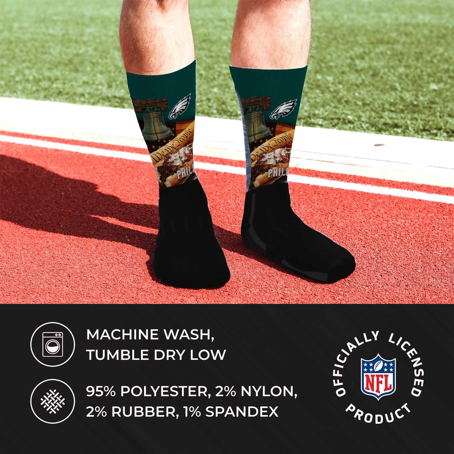 These Philadelphia Eagles location socks for men and women are great for showing off your Eagles pride from head to toe. The unisex Philadelphia socks are comfortable, and come in medium and large. The crew length and poly-spandex blend featuring a supportive formed heel make them a comfortable choice for showcasing your love for your team all year long. Location socks are a great addition to a collection of Philadelphia Eagles stuff. Wear them with shorts, your favorite jersey, and Philadelphia Eagles shoes for a superfan look, or rock them in the office for an alternative to argyle on themed school spirit days. On a lazy day, wear them with yourpajamas and Philadelphia Eagles house shoes while you put your feet up and enjoy a game from home Philadelphia Eagles crew socks make great gifts for all ages, and make the perfect birthday or holiday gift for any Eagles fan The officially-licensed team logo, colors, and graphics make these socks the Philadelphia socks that superfans will love. Fabric content is 95% polyester, 2% nylon, 2% rubber, and 1% spandex. Machine washable, tumble dry low.