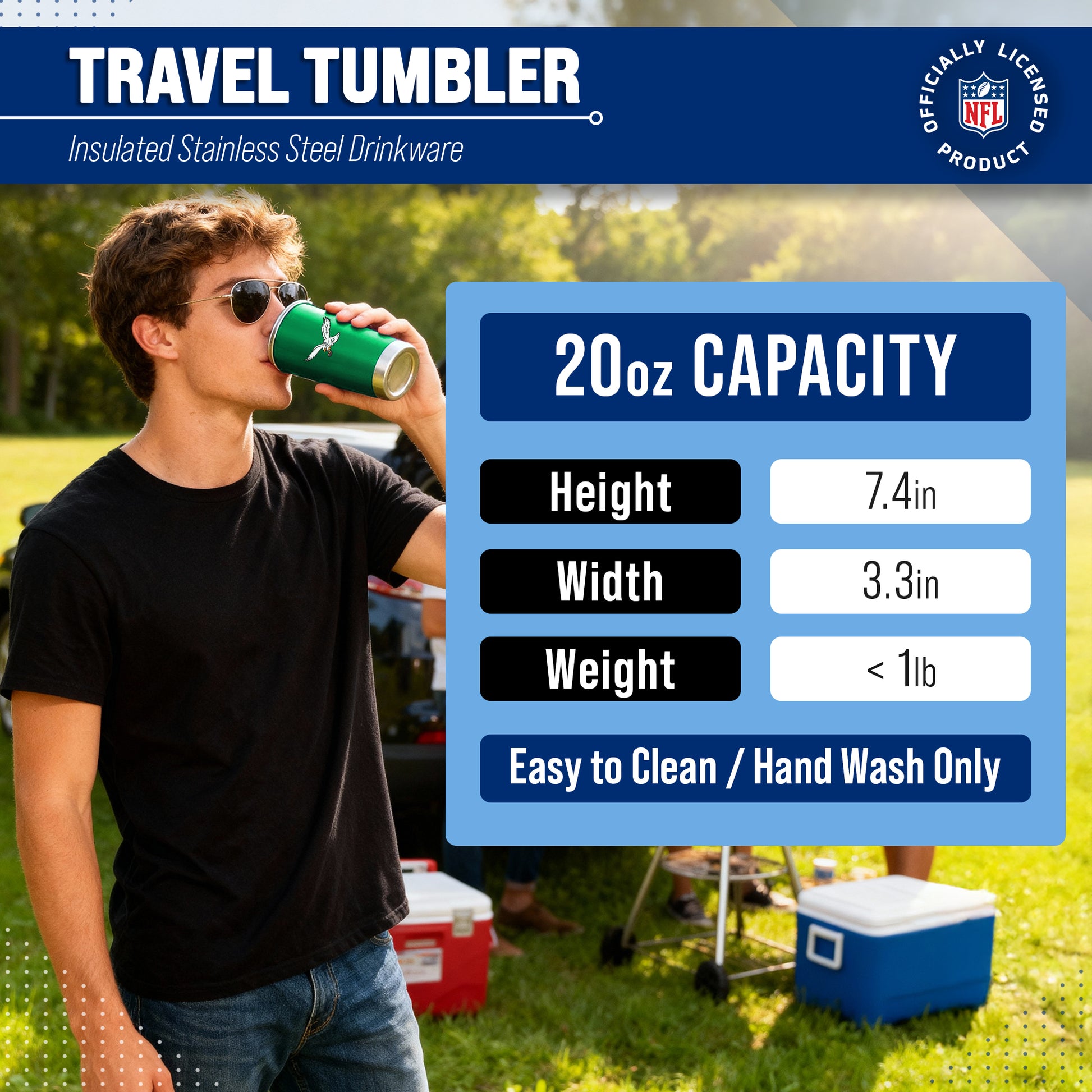 Get ready to cheer on the Philadelphia Eagles with the NFL 20oz Gameday Stainless Steel Tumbler!  This versatile Eagles tumbler is perfect for both hot and cold drinks, making it a must-have for game days, road trips, or just everyday use. The sleek stainless steel design features your team's logo, making it a great gift for any Philadelphia Eagles fan - men and women alike! With a slider lid and slightly tapered silhouette, you can easily sip on your coffee, water or cocktails while showing off your Philadelphia Eagles team spirit.  But this tumbler isn't just stylish - it's also functional. The insulated design keeps your drinks at the perfect temperature, whether you're tailgating in the chilly fall weather or enjoying a refreshing drink in the summer sun. And with a generous capacity of 20oz, you'll have plenty to share with friends and family.  So grab your NFL 20oz Gameday Stainless Steel Philadelphia Eagles Tumbler and show off your love for the game wherever you go!
