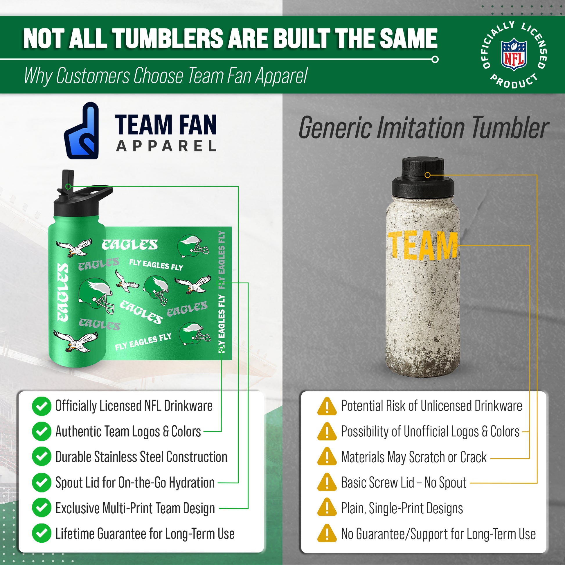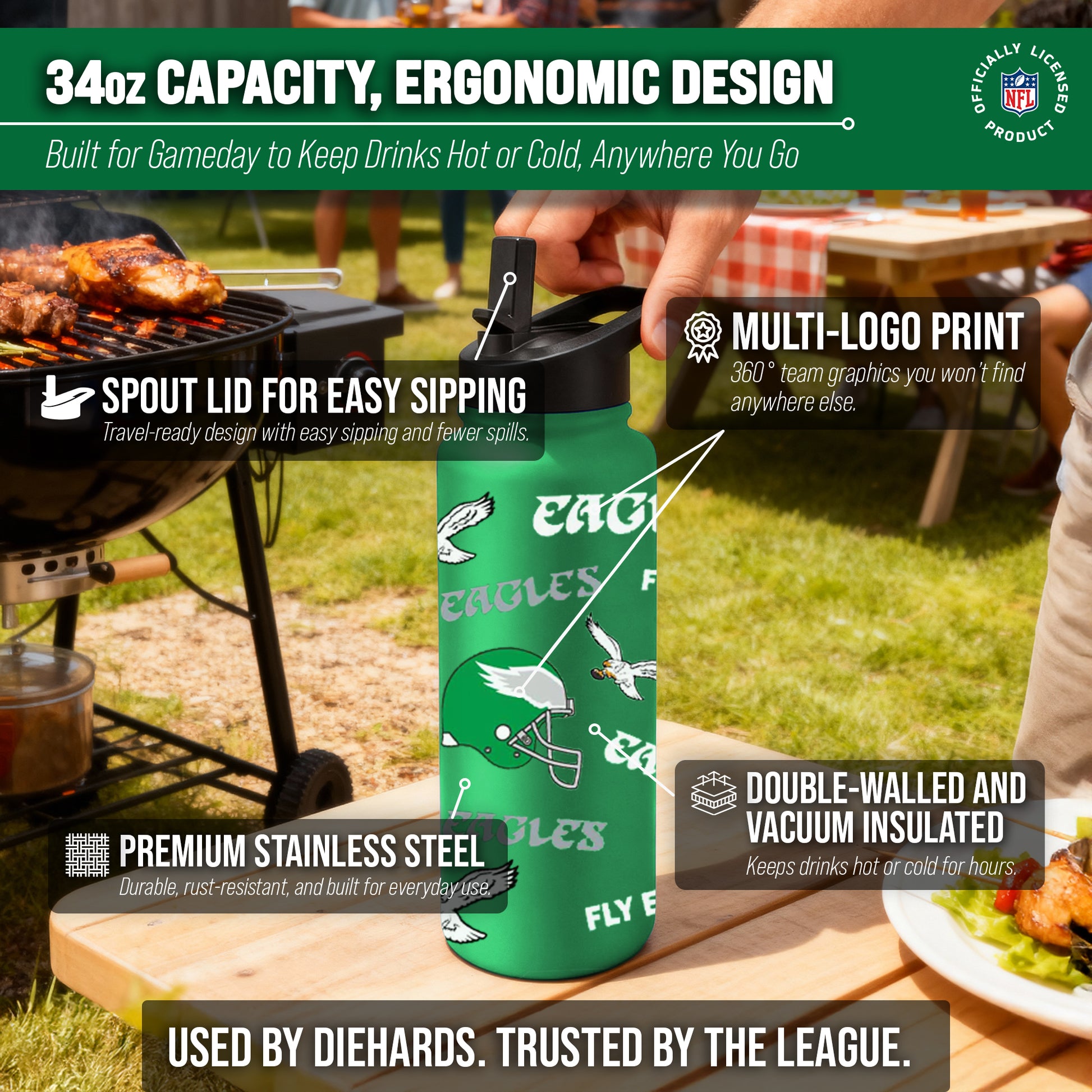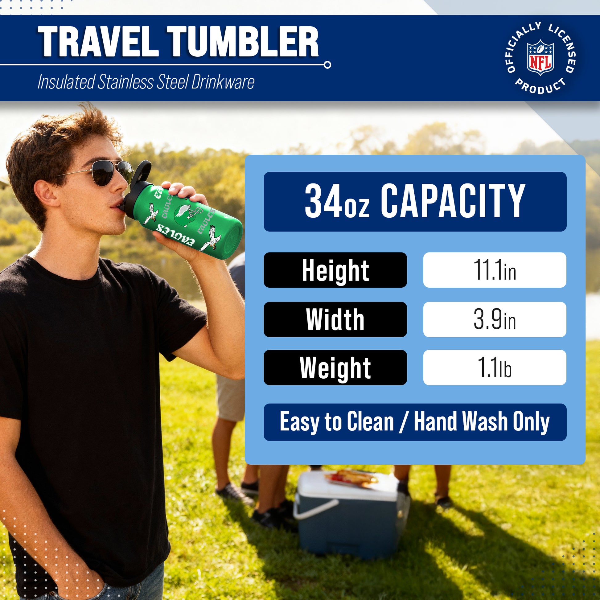 Keep Your Philadelphia Eagles Team Spirit and Drinks Handy On-the-Go with the NFL Native Quencher Water Bottle!  Whether you're heading to the gym or tailgating at the game, this 34oz Eagles water bottle is the perfect companion for any fan. Made from durable stainless steel, it's designed to keep your drinks hot or cold for hours. The no-leak dual option lid allows you to sip through a straw or drink straight from the spout.  But it's not just for water! This versatile bottle can also hold your favorite coffee, tea, & more. With its insulated design, your beverages will stay at their desired temperature until you're ready for them.  Featuring your team's logo & colors, this water bottle proudly displays your loyalty while keeping you hydrated. And when it's time for a refill, simply take off the lid and fill up again. Cheers to staying hydrated in style with the Philadelphia Eagles Water Bottle! Hand wash only! Great for yourself or any fan in your life, especially for on-the-go and travel!