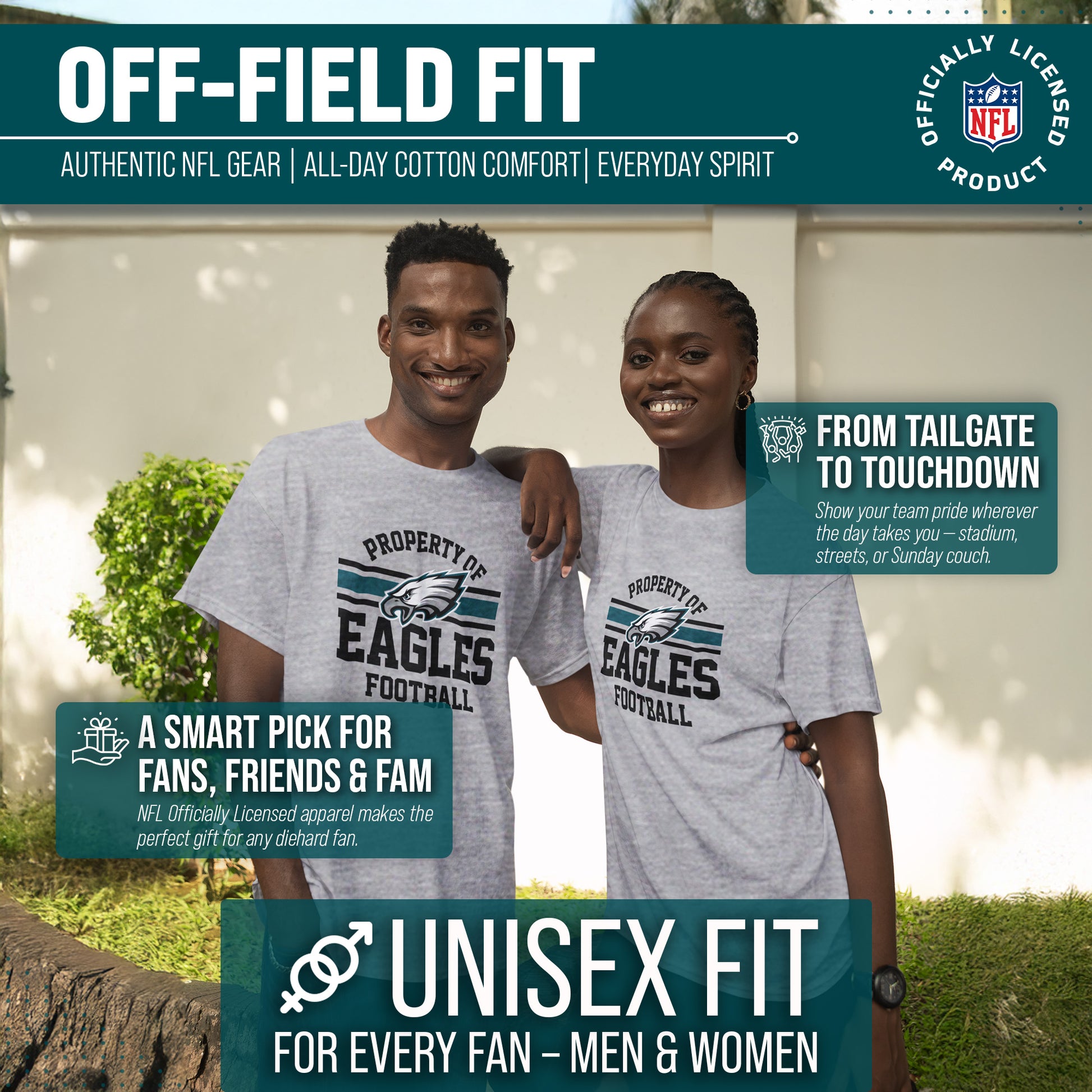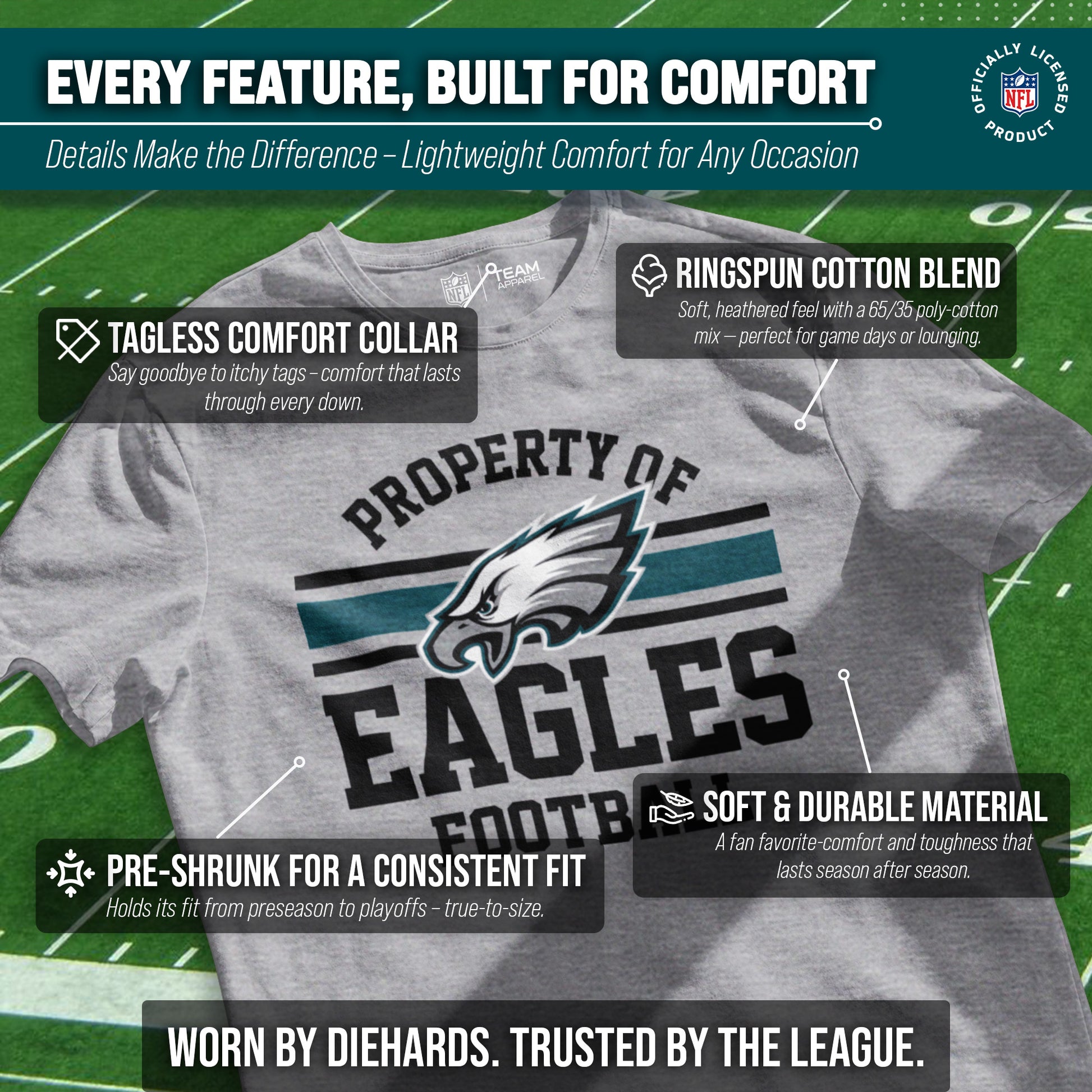 This Property of Philadelphia Eagles tshirt is made from 50% ringspun cotton and 50% polyester. Our soft Eagles tshirt is beyond comfortable and light enough to keep you cool on gameday. This and soft enough that you'll want to wear it every day. Tagless pro football t-shirt ensures comfortability and avoids neck irritation. This tee is perfect for sensitive skin. The soft material of this short sleeve shirt is skin-friendly and adjusts according to your body shape; heather, dual blend material leaves a trendy look without that irritating, heavy printed feel. This pro football tee features official Property of graphics. Our tshirts are designed and printed in the USA. These high quality shirts are made with stitch density for smoother printing surface. This Property of Philadelphia shirt gives the look only a true fan can accomplish. This is essential apparel for any football or sports fan. Our graphic shirts for men and women will make you stand out on gameday. This lightweight t-shirt is perfect for watching the game, working out, or for a fathers day gifts. It's perfect for Philadelphia football games. This shot sleeve tee is a great addition to any superfan's wardrobe. Our pro football short sleeve shirts offer a unisex fit that is ideal for both men and women. This Property of Philadelphia tshirt is perfect for tailgates parties, big games, or when you just want to show off your team spirit. These festive Property of Program shirts are the ideal Eagles gifts for men and women pro football teams.