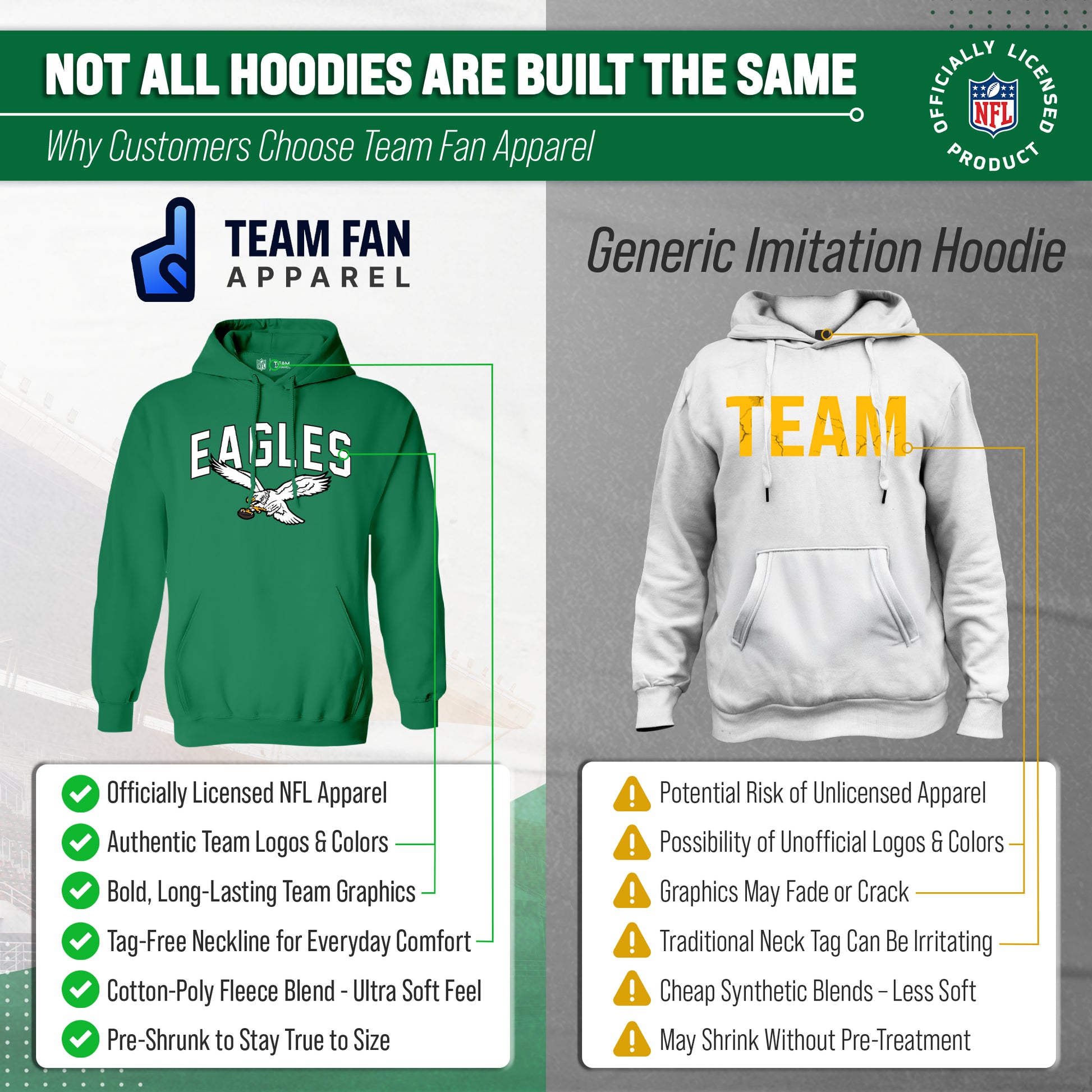 If you are looking for the ideal Eagles hoodie to wear with your sports outfit on game day, the Eagles Home Team Hood is perfect for you! This Eagles hoodie is great for showing team pride all year long. This is an essential piece of womens and mens football apparel for pro football fans. Our Philadelphia Eagles team-colored hoodies are the perfect fan apparel for Philadelphia Eagles tailgate outfits and sports games. This Philadelphia Eagles hooded pullover with a pocket and drawstrings is ideal for warm or cold weather. The football pullover hoodie is made from a cotton poly blend fleece material with cotton face. Our Eagles hoodies also make the best Eagles gifts for men and women. If you are looking for the best Eagles gifts for women,  Eagles shirts, Eagles hoodies, or Eagles winter clothes, look no further than the Team Home Hood. Get yours today!