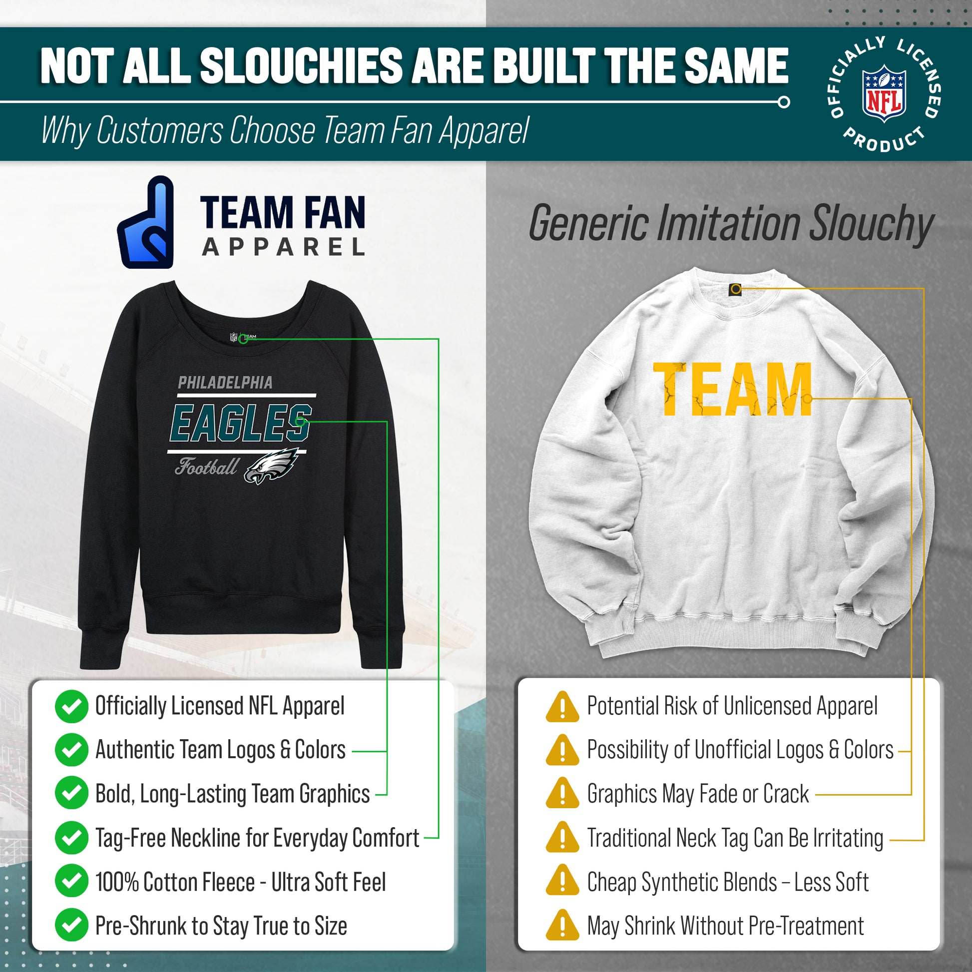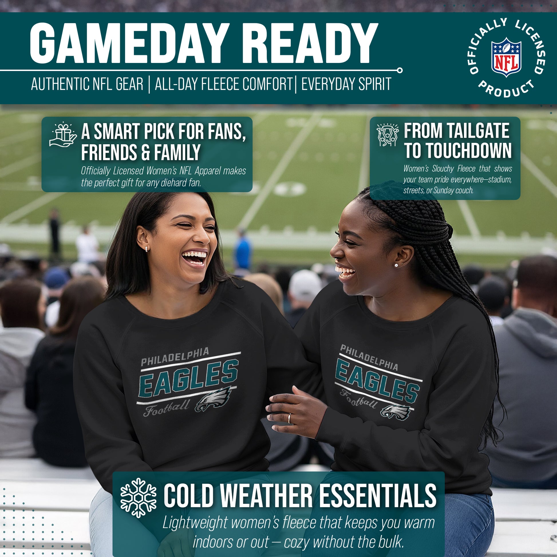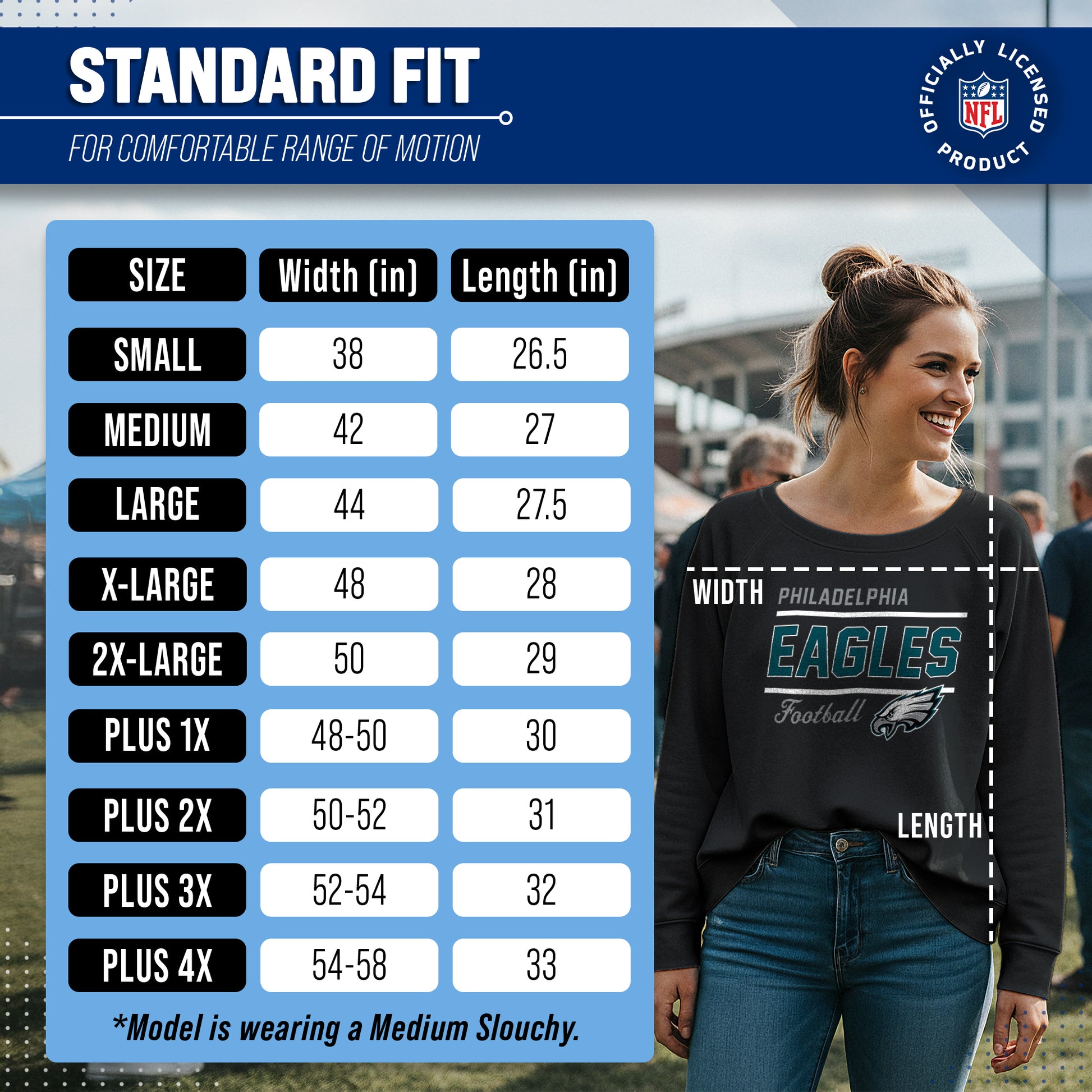 Our officially licensed Philadelphia Eagles long sleeve crew neck pullover is super comfortable, runs true to size, and is great for showing off your Eagles pride.     The high-quality thermal printed logo will look fresh after years of wear, making it a great alternative to wearing a Philadelphia Eagles womens jersey. Our womens long sleeve Gameday crewneck has a relaxed fit for a casual, comfortable look. The long sleeve Eagles crew will look great with shorts at tailgates in warmer months, or with jeans or leggings when it gets cooler. Layer it with a hoodie or even a Philadelphia football jersey when the weather gets cold. Available in plus sizes up to 3XW, this is a Philadelphia Eagles pullover that women who are plus size or straight size will feel comfortable in.       If you're looking to give the gift of ladies Eagles apparel, our long sleeved Philadelphia Eagles Slouchy Crew is the perfect gift. Officially licensed to ensure no counterfeit designs or colors, these Philadelphia crews for women are perfect for super fans. Made from a cotton poly blend to keep you comfortable, the womens raglan long sleeve Gameday Slouchy Crew will definitely become one of your favorite pieces of Philadelphia Eagles apparel.