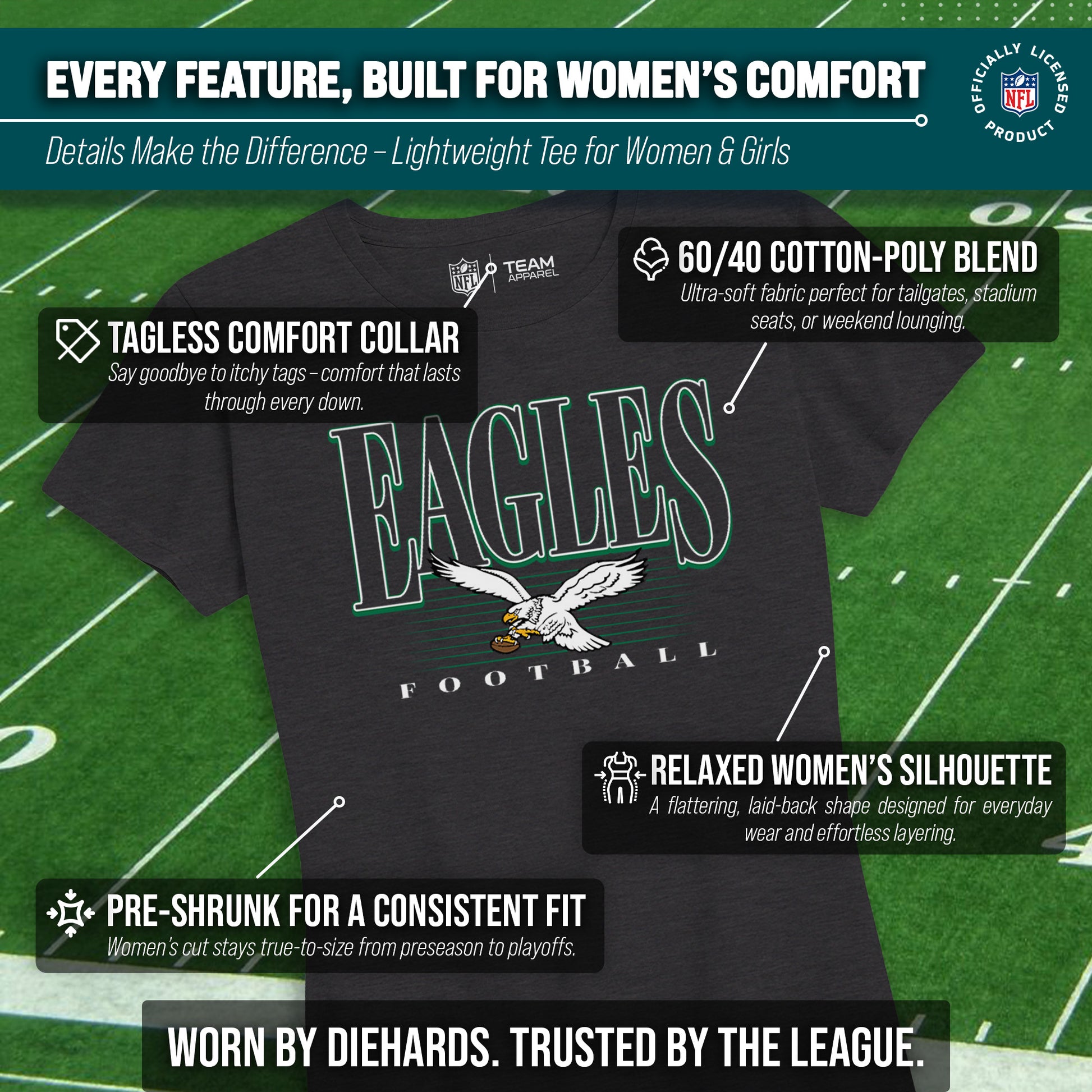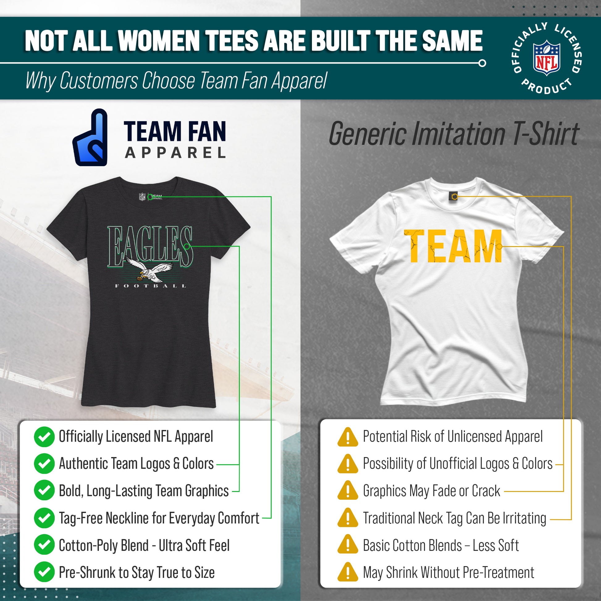 Calling all ladies! Get ready to rock game day with the Women's Team Fan Apparel Overtime Blueprint T-Shirt! This comfortable and stylish Philadelphia Eagles womens tee is perfect for any female football fan, whether you're cheering on your favorite team at the stadium or watching from home. Made from a super soft cotton fabric , this shirt will keep you cool and comfortable all game long. The text, logo and official team color adds a touch of retro flair, while the tag-less design ensures itch-free wear. Whether you're a die-hard fan or just love a good classic look, this shirt is perfect for showing off your team spirit. Available in a wide range of women's sizes, it's suitable for all shapes and sizes! So grab your girlfriends and get ready to cheer on your team in style with the Women's Team Fan Apparel Overtime Blueprint T-Shirt!