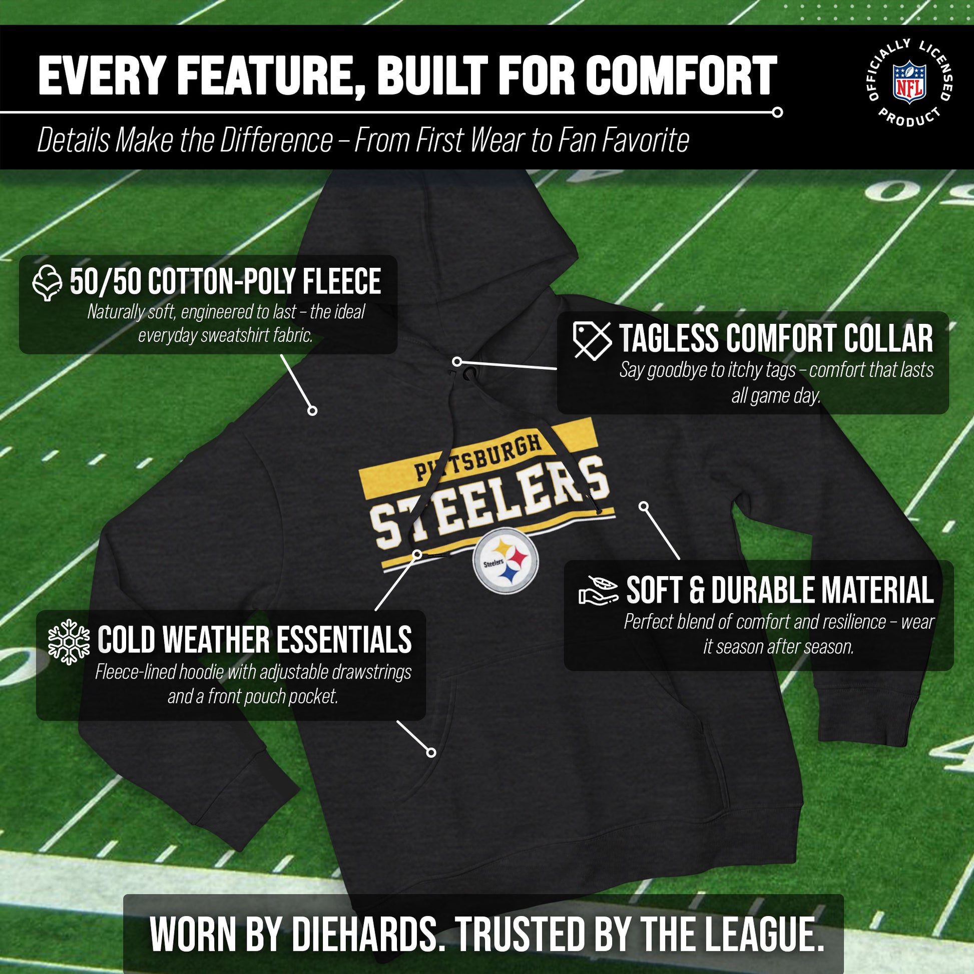 Our Charcoal Gameday Hooded Sweatshirt is a Pittsburgh sweatshirt with a warm and toasty 9 oz fleece lining. It's the very best of Pittsburgh Steelers apparel, plain and simple. Gear up for your cold weather football game with confidence. Or, for women, bring it with you to games and tie it around your leggings in case the arena is a little chilly. Our football hoodie sweatshirts for men and women are super comfortable, run true to size, and are great for showing your team pride all year long. Plus, the unisex fit is ideal for both men and women and works as an oversized sweatshirt for kids. Pittsburgh Steelers sweater for men and women features your teams thermal-printed logo wordmark will stay crisp and clear, wear after wear. All colors and fonts are officially licensed and are of the highest of quality, it even comes with an officially licensed tag. Comes with an officially licensed tag; ribbed cuffs and waistband, double layer hood with drawstrings, spacious front pouch pocket. This football sweatshirt in particular is perfect for tailgates, games, and showing off your team spirit. Gameday hooded [team_ long] sweatshirts make a great birthday, Christmas (or any other holiday), or graduation gift for a sports fan. Gameday charcoal hood is essential apparel for protecting yourself and your loved ones from the elements. The fleece material will keep you warm through the colder months, and the no-zip design allows you to pullover and feel embraced like a big oversized blanket. The Pittsburgh Steelers charcoal crew necks are pre-shrunk and are made from a dual blend of 50% cotton and 50% polyester that is ideal for that tailgate or game day when the temperature drops. Pair with your other favorite Pittsburgh game day apparel! Say goodbye to cheap sweatshirts. Our charcoal sweatshirts for women and men help you gear up and get ready to cheer your team to victory.