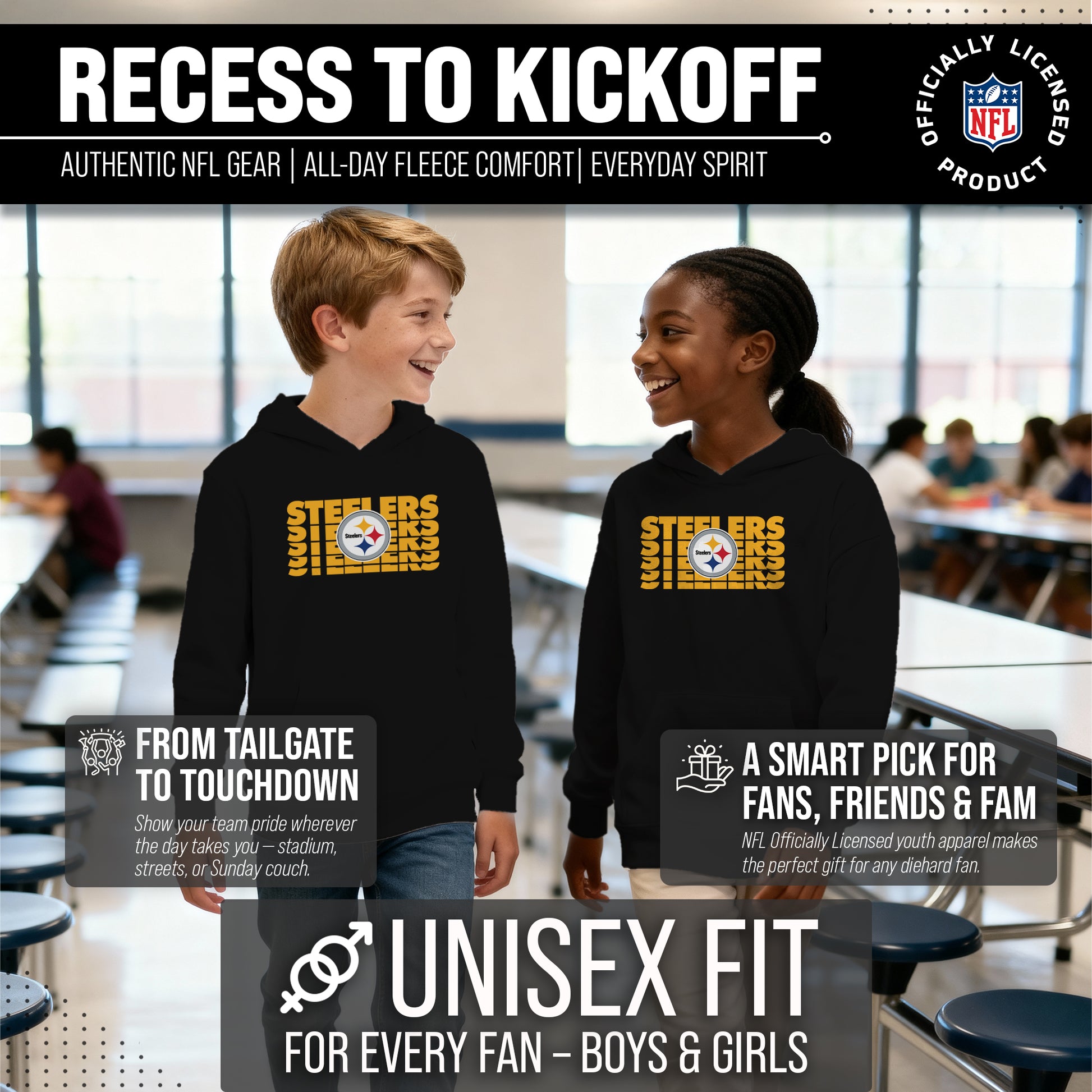 Hey there, young sports fans! Get ready to show off your team spirit with the Team Fan Apparel Pittsburgh Steelers Youth Repeating Logo Football Fleece Hooded Sweatshirt! Made from a soft and cozy cotton polyester fleece, this sweatshirt is perfect for staying warm on game day or any day. The unisex design makes it suitable for both boys and girls, and its tag-less feature ensures ultimate comfort all day long. Featuring an original repeating logo design that proudly displays your team's colors and logos, this youth hoodie will be turning heads everywhere it's worn. The front pouch pocket will keep you warm on those cold game days as you cheer on your Steelers! Just pull it on and go! So whether you're at the stadium or hanging out with friends, make sure you're representing your team in style with our NFL youth apparel. Printed and designed in the USA, have confidence your sweatshirt will last! Order now and get your future pro geared up to be the next super fan!