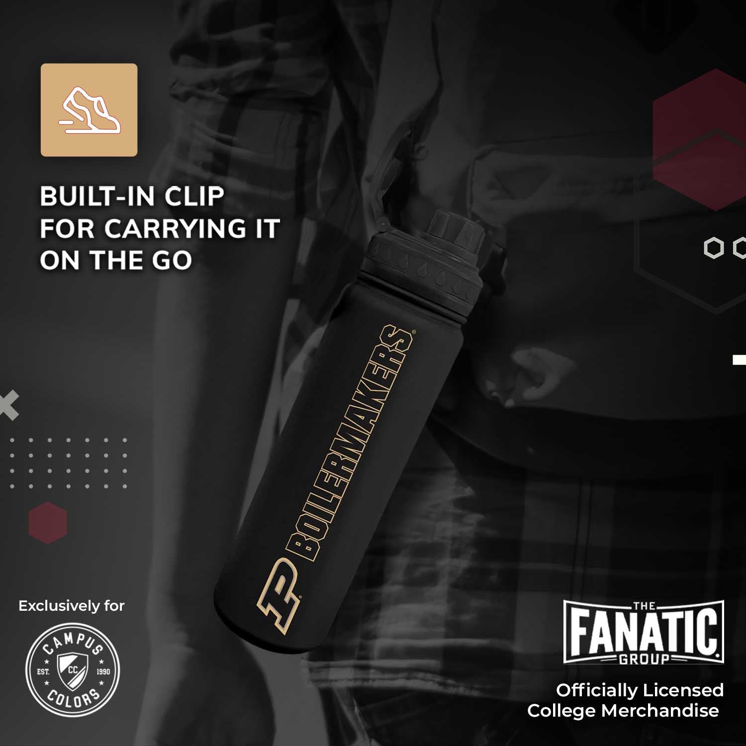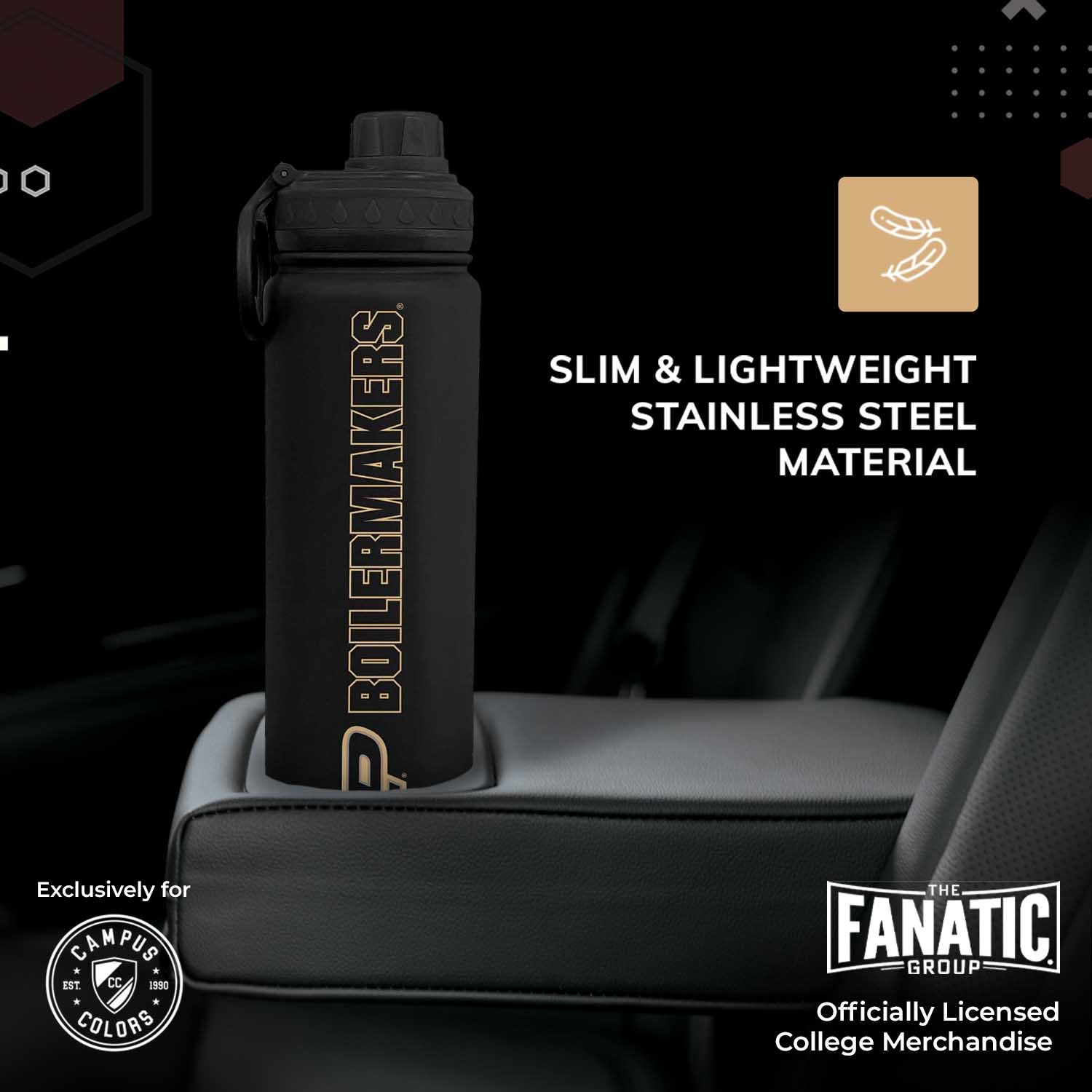 This officially licensed 24oz Purdue water bottle is the best accessory for any Purdue Boilermakers fan. You can use this water bottle 24 oz for water, sports drink, or even to keep your coffee hot. Our vacuum sealed sport bottle ensures that your drinks stay hot or cold for hours. You can bring this bottle along to sport games, hikes, or tailgates on game day. This sport water bottle 24 oz is a slim bottle that fits in most car cup holders for convenience. This stainless sports water bottle features an easy flow spout for the best drinking experience. The twist on cap features an easy drinking spout to make sipping a breeze. The bottle's lid twists on and off to reveal an easy drinking mouthpiece. The convenience of our double walled water bottles make them perfect for sports and everyday life! Show off your school spirit with this Purdue Boilermakers water bottle. This durable stainless sports water bottle make the perfect Purdue Boilermakers accessories for any activity. Our water bottle with clip for backpack is perfect for student campus life and busy alumni activities. Our vacuum sealed water bottles feature a built in handle. The easy grab bottle allows you to sip your water without spilling it on yourself while playing sports or walking to class. The college water bottle is coated in silicone for added grip and softer finish, and the exterior is sweat free so the Purdue water bottle won't drip on you. This insulated water bottle is the perfect birthday or Christmas gift for fans who love to collect Purdue stuff. Pair with other Purdue novelties or apparel for the ultimate Boilermakers gift for women and men. Purdue gear is great as birthday gifts for college students, alumni, and sport fans. With our Purdue Boilermakers water bottle, fans can show team pride and stay hydrated all day and every day!