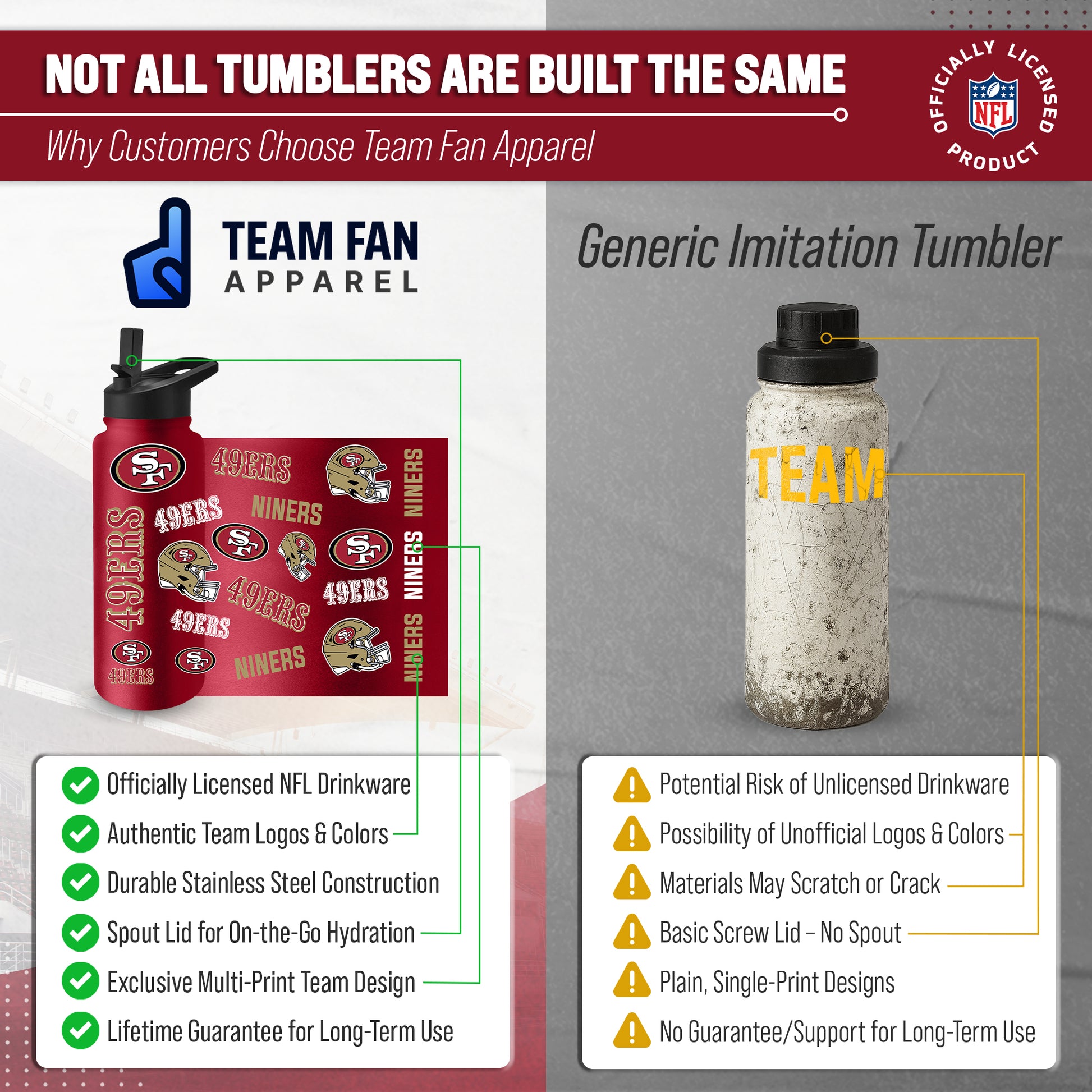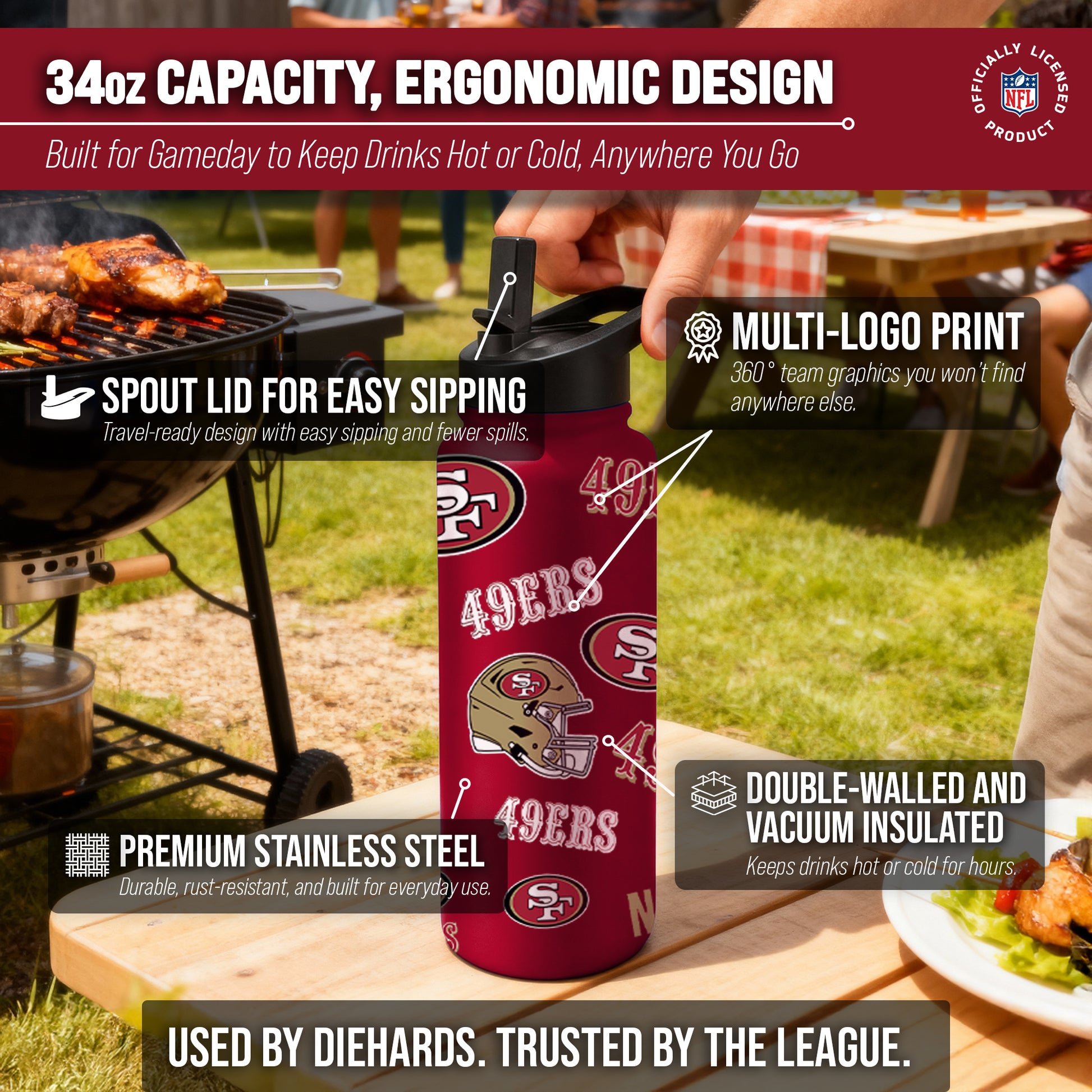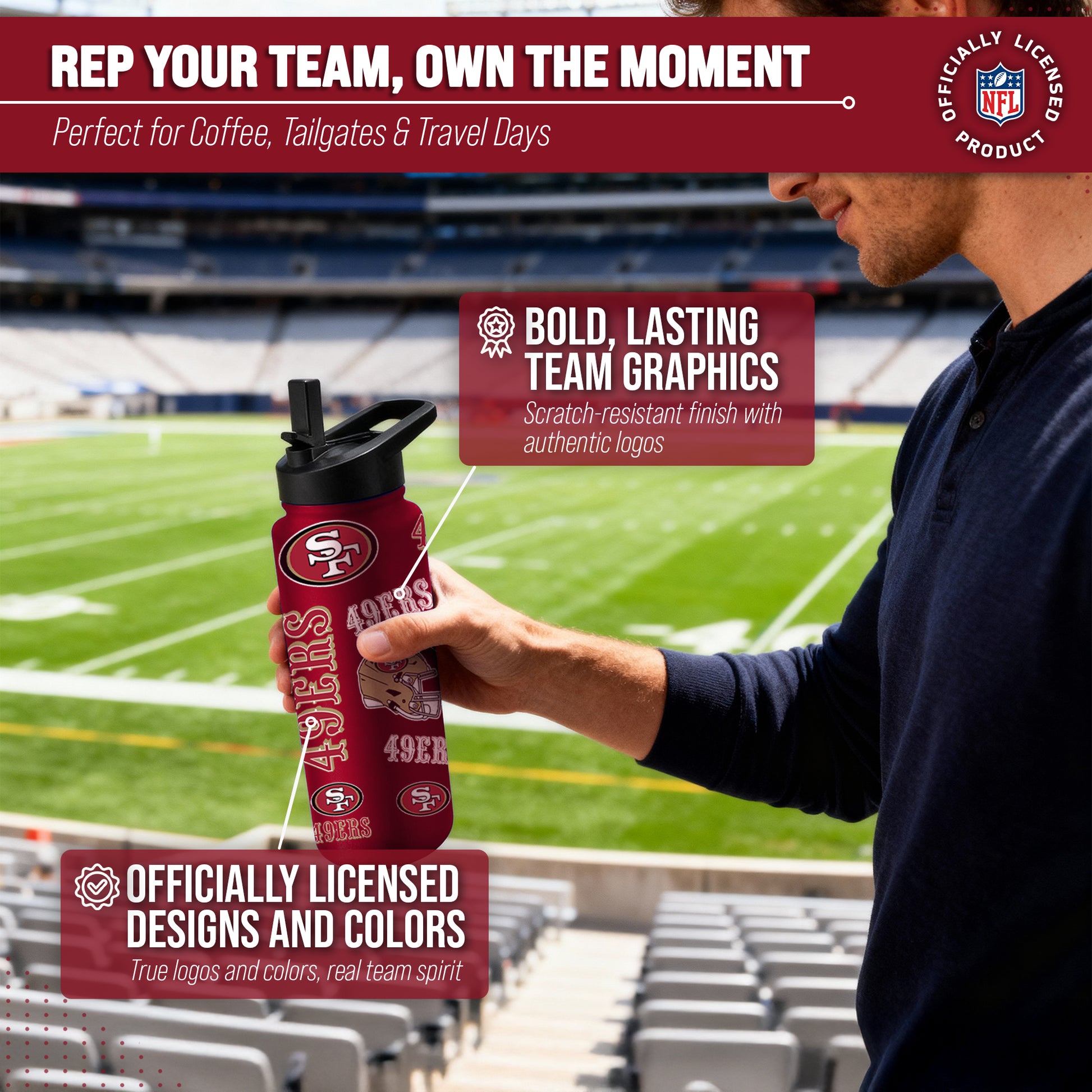 Keep Your San Francisco 49ers Team Spirit and Drinks Handy On-the-Go with the NFL Native Quencher Water Bottle! Whether you're heading to the gym or tailgating at the game, this 34oz 49ers water bottle is the perfect companion for any fan. Made from durable stainless steel, it's designed to keep your drinks hot or cold for hours. The no-leak dual option lid allows you to sip through a straw or drink straight from the spout. But it's not just for water! This versatile bottle can also hold your favorite coffee, tea, & more. With its insulated design, your beverages will stay at their desired temperature until you're ready for them. Featuring your team's logo & colors, this water bottle proudly displays your loyalty while keeping you hydrated. And when it's time for a refill, simply take off the lid and fill up again. Cheers to staying hydrated in style with the San Francisco 49ers Water Bottle! Hand wash only! Great for yourself or any fan in your life, especially for on-the-go and travel!