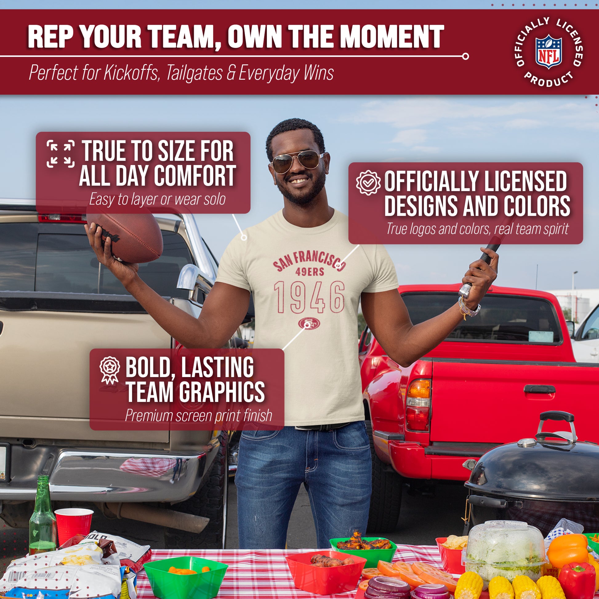 Show off your team spirit in style with our Team Fan Apparel San Francisco 49ers NFL Big Date Tag-Less T-Shirt! Made for both men and women, this unisex t-shirt is the perfect addition to any football fan's wardrobe. With its soft and comfortable cotton blend fabric, you'll love wearing it to games or just lounging at home. The tag-less design ensures maximum comfort without any annoying tags scratching at your neck. Featuring the year your favorite team was established in a large centered font along with the official team logo, this shirt will make you stand out from the crowd and show off your die-hard fandom. It comes in multiple sizes, so you can choose the one that fits best & represents your team spirit. Whether you're cheering on your 49ers at the stadium or watching from home, our NFL Big Date Tag-Less T-Shirt is a must-have for all fans! So grab yours today and support your team in comfort and style. Go team!