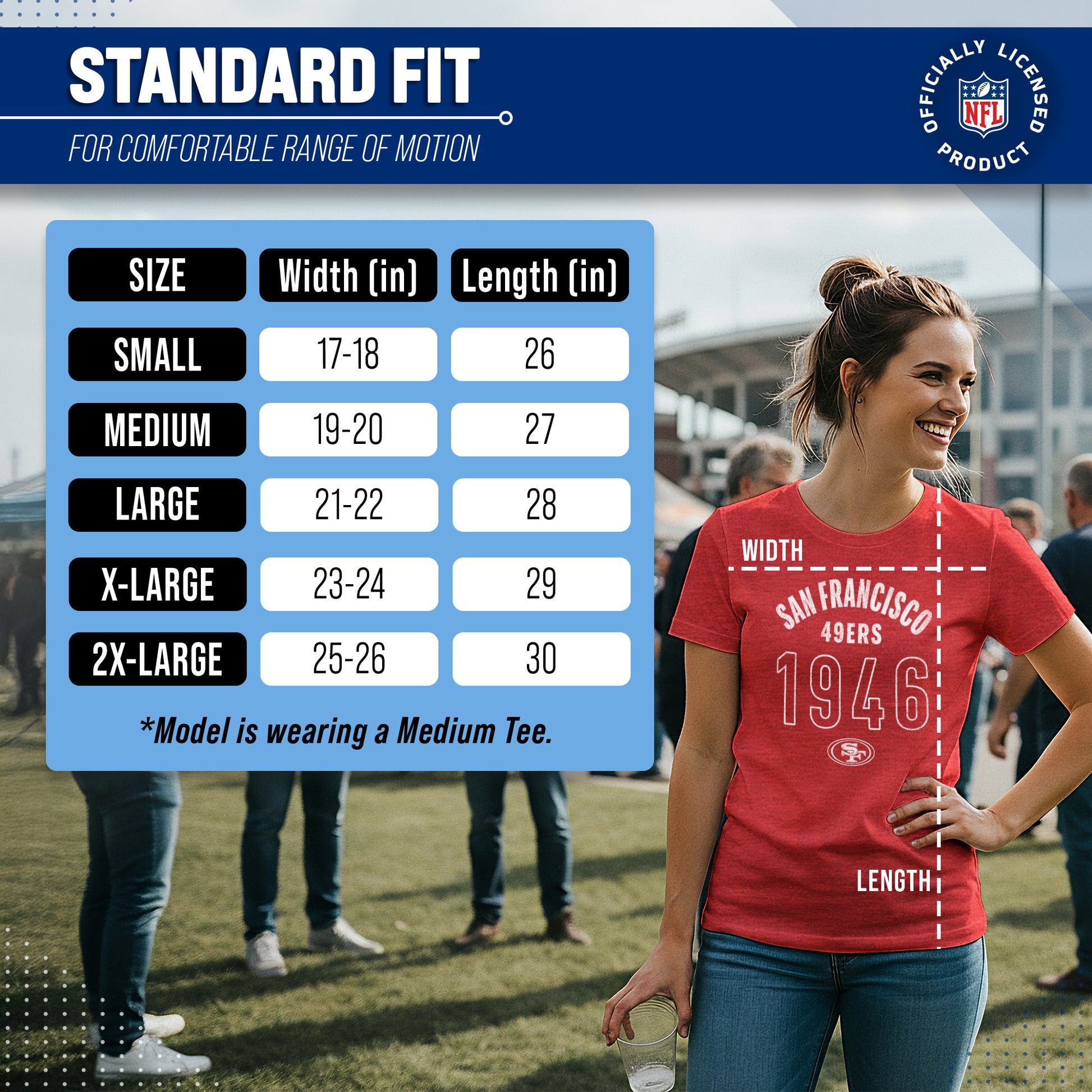 Calling all ladies! Get ready to rock game day with the Women's Team Fan Apparel Big Date T-Shirt! This comfortable and stylish San Francisco 49ers womens tee is perfect for any female football fan, whether you're cheering on your favorite team at the stadium or watching from home. Made from a super soft cotton fabric , this shirt will keep you cool and comfortable all game long. The text, logo and official team color adds a touch of retro flair, while the tag-less design ensures itch-free wear. Whether you're a die-hard fan or just love a good simple look, this shirt is perfect for showing off your team spirit. Available in a wide range of women's sizes, it's suitable for all shapes and sizes! So grab your girlfriends and get ready to cheer on your team in style with the Women's Team Fan Apparel Big Date T-Shirt!