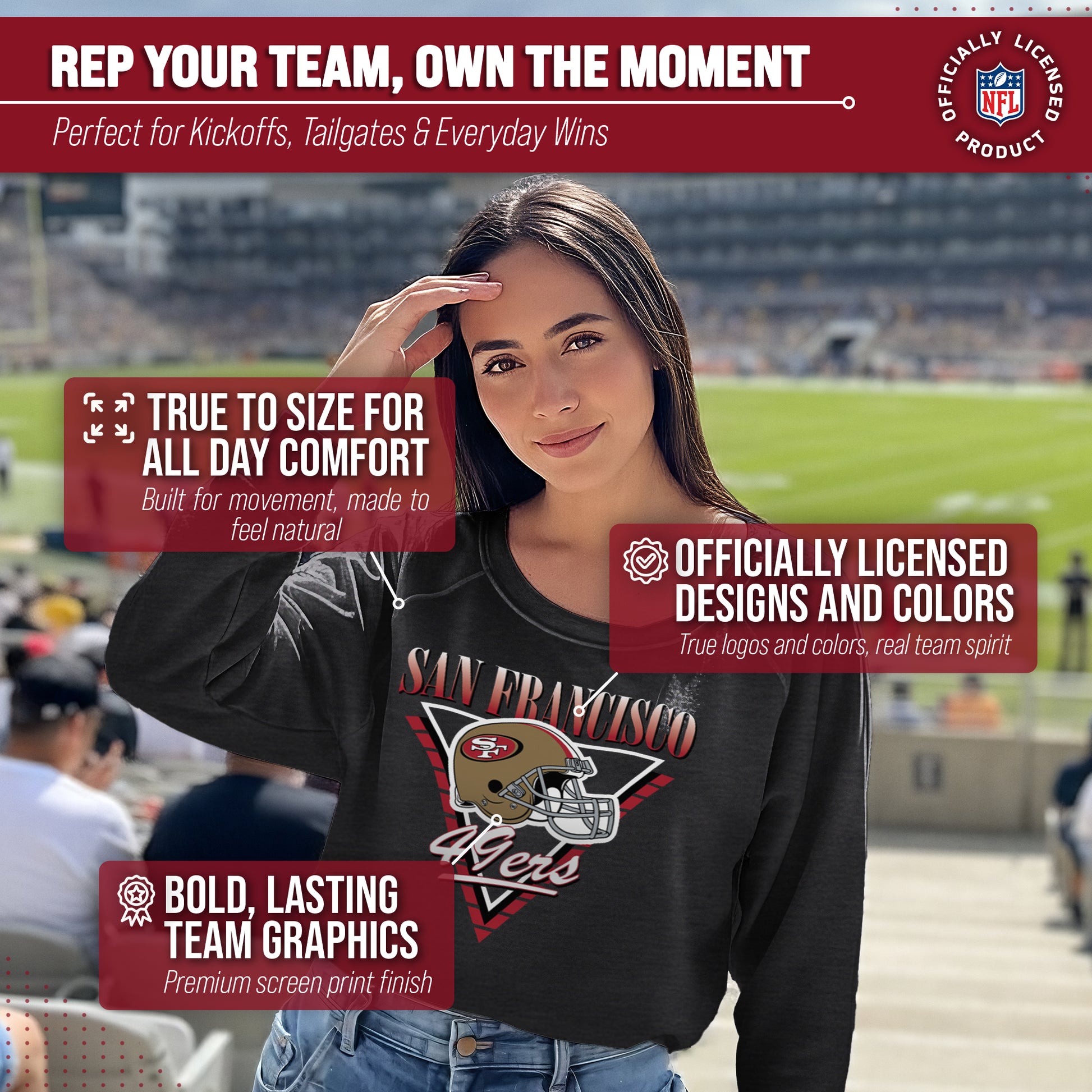 Hey there, fellow lady football fans! Show off your team pride in style with our Team Fan Apparel San Francisco 49ers NFL Women's Retro Triangle Slouchy Crewneck Fleece Pullover. Made with extra soft cotton polyester fleece material, this long sleeve pullover sweatshirt will keep you warm and cozy on game day or any chilly day. With a tagless design, you won't have to worry about any annoying tags distracting you from cheering on your team. Featuring a retro triangle design and relaxed fit, this pullover adds a touch of fashion to your game day wardrobe. Available in a range of women's sizes, it's the perfect addition to any fan's closet. Whether you're headed to the stadium or watching from home, stay cool and stylish with this must-have piece of 49ers apparel. Don't let snow or cold weather dampen your team spirit - grab one for yourself or as a gift for the ultimate football-loving lady in your life! Go 49ers!