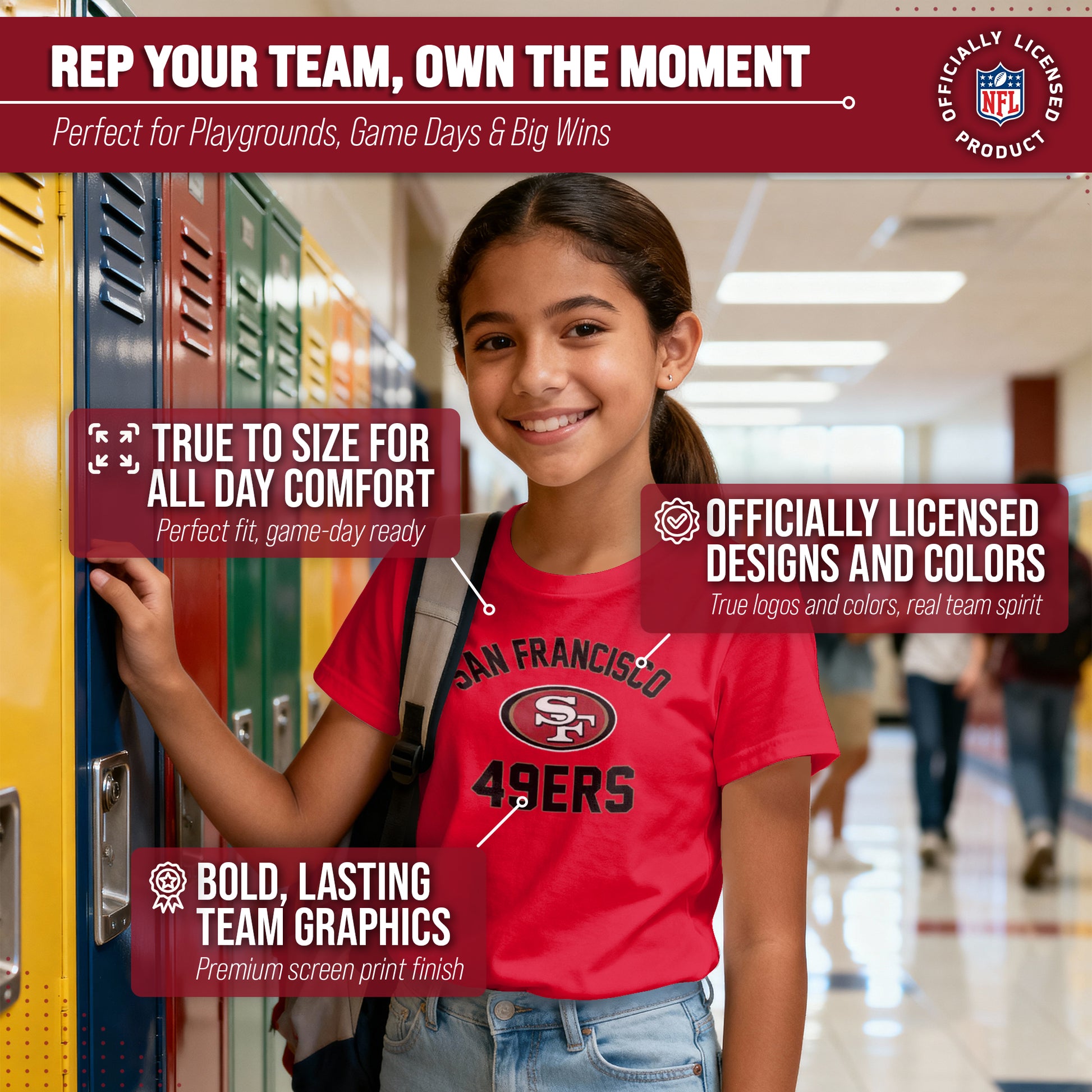 There's nothing more exciting than a much-anticipated gameday. Our Youth Gameday San Francisco 49ers football tshirt is the ideal shirt to wear on gameday whether you're at the game, or watching from the comfort of your own home. This San Franciso tshirt is super comfortable, runs true to size, and is great for showing team pride all year long! The semi-fitted style makes this the perfect 49ers youth shirt for both boys and girls. Our shirts really are the perfect fan apparel for school and sports games. The youth gameday shirt is lightweight and ideal for warmer weather or as an extra layer during colder months. Our 49ers shirts for boys and girls are essential apparel for young football fans. Our tagless San Francisco 49ers youth shirt ensures the most comfortable fit. This semi-fitted tshirt is made from a 50/50 cotton/polyester blend; contrast shoulder to shoulder neck tape and 1x1 rib knit neck makes for comfortable fit around the neck and shoulders. This high quality shirt for kids features a double-needle sleeve and bottom hems. These are high quality 49ers graphic shirts for girls and boys. The vivid graphics will stay crisp wear after wear, and year after year. The thermal printed graphics are high definition, official true team colors, and also resist fading. This San Franciso tshirt is made with high stitch density for smoother printing surface. Our official shirts for boys and girls make the best gifts. This piece of San Francisco 49ers apparel is the perfect birthday or Christmas gift for any young football fan. This tee is absolutely perfect for school, stadium fun, or watching the game at home.
