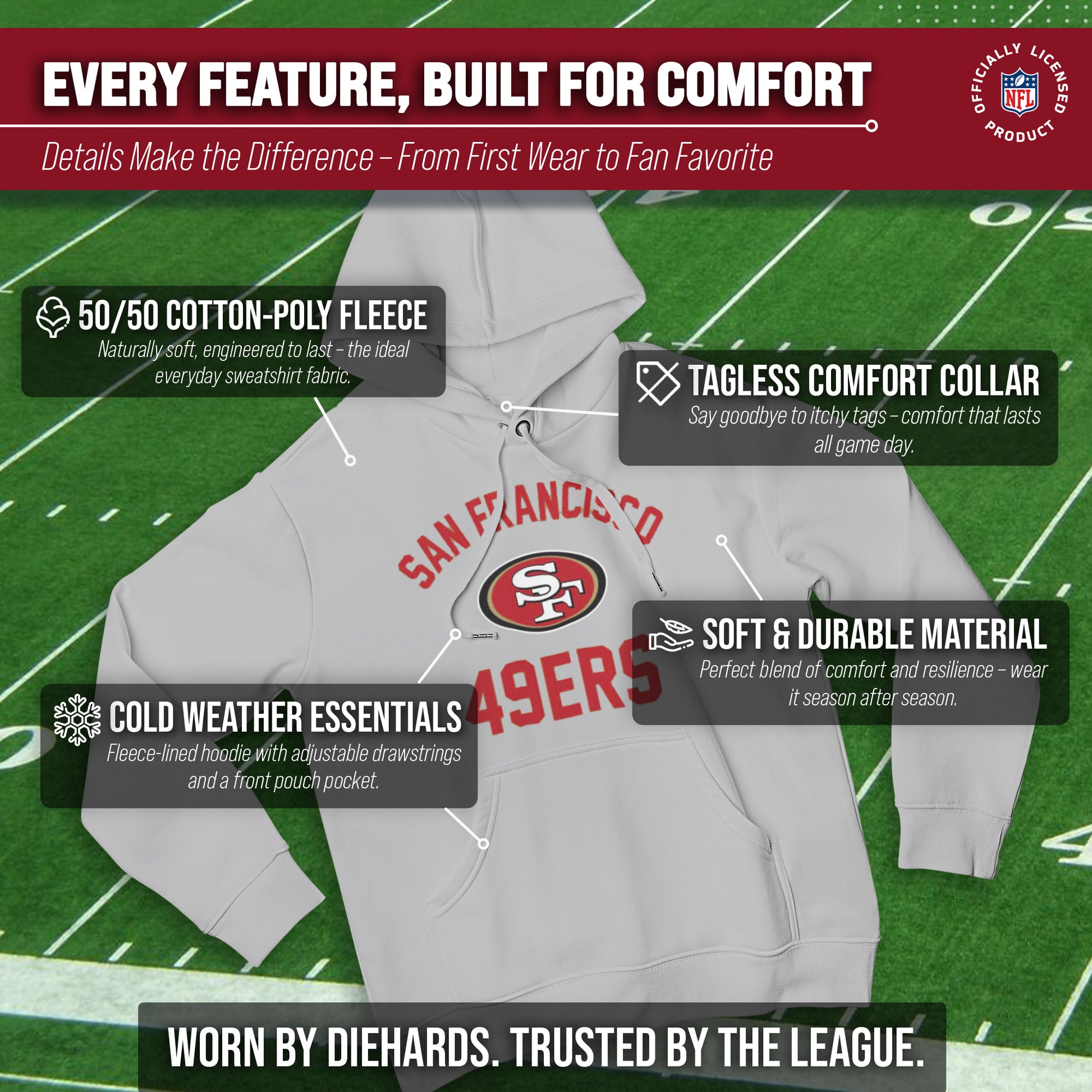 From the parking lot tailgate to the final whistle, our Adult Gameday San Francisco 49ers Football Pullover Hoodie is the ultimate choice for die-hard fans seeking warmth, durability, and unmistakable style. Built with a plush cotton face and polyester fleece interior, this midweight blend offers superior insulation and resistance to pilling—so you stay comfortable and looking sharp whether you’re braving the crisp air at the stadium or lounging on the couch. Officially licensed by the NFL, every hoodie proudly displays bold, screen-printed San Francisco graphics in your choice of primary team colors. Utilizing high-density stitching and premium inks, the vibrant 49ers logo resists cracking and fading through countless washes, ensuring your fan gear remains as spirited as the game-day environment. Thoughtfully designed for functionality, this unisex pullover features an adjustable drawstring hood that cinches shut to block wind, while a spacious front pouch pocket keeps hands warm or tucks away essentials like keys and your game-day wallet. The tagless neckline, rib-knit cuffs, and hem eliminate irritation and lock in core warmth so you can focus on every play, not itchy seams. With a semi-relaxed cut that runs true to size, this hoodie drapes effortlessly over tees or layers neatly under heavier jackets and coats for colder matchups. Reinforced double-needle stitching at shoulder seams, pocket openings, and sleeve hems delivers extra strength to withstand high-fives, tailgate festivities, and celebratory jumps. Available in sizes S–XXL, the Adult Gameday San Francisco 49ers Hoodie is perfect for tailgate parties, stadium seats, sports bars, or casual weekend wear. It also makes an exceptional gift for the 49ers fanatic in your life—ideal for birthdays, holidays, or thoughtful surprises that show your unwavering team loyalty. Elevate your fan wardrobe with this performance-driven football hoodie and carry your San Francisco pride through every quarter, every season, and every victory.