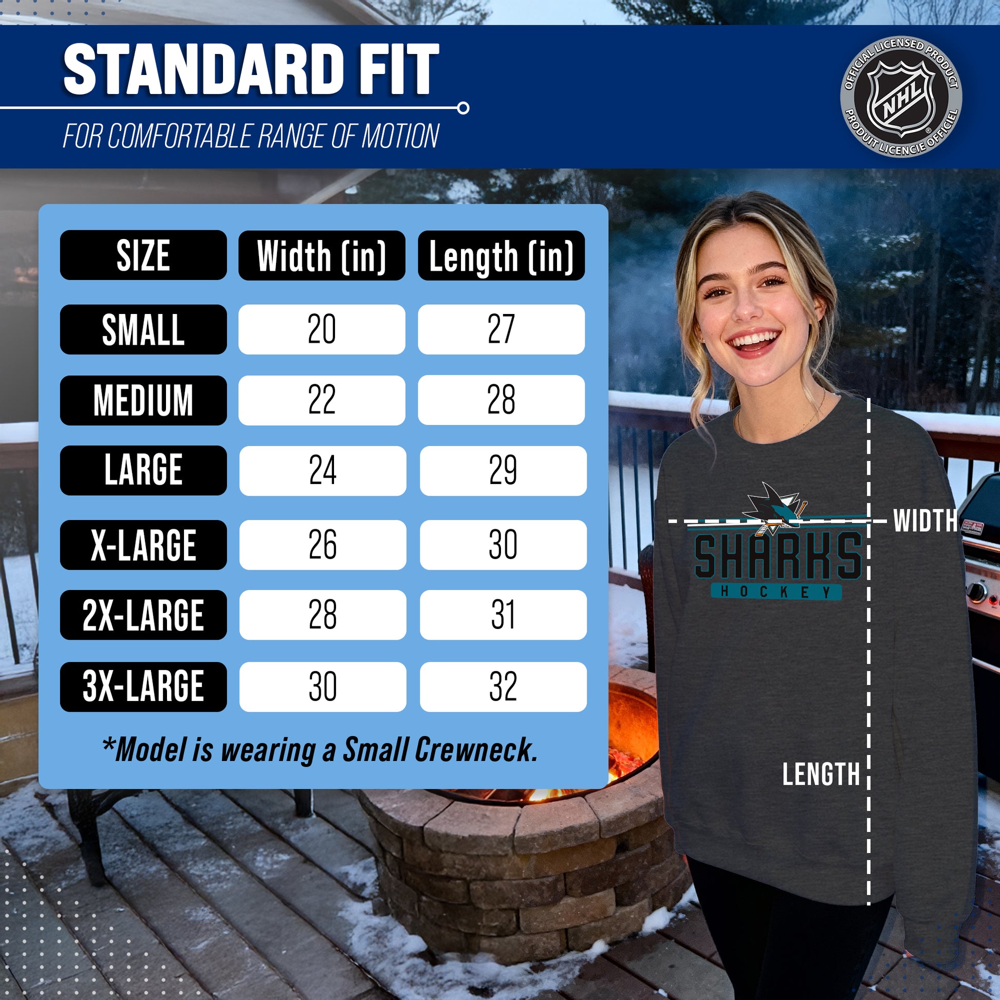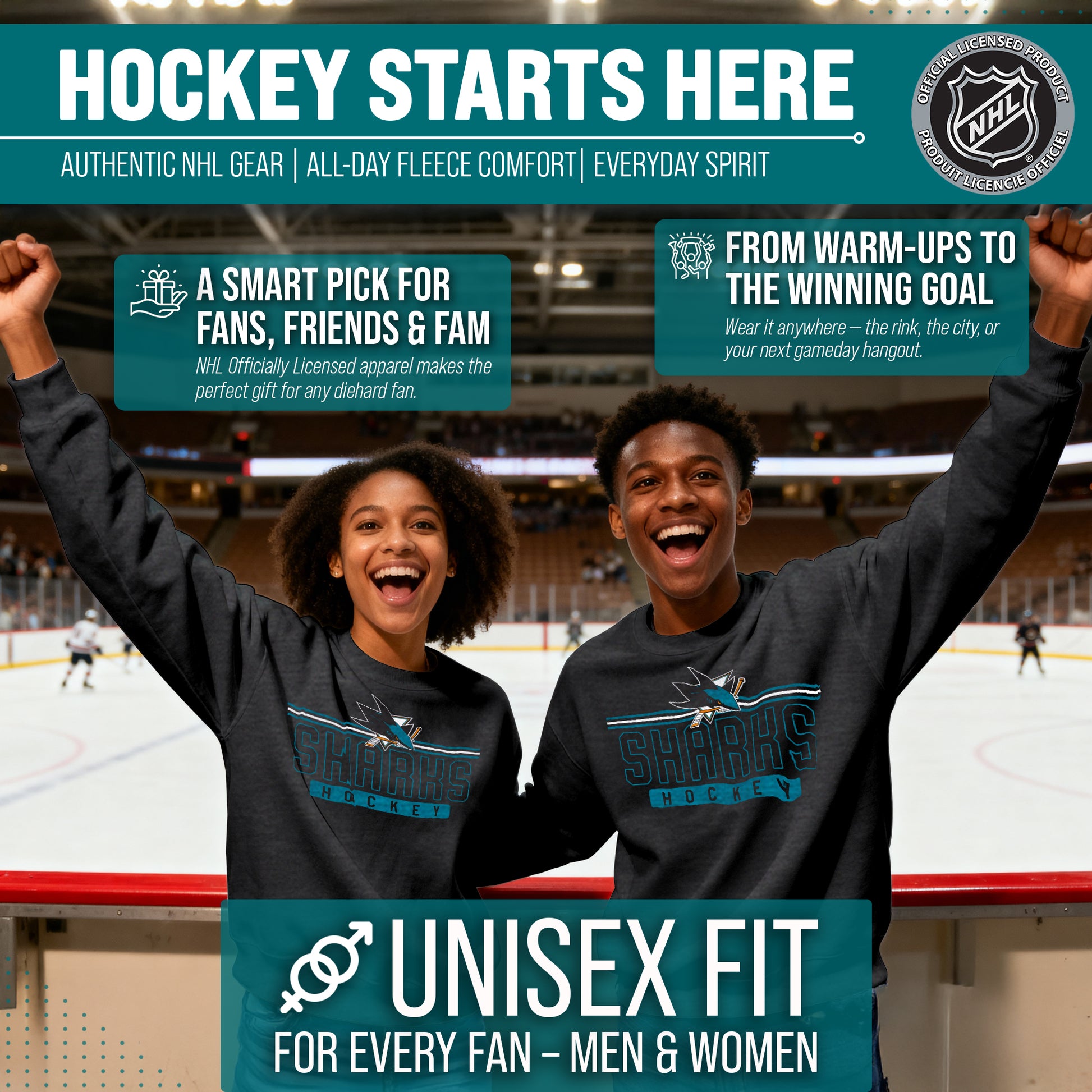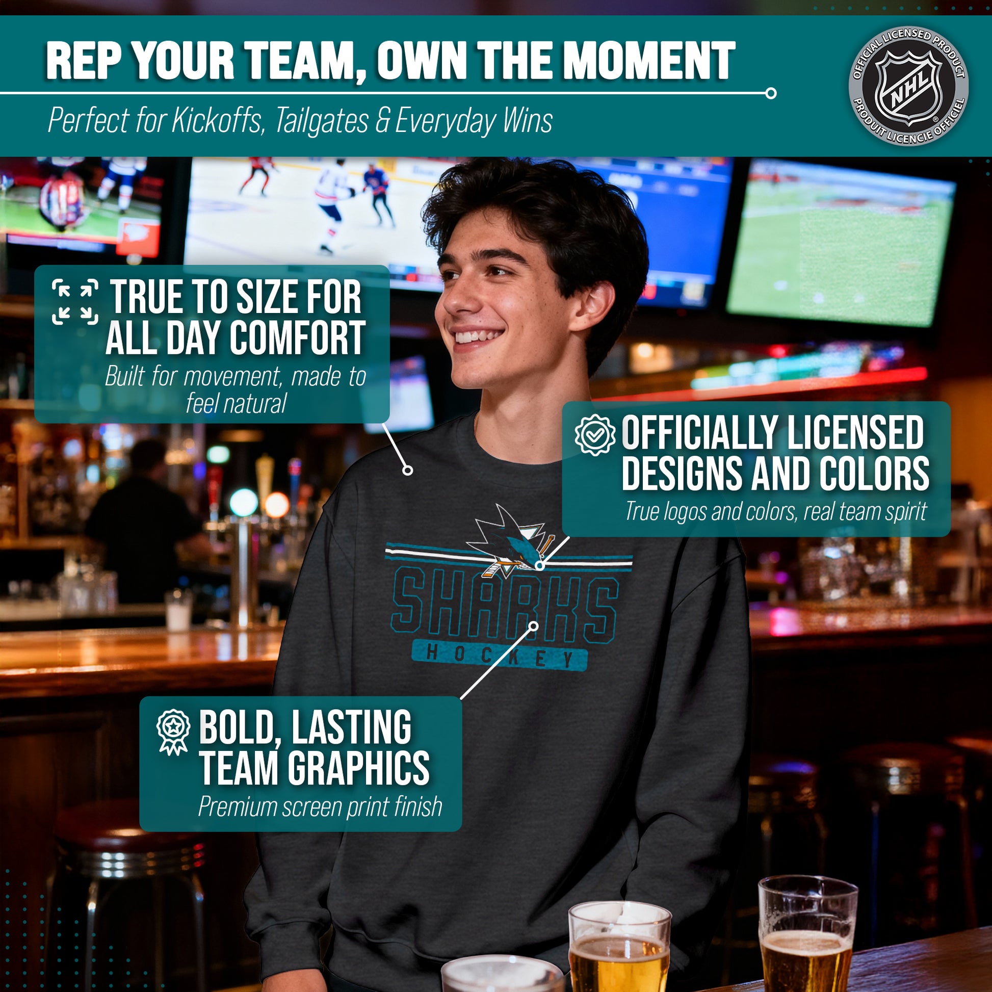 Score with Team Fan Apparel, the ultimate destination for officially licensed NHL apparel for men and women. Designed and printed in the USA, we use only the highest quality screen printing techniques to bring you the most comfortable, durable, and stylish clothing possible. Go ahead and show your team pride at the big game or any time! This premium crewneck fits both male and female adults and comes in small, medium, large, XL, and XXL. So needless to say, it fits San Jose Sharks fans of all types! Maybe you aren't a Sharks fan but you know someone who is? Don't worry! This high-quality crewneck is soft, lightweight, breathable, and a GREAT gift for any birthday, anniversary, Father's Day, Mother's day, you name it! So, if you want to stand out as the #1 fan at the next big game or watch party, you're going to want to be wearing one of these hockey t-shirts.