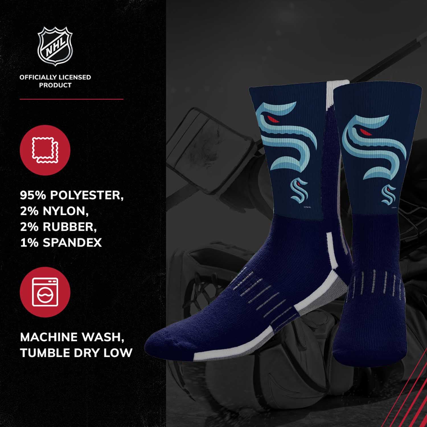 These adult Zoom Seattle Kraken socks for men and women are great for showing off their Seattle pride from head to toe. The unisex Seattle adult socks are comfortable, and are available in a range of sizes. The crew length and poly-spandex blend featuring a supportive formed heel make them a comfortable choice for showcasing your love for your team all year long. Seattle socks are great additions to a collection of Seattle Kraken stuff. Wear them with shorts, your favorite jersey, and Seattle Kraken shoes for a superfan look, or rock them in the office for an alternative to argyle on casual friday. On a lazy day, wear them with your underwear or pajamas and Seattle Kraken house shoes while you put your feet up and enjoy a game in the house. Zoom socks make great gifts for all hockey fans, combine them with other Seattle Kraken items for the perfect birthday or graduation gift. The officially-licensed team logo, colors, and graphics make these socks the ones fans prefer. Fabric content is 95% polyester, 2% nylon, 2% rubber, and 1% spandex. Machine washable, tumble dry low.