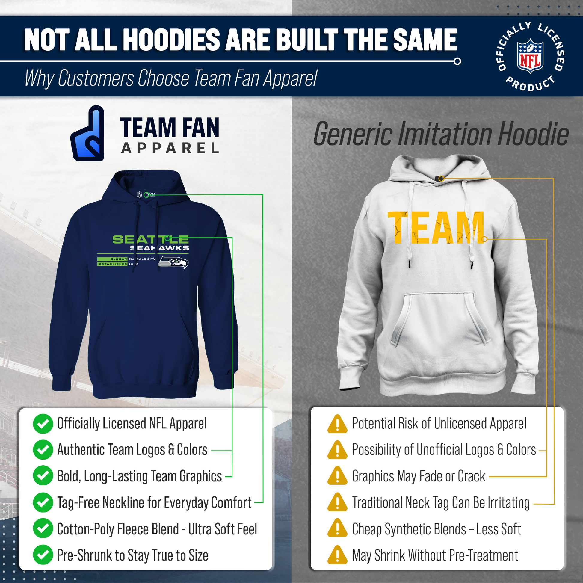 Score with Team Fan Apparel, the ultimate destination for officially licensed NFL apparel for men and women. We use only the highest quality screen printing techniques to bring you the most comfortable, durable, and stylish clothing possible. Go ahead and show your team pride at the big game or any time! This premium hooded sweatshirt fits both male and female adults and comes in small, medium, large, XL, and XXL. So needless to say, it fits Seattle Seahawks fans of all types! Maybe you aren't a Seahawks fan but you know someone who is? Don't worry! This high-quality sweatshirt is soft, lightweight but cozy, breathable and a GREAT gift for any birthday, anniversary, or Christmas gift; Father's Day, Mother's day, you name it! The front pouch pocket, drawstring hood, and soft fleece will keep you warm and keep your fandom hot! So, if you want to stand out as the #1 fan at the next big game, tailgate or watch party, you're going to want to be wearing one of these stat sheet hooded sweatshirts