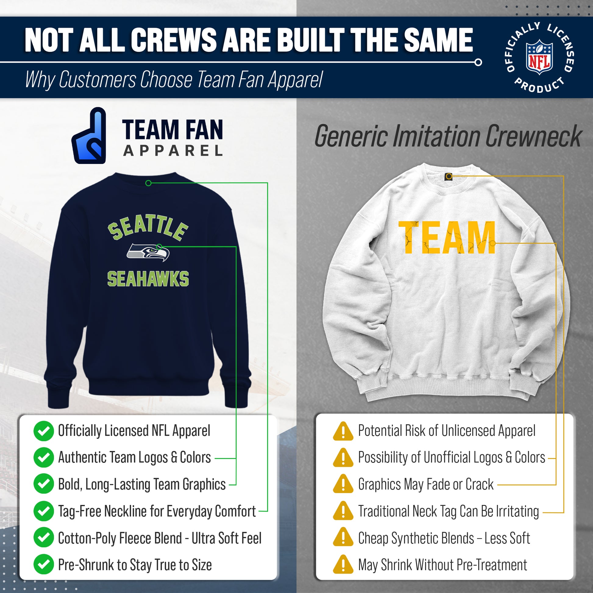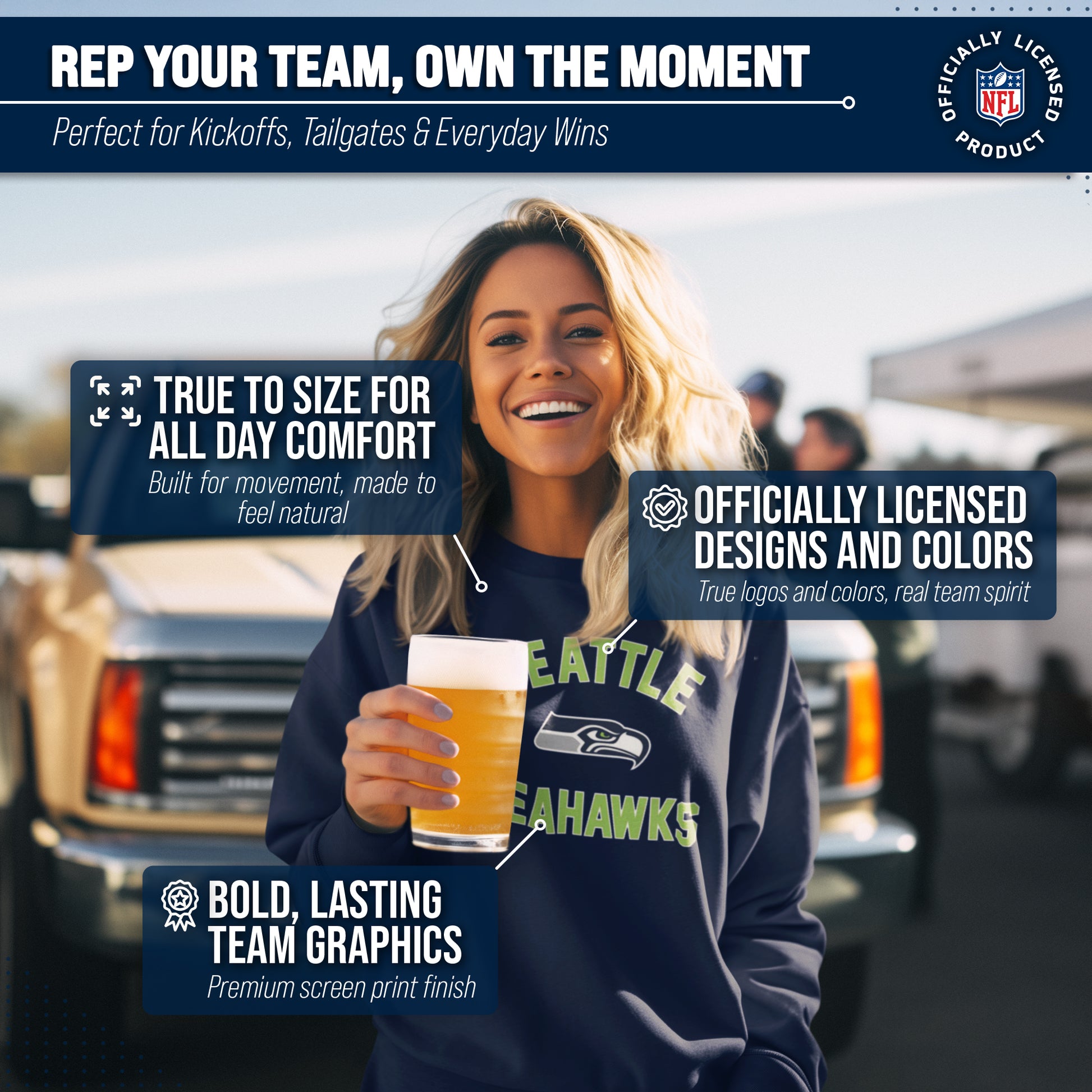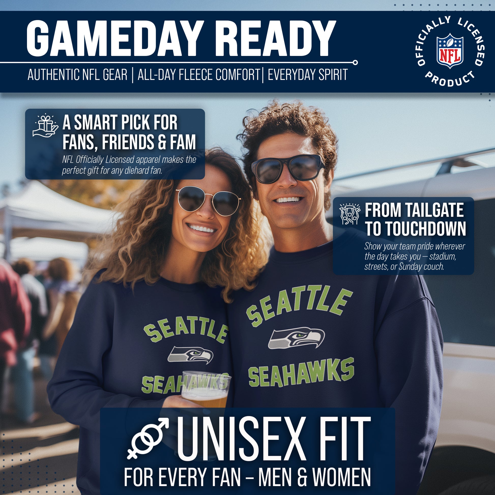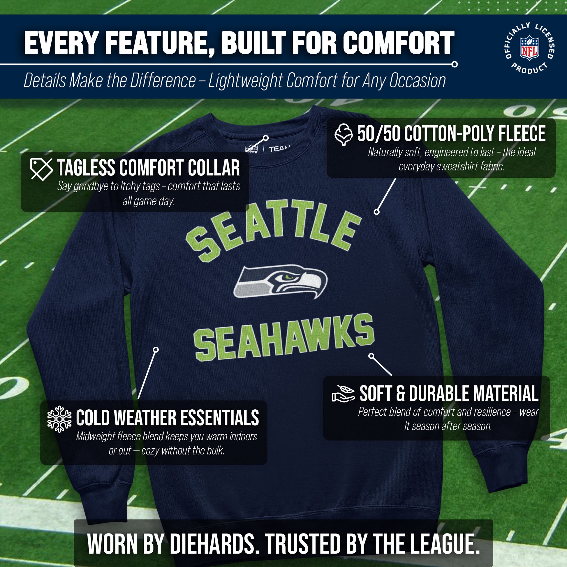 This adult Gameday Seattle Seahawks football crewneck is the ideal sweatshirt to wear on gameday. Our crewneck sweatshirt is comfortable, runs true to size, and is great for showing team pride all year long! This is the perfect Seattle sweatshirt for both men and women. Our Seattle Seahawks team colored crewneck sweatshirts are the perfect fan apparel for tailgates and sports games. The lightweight crewneck pullover is made of air jet yarn for a softer feel and reduced pilling, which means your crewneck sweatshirt will look new for years to come. You don't have to worry about the Seattle graphics fading on your crewneck, either. The pullovers are made with thermal printed graphics that are high definition, true team color, and resist fading! This Seattle sweatshirt is ideal for warm or cold weather, which means you can wear it not only all football season, but all year long! Our pro football crewneck sweatshirt features 1x1 rib with spandex for enhanced stretch and recovery. This Seattle crewneck sweatshirt has double-needle stitching at shoulders, armholes, neck, waistband, and cuffs. Our comfortable crewneck pullover is made from a cotton poly fleece blend. This tagless sweatshirt ensures the most comfortable fit for men and women. The classic fit of this sweatshirt makes this Seattle Seahawks crewneck that perfect pullover for Seattle men and women fans. Our pro Seattle Seahawks pullover sweatshirts for men and women make the best Seattle gift. Seattle Seahawks apparel is the perfect birthday gift for any football fan. This Seattle Seahawks football crewneck sweatshirt is perfect for tailgating, stadium fun, or watching the game at home.