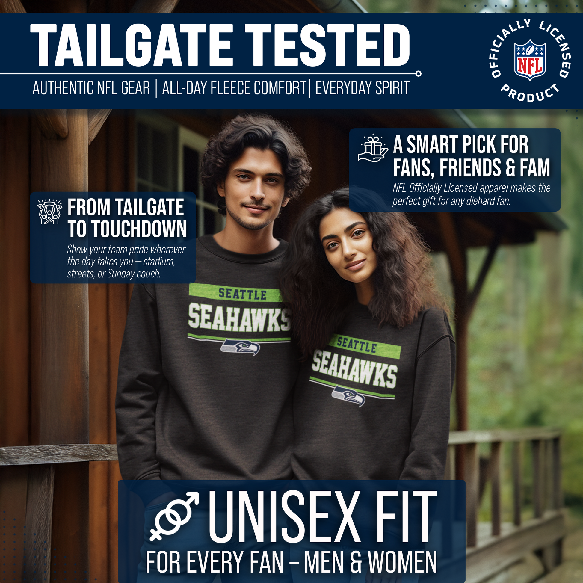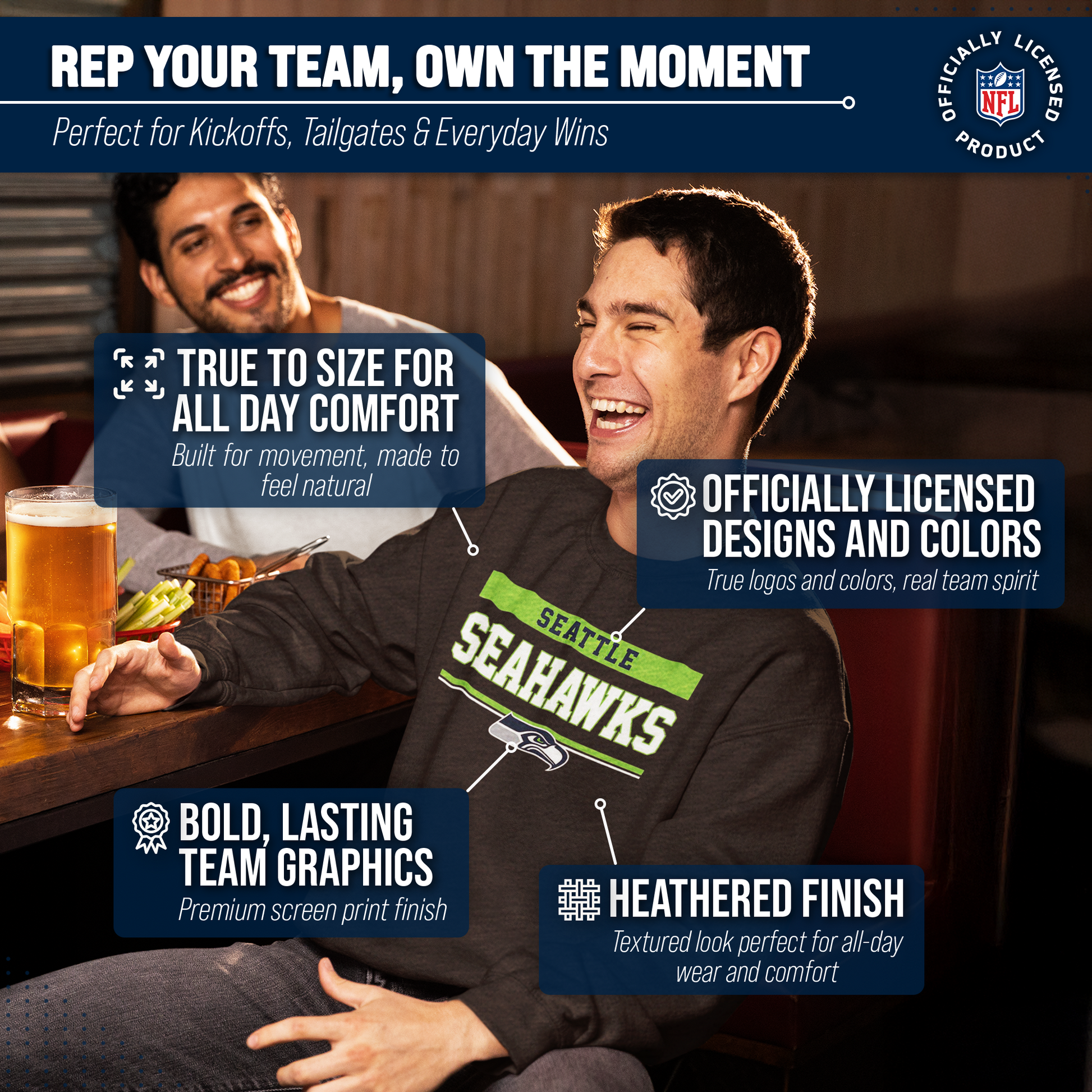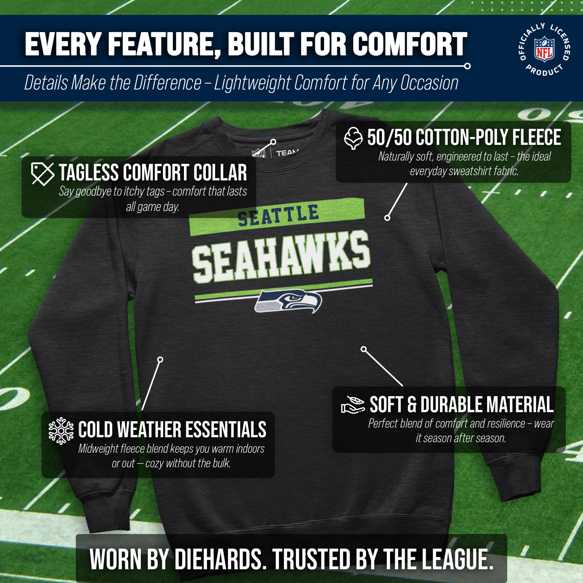 Our charcoal crew neck is a Seattle crewneck sweatshirt with a warm and toasty 9 oz fleece lining. It's the very best of Seattle Seahawks apparel, plain and simple. Gear up for your cold weather football game with confidence. Or, for women, bring it with you to games and tie it around your leggings in case the arena is a little chilly. Our football crew neck sweatshirts for men and women are super comfortable, run true to size, and are great for showing your team pride all year long. Plus, the unisex fit is ideal for both men and women and works as an oversized sweatshirt for kids. [Team_long] sweater for men and women features your teems thermal-printed emblem wordmark will stay crisp and clear, wear after wear. All colors and fonts are officially licensed and are of the highest of quality, it even comes with an officially licensed tag. Features: ribbed cuffs and waistband. This football sweatshirts crew in particular is perfect for tailgates, games, and showing off your team spirit. Gameday crewneck [team_ long] sweatshirts make a great birthday, Christmas (or any other holiday), or graduation gift for a sports fan. Gameday charcoal crewneck is essential apparel for protecting yourself and your loved ones from the elements. The fleece material will keep you warm through the colder months, and the pullover design allows you to feel embraced like a big oversized blanket. The Seattle Seahawks charcoal crew necks are pre-shrunk and are made from a dual blend of 50% cotton and 50% polyester that is ideal for that tailgate or game day when the temperature drops. Pair with your other favorite Seattle game day apparel! Say goodbye to cheap sweatshirts. Our charcoal sweatshirts for women and men help you gear up and get ready to cheer your team to victory.