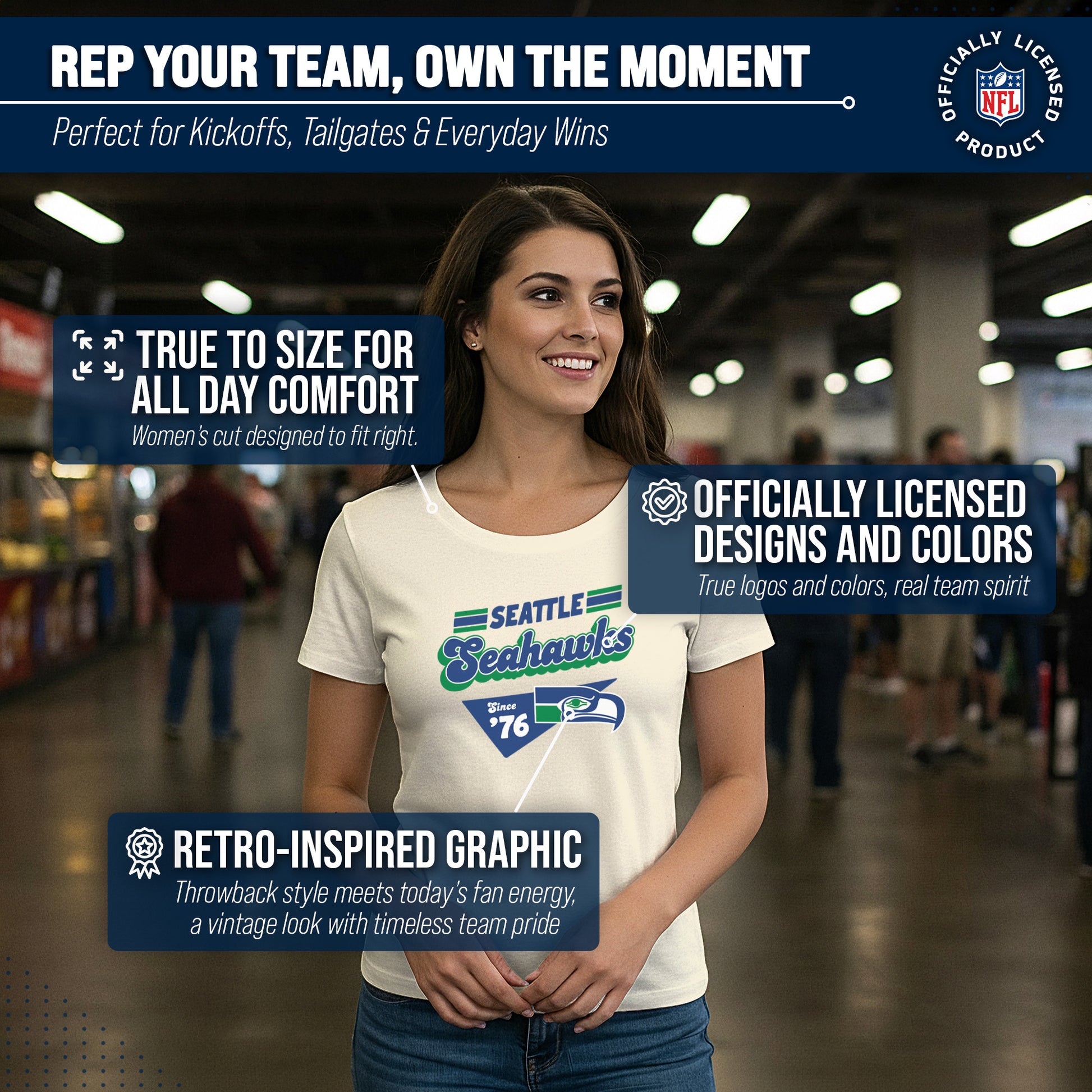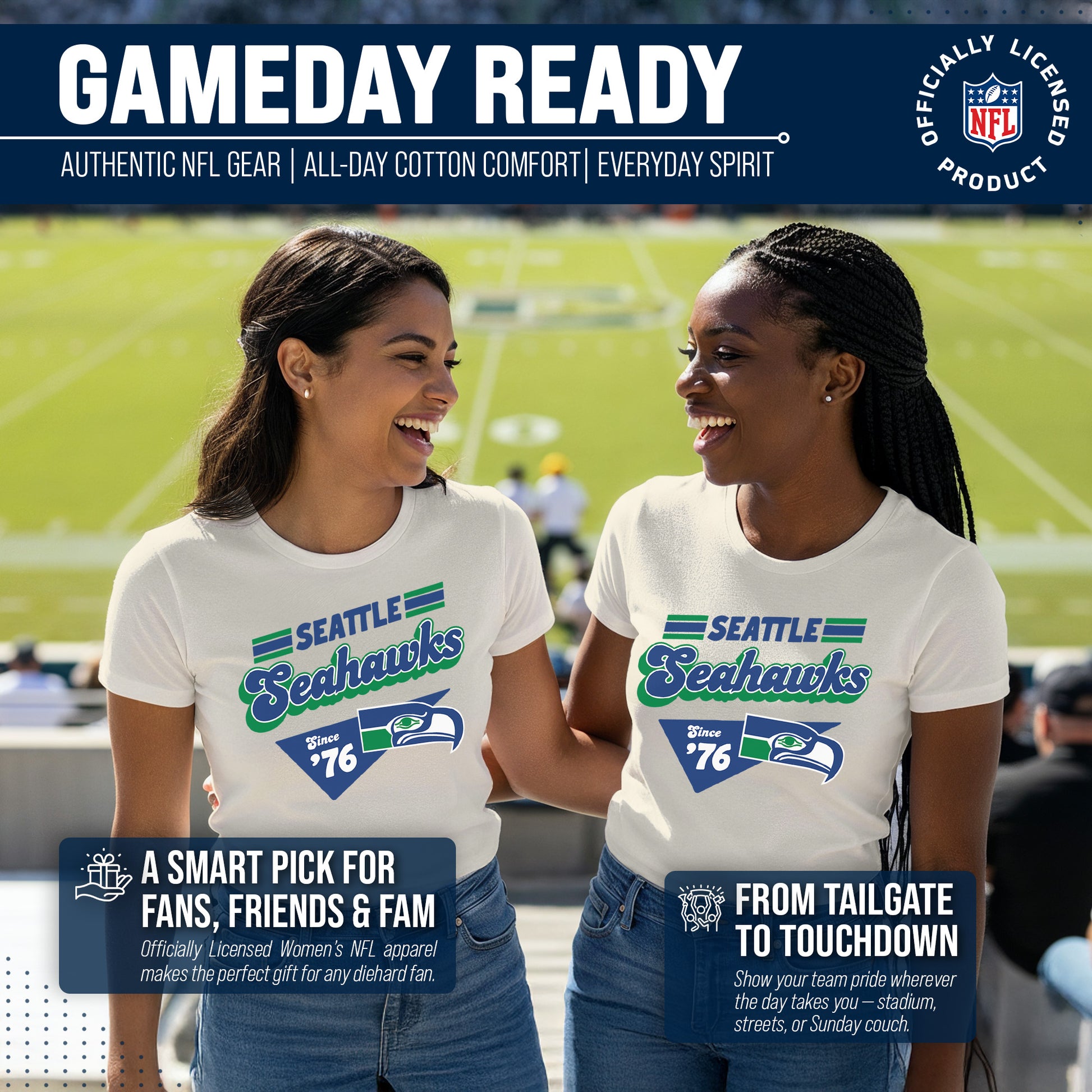 Calling all ladies! Get ready to rock game day with the Women's Team Fan Apparel Vintage Charm T-Shirt! This comfortable and stylish Seattle Seahawks womens tee is perfect for any female football fan, whether you're cheering on your favorite team at the stadium or watching from home. Made from a super soft cotton fabric , this shirt will keep you cool and comfortable all game long. The pennant design, team name, and team logo adds a touch of retro flair, while the tag-less design ensures itch-free wear. Whether you're a die-hard fan or just love a good simple look, this shirt is perfect for showing off your team spirit. Available in a wide range of women's sizes, it's suitable for all shapes and sizes! The birch-colored garment will match well with everything in your closet! So grab your girlfriends and get ready to cheer on your team in style with the Women's Team Fan Apparel Vintage Charm T-Shirt!