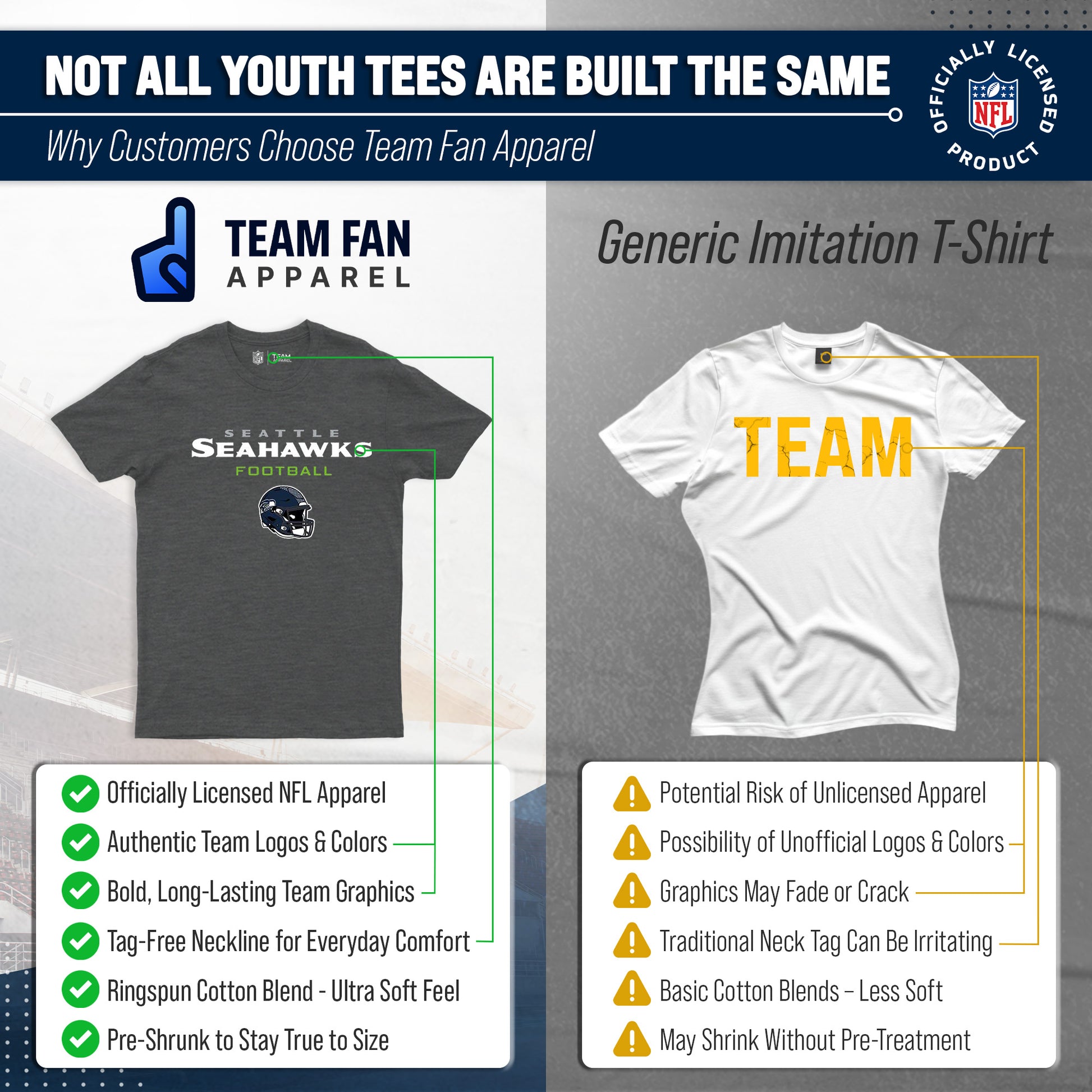 The Youth Seattle Seahawks NFL Small Helmet t shirts are the ultimate light, soft, and comfortable tee. These youth Seahawks tshirts are the most versatile football apparel. Let us help your young fan celebrate and showcase their team pride with our durable and lightweight youth football tees! This Seahawks shirt features a quality, screen printed wordmark that will last wear after wear. The official wordmark and helmet design gives you the look of a loyal and seasoned sports fan and the unique heather, dual-blended material gives a trendy, distressed look without that heavy printed feel. Made of 50% ringspun cotton and 50% polyester, the dual blend material is extremely soft, smooth and comfortable. These youth Seattle Seahawks shirts for boys and girls comes without a tag, so you'll never feel annoyed or irritated by those pesky neck tags again! Quality Seattle t shirt makes the best birthday, Christmas, or summer camp gifts for young fans.