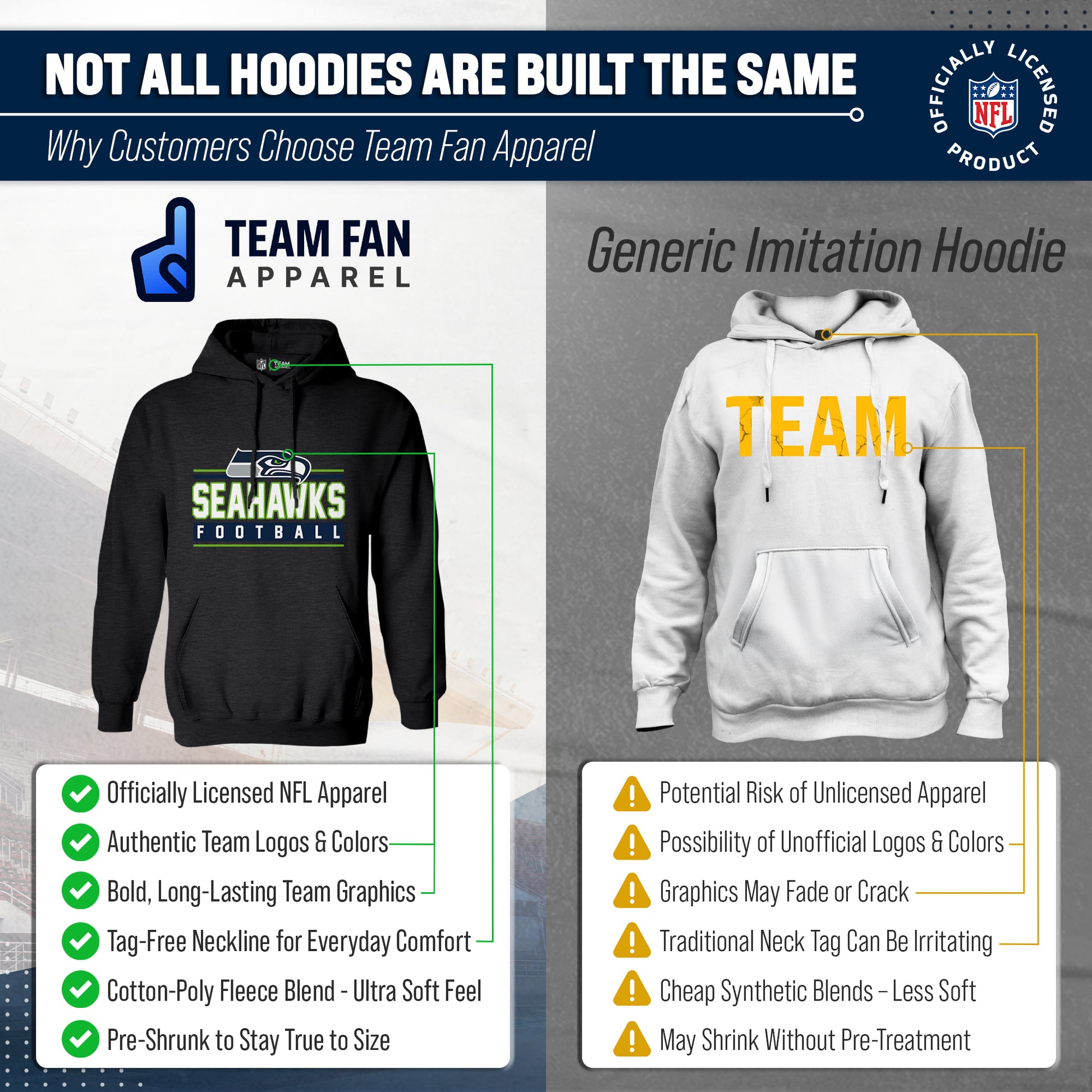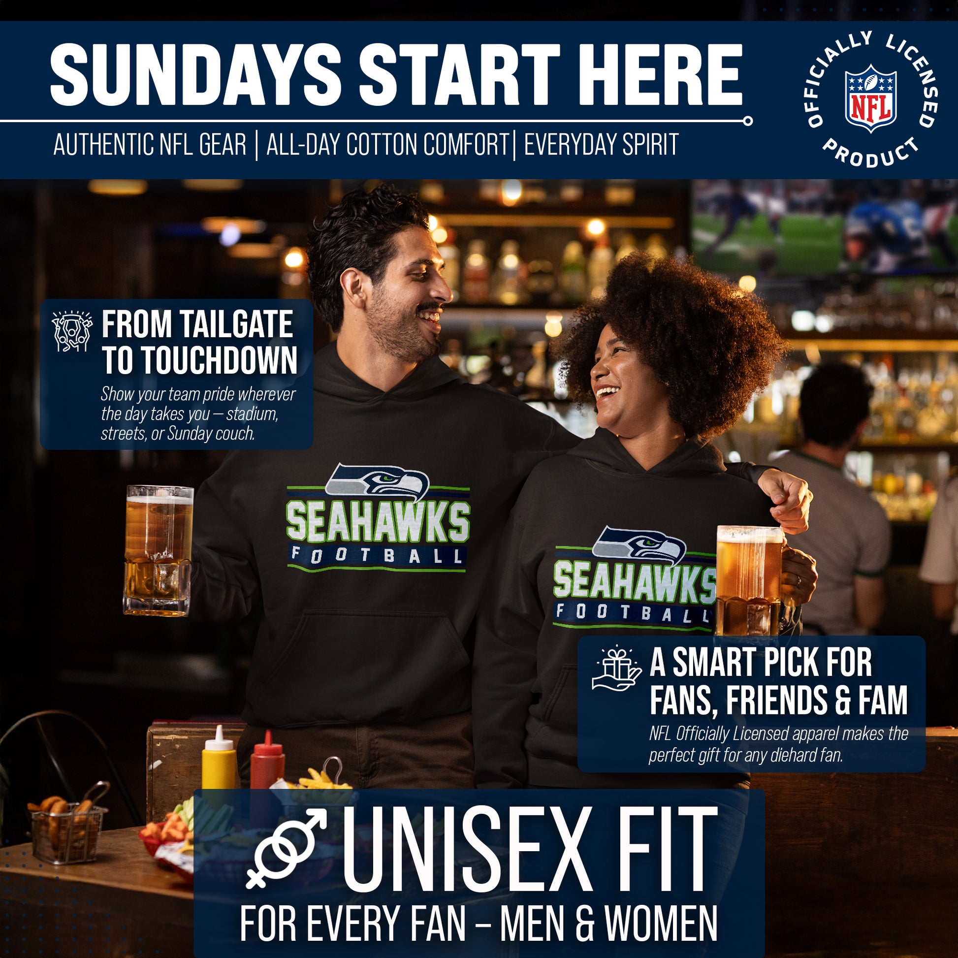The True Fan womens and mens Seattle Seahawks hoodies are the ultimate light, soft, & comfortable sweatshirts. These Seattle Seahawks pullover hoodies are the most versatile football apparel. Let us help you celebrate your team pride with our durable and lightweight Seattle Seahawks hoodies for men and women. This sweatshirt features a quality, screen printed wordmark that will last. The official wordmark design gives you the look of a loyal and seasoned sports fan and the unique, dual-blended material gives a trendy, distressed look without that heavy printed feel. Made of 50% ringspun cotton and 50% polyester, the dual blend material is extremely soft and smooth. These Seattle Seahawks hoodies for men and women come without a tag, so you'll never feel irritated by tags again! This comfortable Seattle hoodie makes the best birthday, Christmas, or graduation gifts for Seahawks fans.