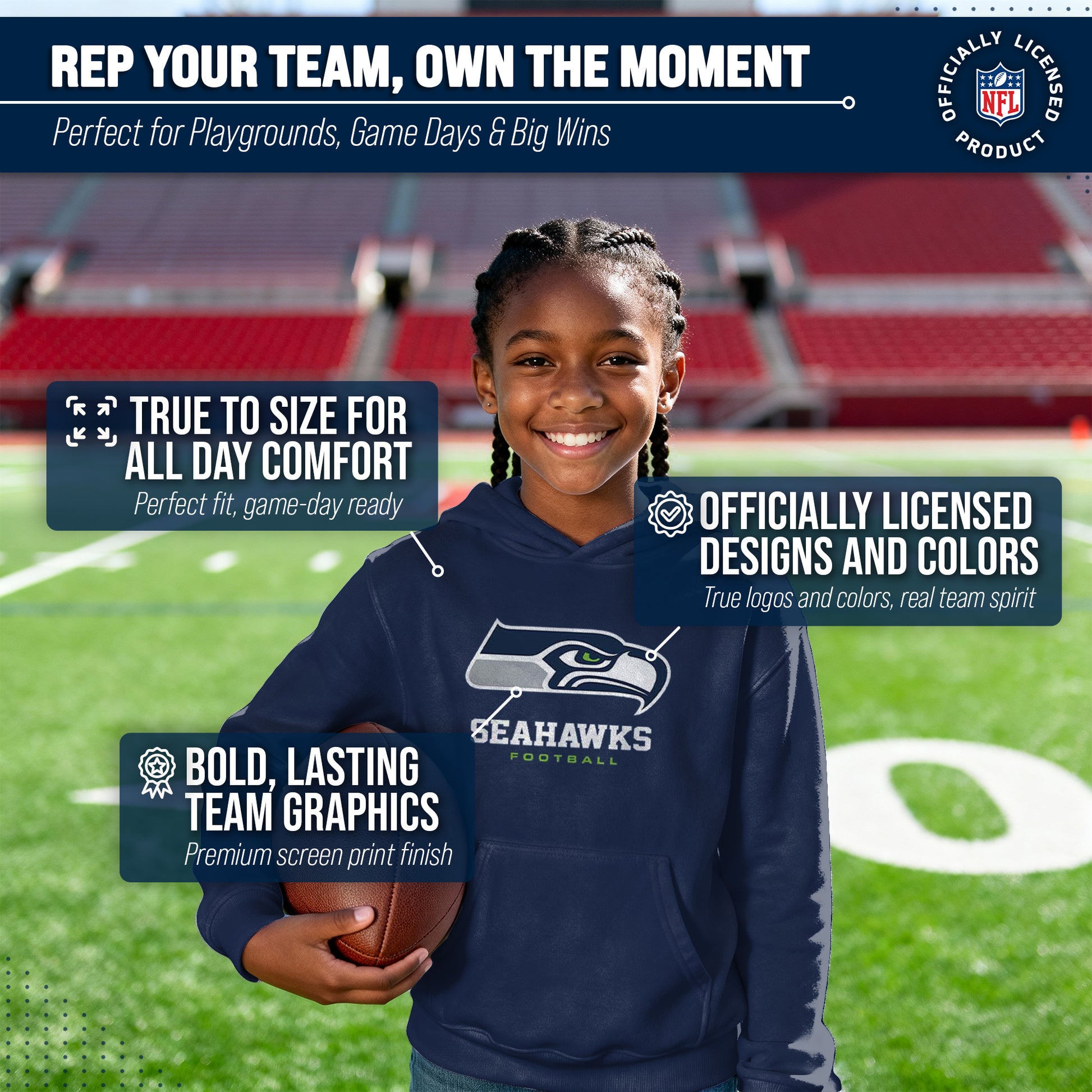 Seattle Seahawks Youth NFL Ultimate Fan Logo Fleece Hooded Sweatshirt -Tagless Football Pullover For Kids - Navy