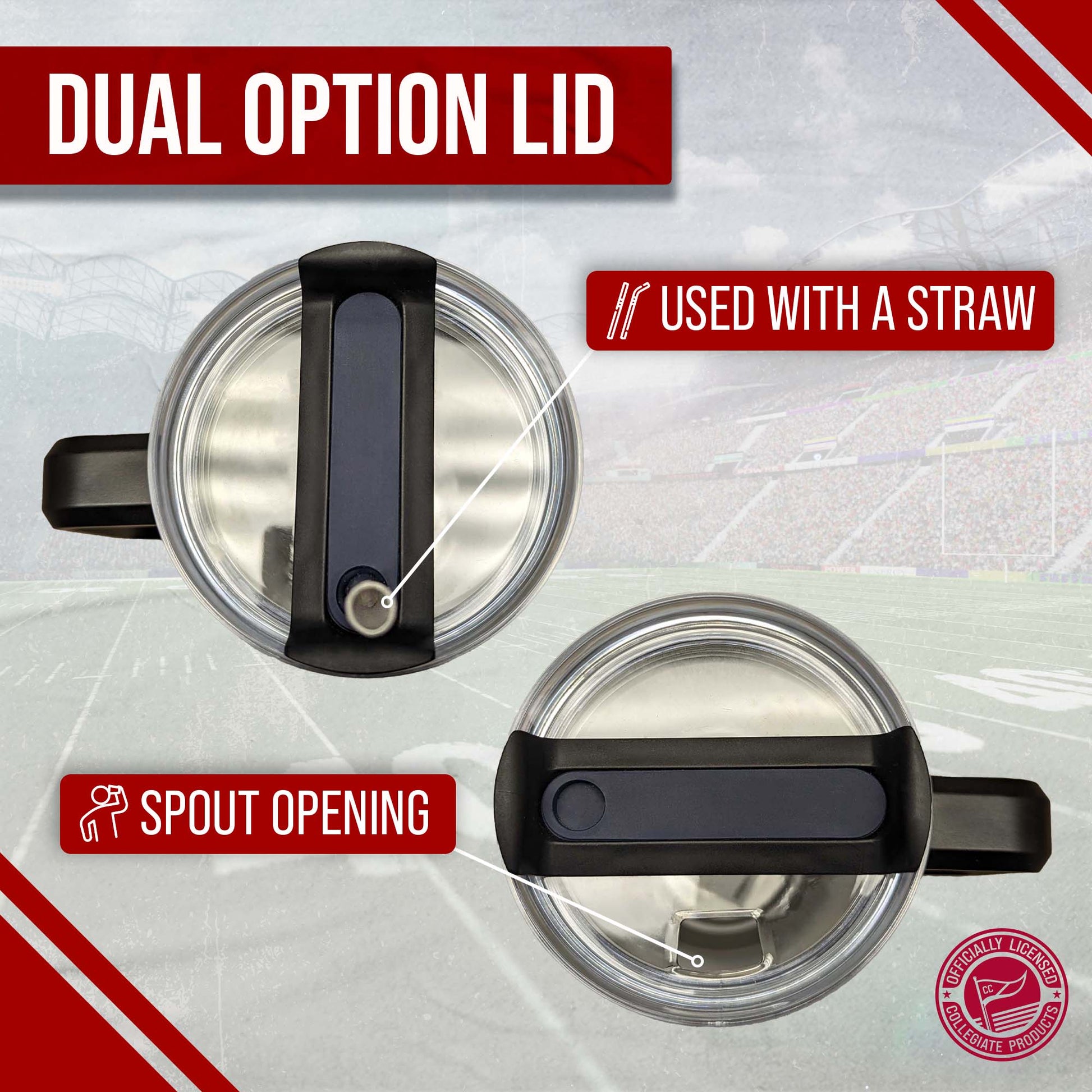 Our stainless steel 40 oz tumblers with handle and straw are designed for constant use in any type of setting! At a sports game? These insulated tumblers are compact and can fit in most cup holders and even feature a no slip grip on the bottom to keep condensation away! On the move? Our contoured spout or straw options makes it easy to sip on the go! No matter the setting, show your school pride while properly and efficiently preserving the desired temperature of your beverage! This SMU Mustangs travel tumbler also makes a great gift! Combine the 40 oz SMU tumbler with a SMU pillow or a SMU blanket and give a whole haul of Mustangs gear to your favorite alumni! All of our products feature the officially licensed team colors, logos and lettering. We don't skimp on quality in any way. The colors are always vibrant and the graphics are always accurate and brimming with team spirit.