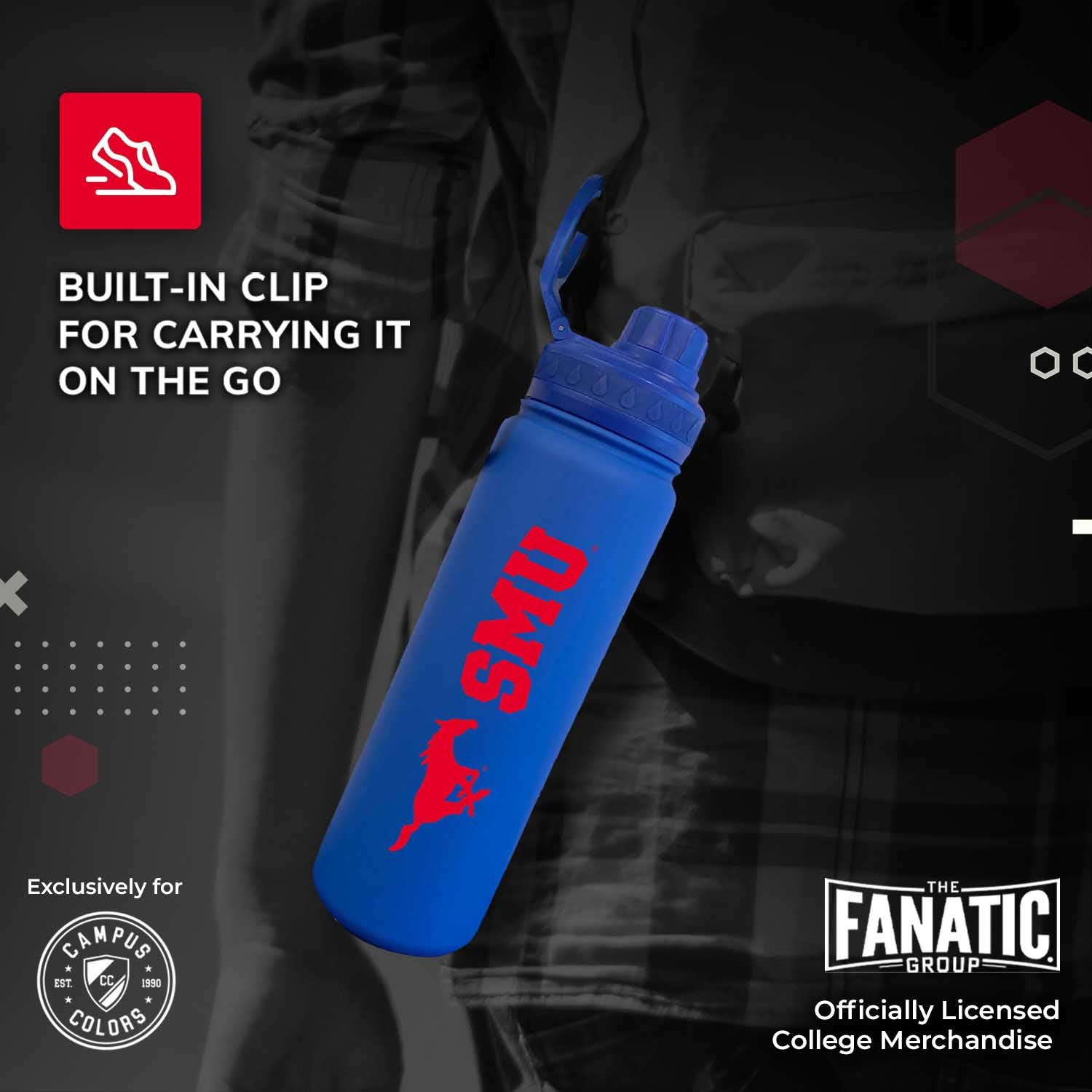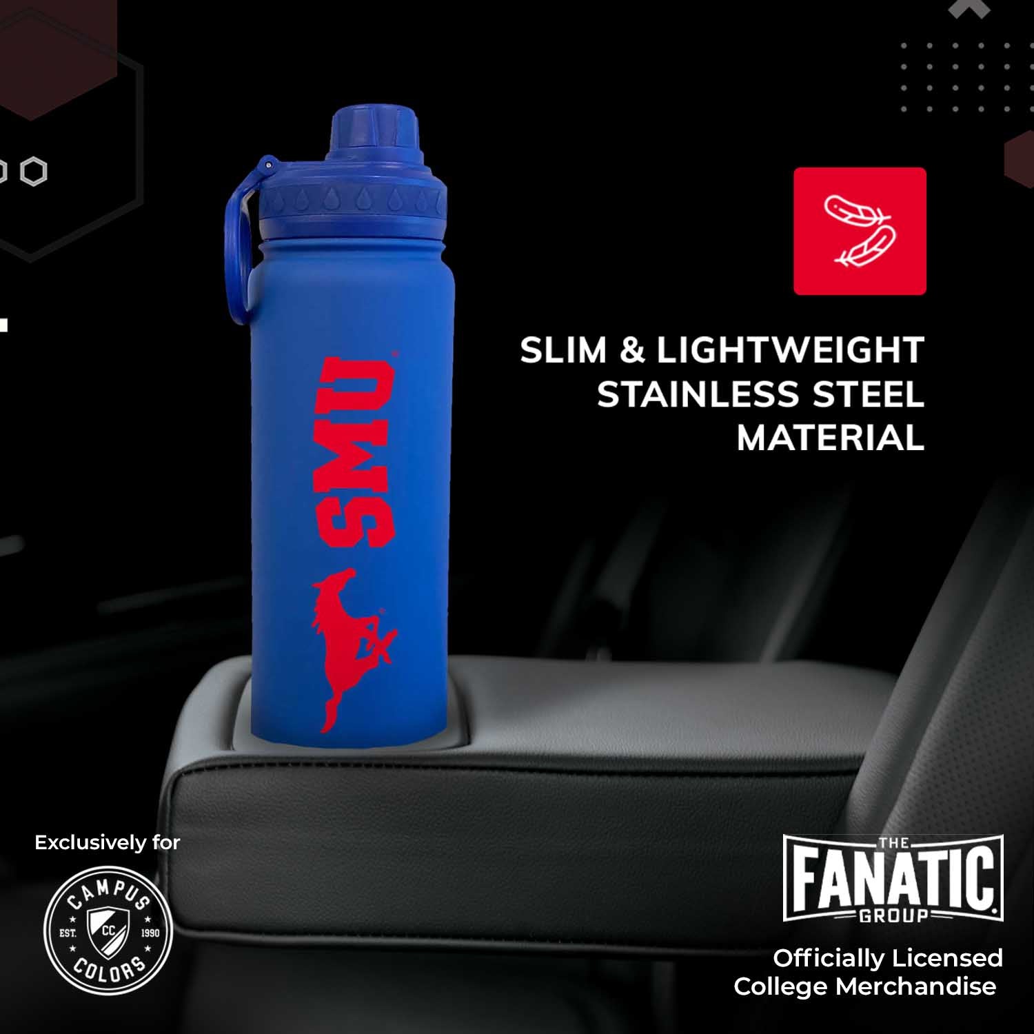 This officially licensed 24oz SMU water bottle is the best accessory for any SMU Mustangs fan. You can use this water bottle 24 oz for water, sports drink, or even to keep your coffee hot. Our vacuum sealed sport bottle ensures that your drinks stay hot or cold for hours. You can bring this bottle along to sport games, hikes, or tailgates on game day. This sport water bottle 24 oz is a slim bottle that fits in most car cup holders for convenience. This stainless sports water bottle features an easy flow spout for the best drinking experience. The twist on cap features an easy drinking spout to make sipping a breeze. The bottle's lid twists on and off to reveal an easy drinking mouthpiece. The convenience of our double walled water bottles make them perfect for sports and everyday life! Show off your school spirit with this SMU Mustangs water bottle. This durable stainless sports water bottle make the perfect SMU Mustangs accessories for any activity. Our water bottle with clip for backpack is perfect for student campus life and busy alumni activities. Our vacuum sealed water bottles feature a built in handle. The easy grab bottle allows you to sip your water without spilling it on yourself while playing sports or walking to class. The college water bottle is coated in silicone for added grip and softer finish, and the exterior is sweat free so the SMU water bottle won't drip on you. This insulated water bottle is the perfect birthday or Christmas gift for fans who love to collect SMU stuff. Pair with other SMU novelties or apparel for the ultimate Mustangs gift for women and men. SMU gear is great as birthday gifts for college students, alumni, and sport fans. With our SMU Mustangs water bottle, fans can show team pride and stay hydrated all day and every day!