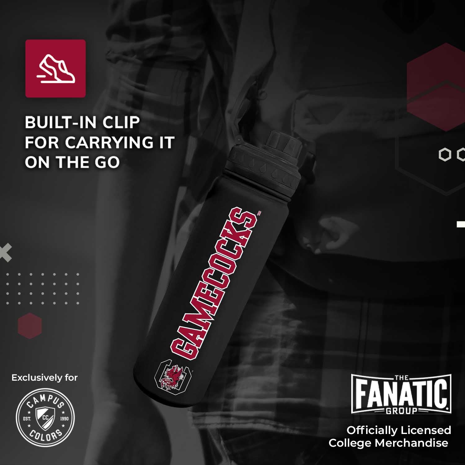 This officially licensed 24oz South Carolina water bottle is the best accessory for any South Carolina Gamecocks fan. You can use this water bottle 24 oz for water, sports drink, or even to keep your coffee hot. Our vacuum sealed sport bottle ensures that your drinks stay hot or cold for hours. You can bring this bottle along to sport games, hikes, or tailgates on game day. This sport water bottle 24 oz is a slim bottle that fits in most car cup holders for convenience.    This stainless sports water bottle features an easy flow spout for the best drinking experience. The twist on cap features an easy drinking spout to make sipping a breeze. The bottle's lid twists on and off to reveal an easy drinking mouthpiece. The convenience of our double walled water bottles make them perfect for sports and everyday life! Show off your school spirit with this South Carolina Gamecocks water bottle. This durable stainless sports water bottle make the perfect South Carolina Gamecocks accessories for any activity. Our water bottle with clip for backpack is perfect for student campus life and busy alumni activities. Our vacuum sealed water bottles feature a built in handle. The easy grab bottle allows you to sip your water without spilling it on yourself while playing sports or walking to class. The college water bottle is coated in silicone for added grip and softer finish, and the exterior is sweat free so the South Carolina water bottle won't drip on you.    This insulated water bottle is the perfect birthday or Christmas gift for fans who love to collect South Carolina stuff. Pair with other South Carolina novelties or apparel for the ultimate Gamecocks gift for women and men. South Carolina gear is great as birthday gifts for college students, alumni, and sport fans. With our South Carolina Gamecocks water bottle, fans can show team pride and stay hydrated all day and every day!