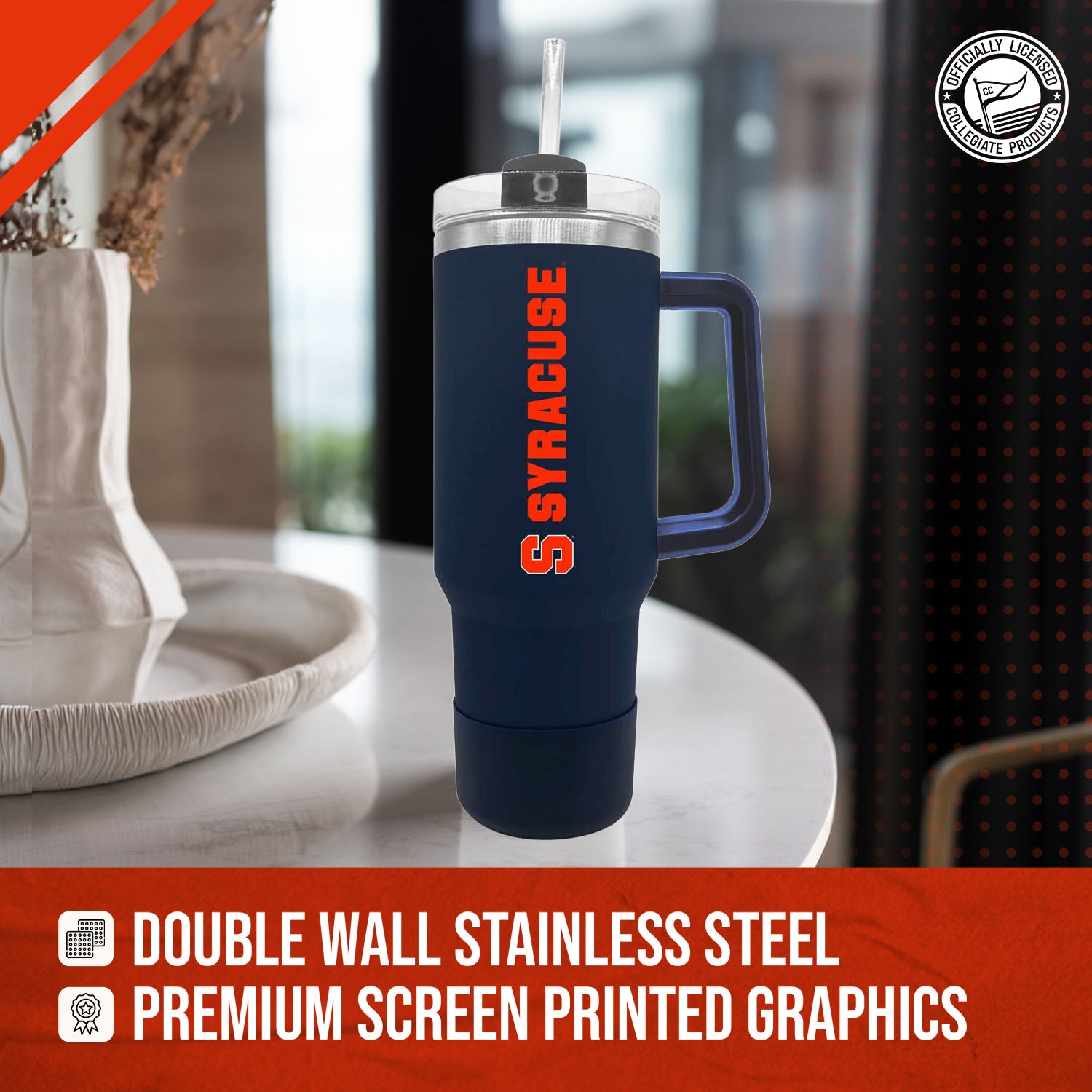 Our stainless steel 40 oz tumblers with handle and straw are designed for constant use in any type of setting! At a sports game? These insulated tumblers are compact and can fit in most cup holders and even feature a no slip grip on the bottom to keep condensation away! On the move? Our contoured spout or straw options makes it easy to sip on the go! No matter the setting, show your school pride while properly and efficiently preserving the desired temperature of your beverage! This Syracuse Orange travel tumbler also makes a great gift! Combine the 40 oz Syracuse tumbler with a Syracuse pillow or a Syracuse blanket and give a whole haul of Orange gear to your favorite alumni! All of our products feature the officially licensed team colors, logos and lettering. We don't skimp on quality in any way. The colors are always vibrant and the graphics are always accurate and brimming with team spirit.