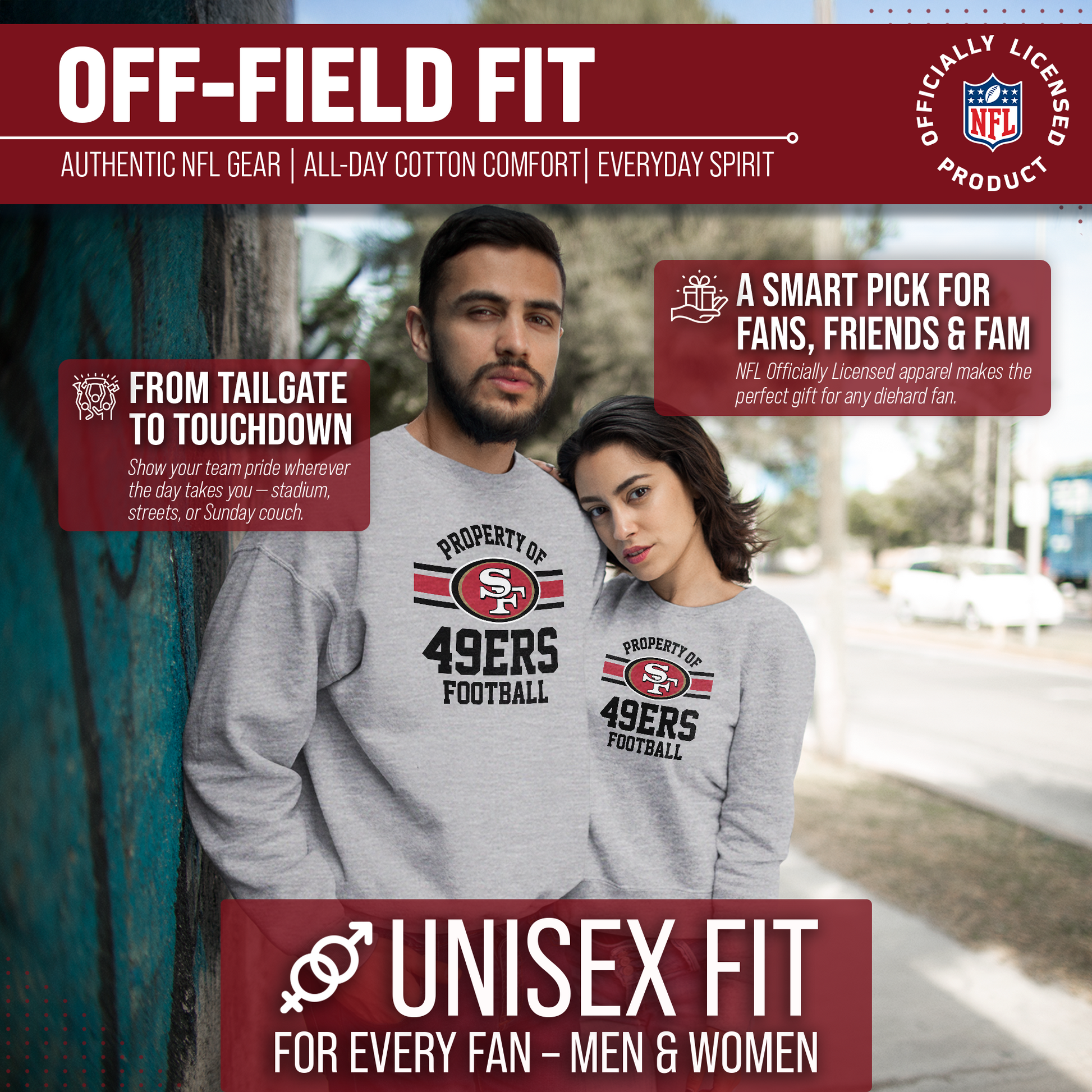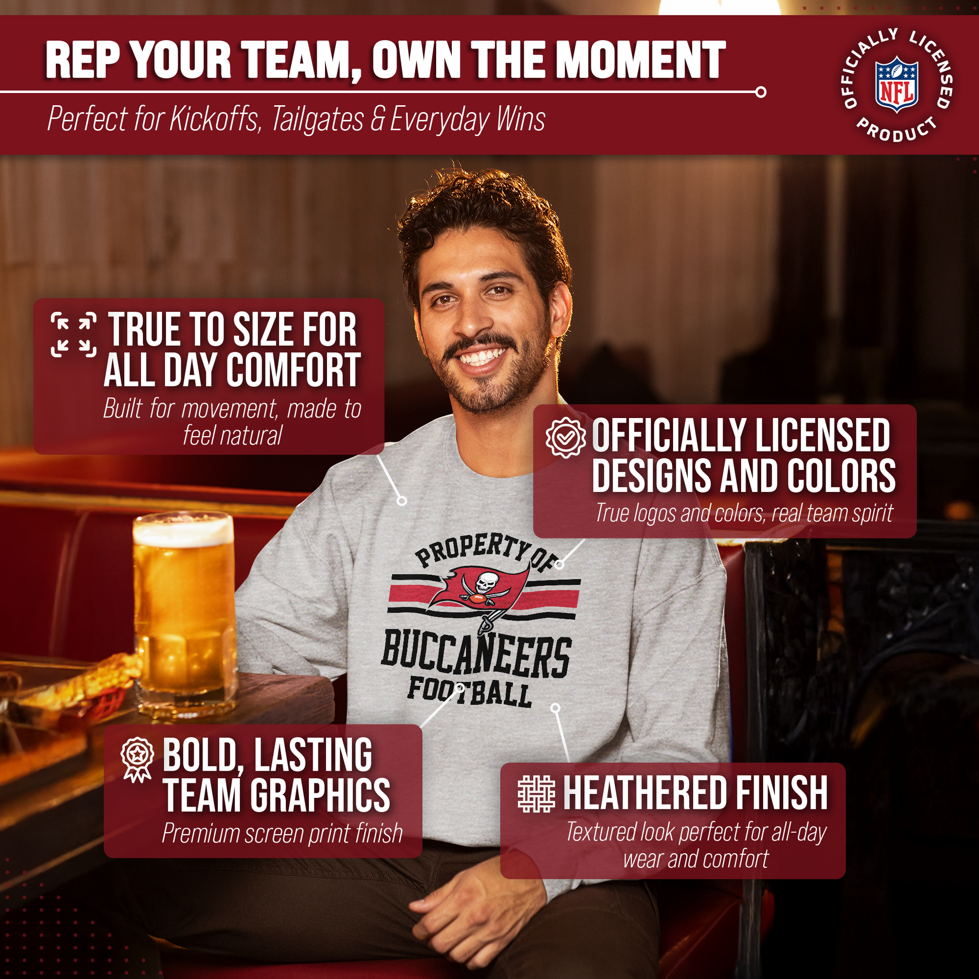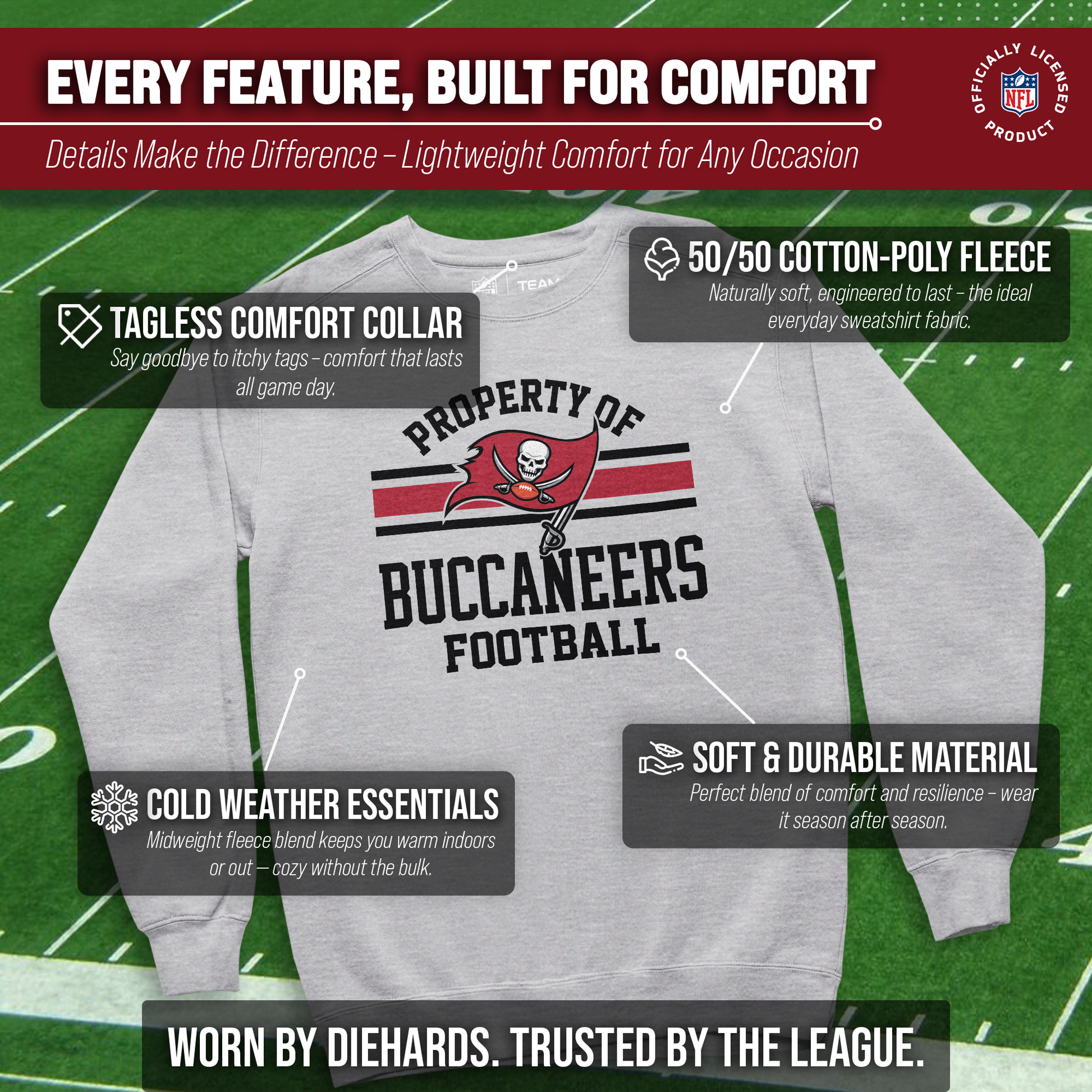 This Property of Tampa Bay Buccaneers pullover crewneck sweatshirt is a cold-weather friendly jacket made from 50% ringspun cotton and 50% polyester. Our mens and womens football sweater is super comfortable, runs true to size, and is great for showing your team pride all year long.    This comfy crewneck features the official Property of graphics will stay crisp and wear after wear and year after year. All colors and fonts are officially licensed and are of the highest of quality. These crew neck sweatshirts are made with air jet yarn for a softer feel and reduced pilling. This tagless Tampa Bay crewneck sweatshirt is perfect for tailgates, games, and showing off your team spirit. Our pullover crewnecks are ideal Buccaneers gifts for men and women football fans. The unisex fit of our Tampa Bay crewneck is ideal for both men and women. This crewneck is essential apparel for protecting yourself from the elements at a football game. The fleece material, ribbed cuffs, and waistband keep all the warmth in, which means there's no need for an extra jacket in the fall months– our crew neck sweaters have you covered.    This Property of Tampa Bay Buccaneers sweatshirt crewneck pullover is pre-shrunk and is ideal for that tailgate or game day when the temperature drops. Our crewneck pro football sweatshirts for women and men help you gear up and get ready to cheer the Buccaneers to victory.