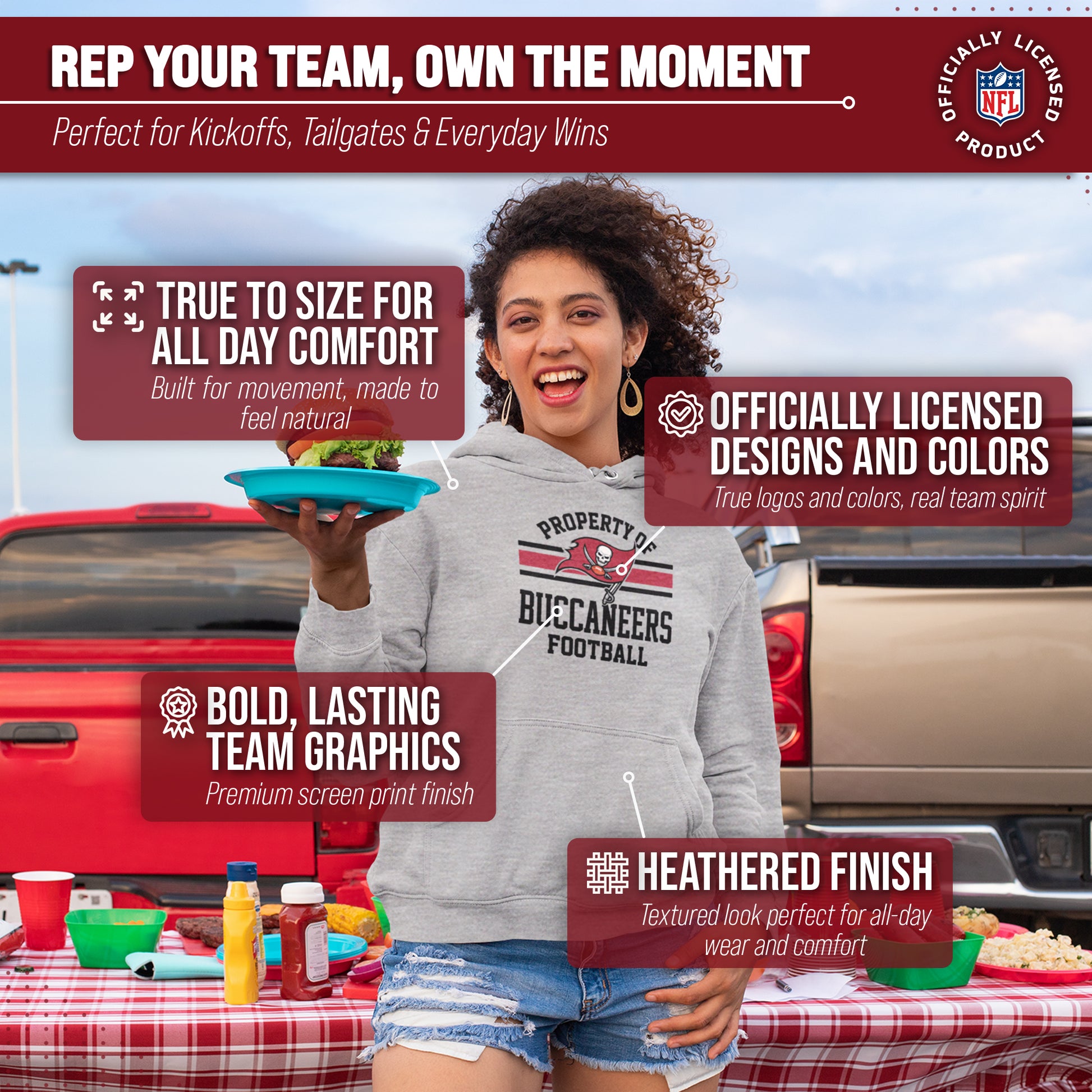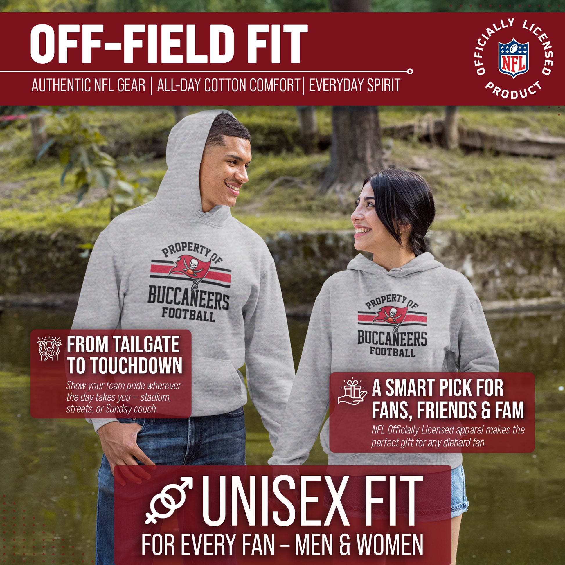 Our Property of Tampa Bay Buccaneers hooded sweatshirt is a pro football hoodie with 8.5 oz fleece lining that features official Property of graphics. Our hoodies for men and women are super comfortable, run true to size, and are great for showing your Buccaneers pride all year long. The tagless Tampa Bay hooded sweatshirt is perfect for tailgates, gamedays, and showing off your team spirit. Our pullover hoodies are ideal Tampa Bay gifts for men and women football fans and the unisex fit makes them ideal for both men and women. The Tampa Bay hoodie is essential apparel for protecting yourself from the elements. The fleece material, ribbed cuffs, and waistband keep all the warmth in, so there's no need for a jacket in the fall months, our hoodie sweatshirts have you covered.    These comfortable hoodies feature the official Tampa Bay Buccaneers colors and graphics. The graphics will stay crisp and wear after wear and year after year. This pro football sweatshirt is designed for comfort. The pro football hooded sweatshirt features ribbed cuffs and waistband, jersey lined hood with metal eyelets, adjustable drawstrings, and a spacious front pouch pocket.      Show your team pride with this Property of Buccaneers sweatshirt! This hoodie is pre-shrunk and made from a dual blend of cotton poly fleece that is ideal for that tailgate or gameday when the temperature drops. The football sweatshirts for women and men help you gear up and get ready to cheer the Tampa Bay Buccaneers to victory.