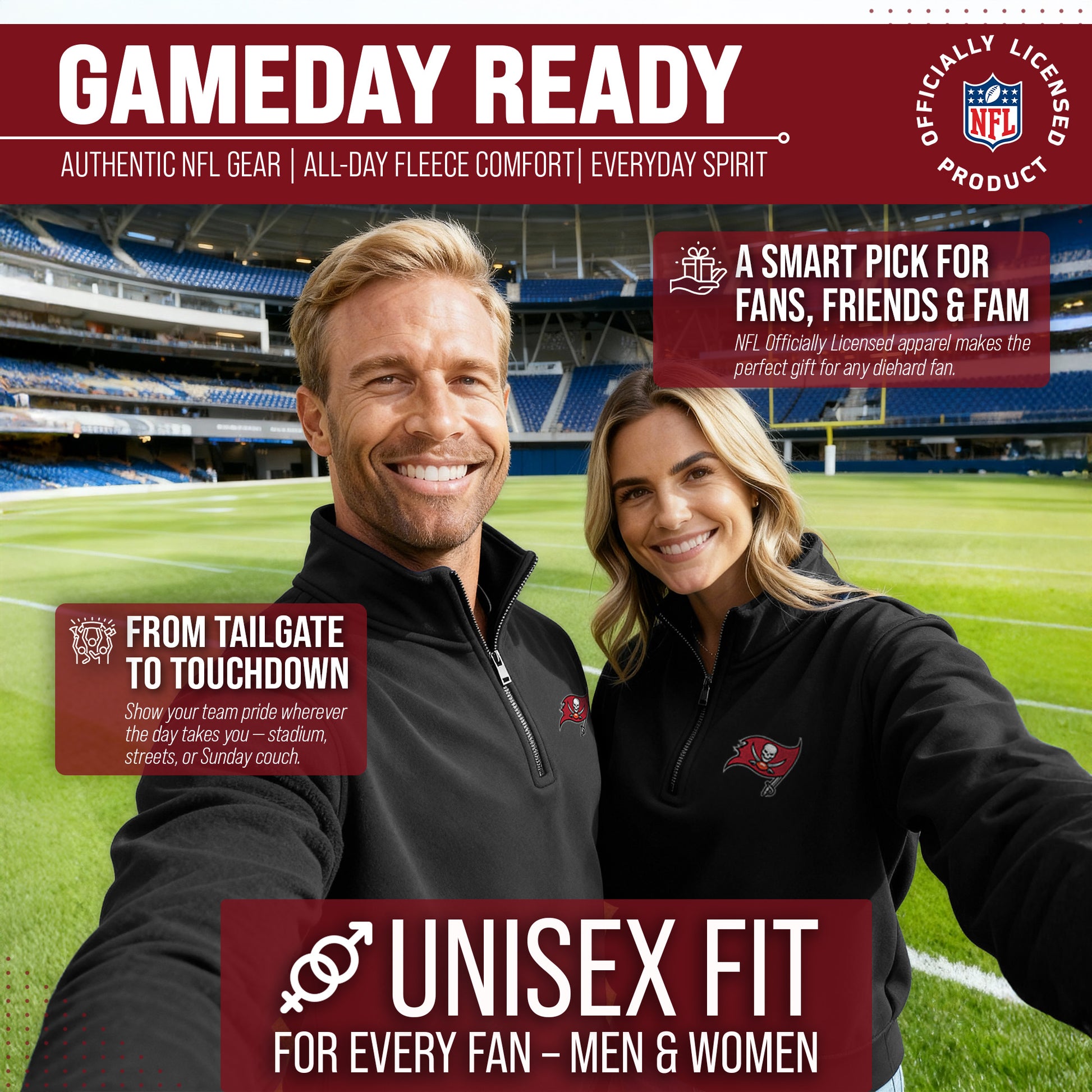 Show off your Tampa Bay Buccaneers pride with the officially licensed NFL Team Logo 1/4 Zip Fleece Pullover Sweatshirt! Designed with fans in mind, this cozy and stylish pullover is the perfect way to represent your favorite team all season long. Crafted with ultra-soft fleece fabric, it delivers warmth and comfort whether you’re braving chilly stadium seats, tailgating with friends, or simply cheering on the Buccaneers from home.    The classic quarter-zip design adds versatile style and makes layering easy, so you can throw it on over a tee or under a jacket as the temperature drops. With the authentic Tampa Bay Buccaneers logo proudly displayed on the front left chest, your loyalty will be clear to everyone around you. No matter where game day takes you, this pullover is a statement piece that showcases true Buccaneers spirit.    Made for both men and women, this sweatshirt features a flattering unisex fit that looks great on all body types. It’s available in a full range of sizes to ensure every Buccaneers fan finds the right fit. Whether you’re hunting for your next go-to tailgate outfit, upgrading your cold-weather game-day look, or shopping for the perfect gift for a fellow football fan, this 1/4 zip fleece is an unbeatable choice.    Durable, versatile, and stylish, the Tampa Bay Buccaneers 1/4 Zip Fleece Pullover Sweatshirt is a must-have addition to any fan’s wardrobe. From Sunday kickoffs to casual everyday wear, you’ll stay warm, comfortable, and proud to rep the Buccaneers every time you put it on. Don’t miss your chance to gear up—this essential fan favorite is ready to help you cheer on your team in style!