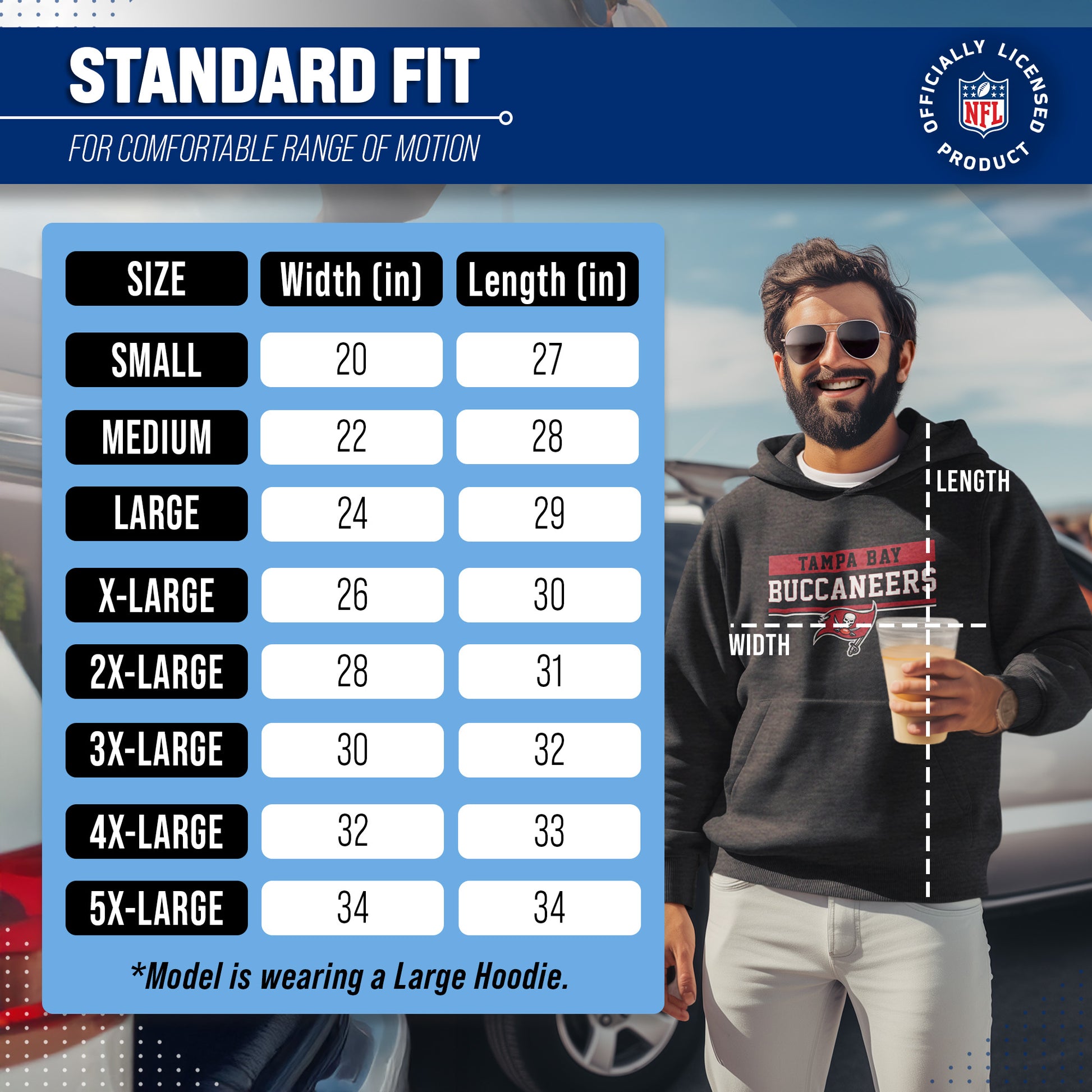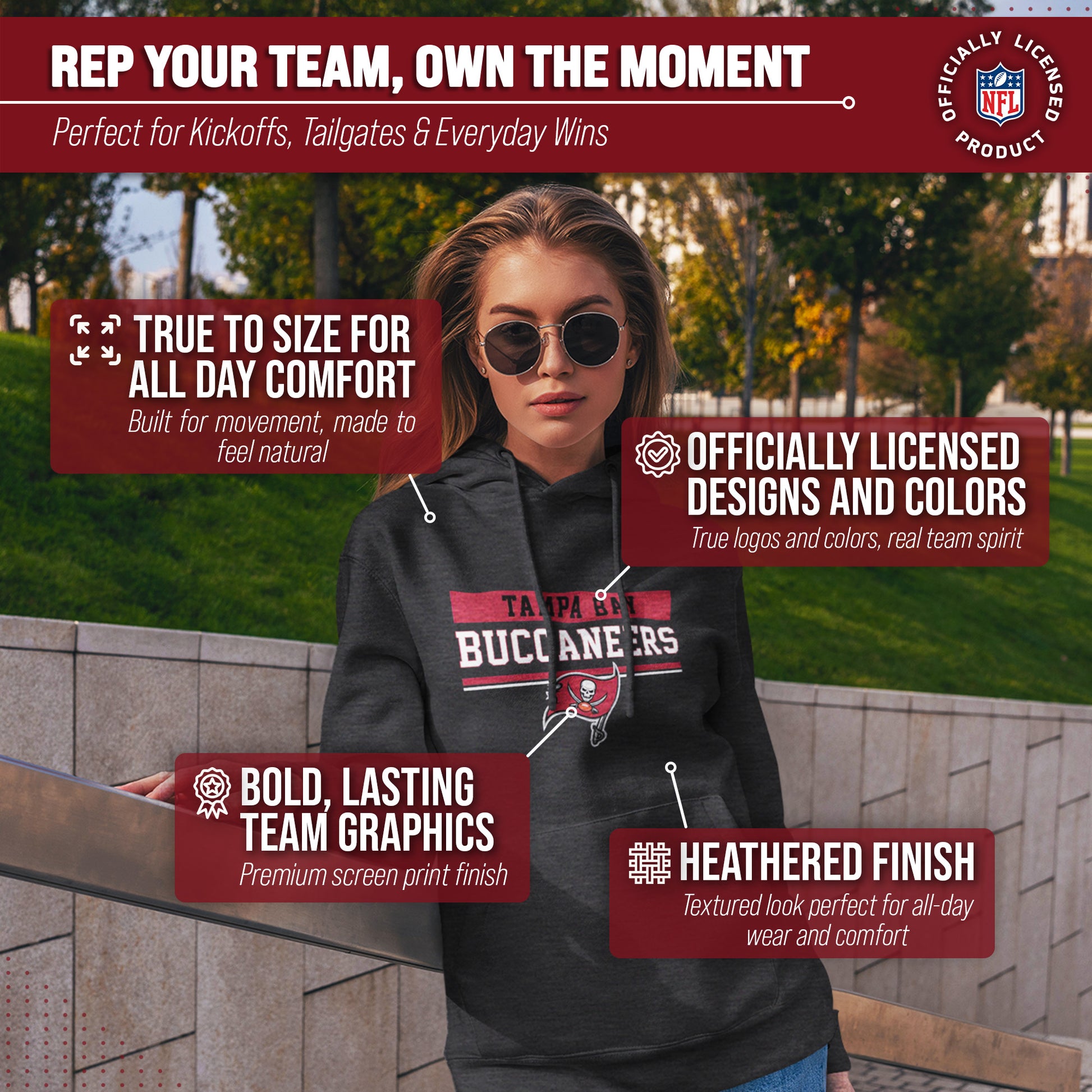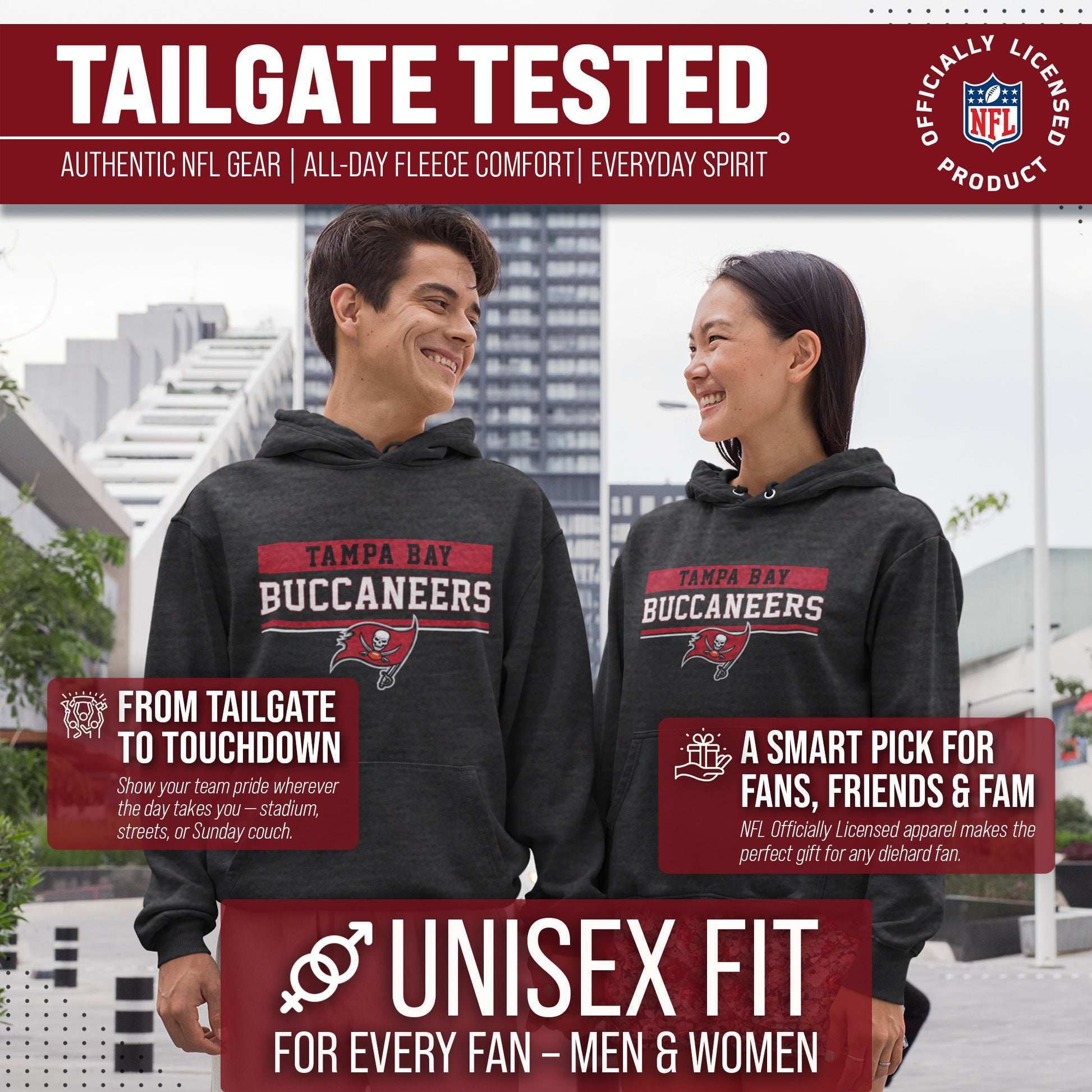 Our Charcoal Gameday Hooded Sweatshirt is a Tampa Bay sweatshirt with a warm and toasty 9 oz fleece lining. It's the very best of Tampa Bay Buccaneers apparel, plain and simple. Gear up for your cold weather football game with confidence. Or, for women, bring it with you to games and tie it around your leggings in case the arena is a little chilly. Our football hoodie sweatshirts for men and women are super comfortable, run true to size, and are great for showing your team pride all year long.     Plus, the unisex fit is ideal for both men and women and works as an oversized sweatshirt for kids. Tampa Bay Buccaneers sweater for men and women features your teams thermal-printed logo wordmark will stay crisp and clear, wear after wear. All colors and fonts are officially licensed and are of the highest of quality, it even comes with an officially licensed tag. Comes with an officially licensed tag; ribbed cuffs and waistband, double layer hood with drawstrings, spacious front pouch pocket. This football sweatshirt in particular is perfect for tailgates, games, and showing off your team spirit.     Gameday hooded [team_ long] sweatshirts make a great birthday, Christmas (or any other holiday), or graduation gift for a sports fan. Gameday charcoal hood is essential apparel for protecting yourself and your loved ones from the elements. The fleece material will keep you warm through the colder months, and the no-zip design allows you to pullover and feel embraced like a big oversized blanket. The Tampa Bay Buccaneers charcoal crew necks are pre-shrunk and are made from a dual blend of 50% cotton and 50% polyester that is ideal for that tailgate or game day when the temperature drops.     Pair with your other favorite Tampa Bay game day apparel! Say goodbye to cheap sweatshirts. Our charcoal sweatshirts for women and men help you gear up and get ready to cheer your team to victory.