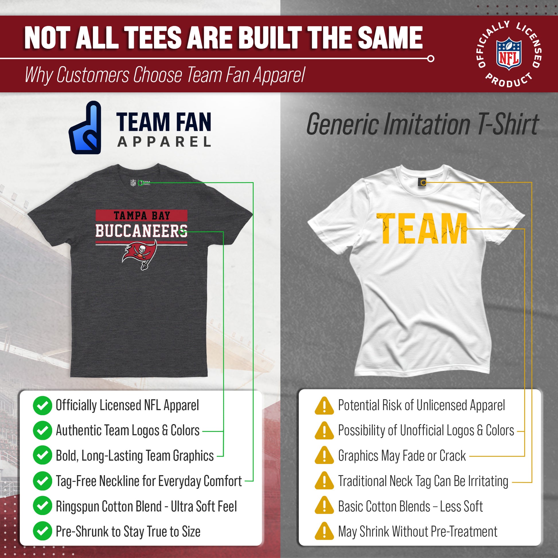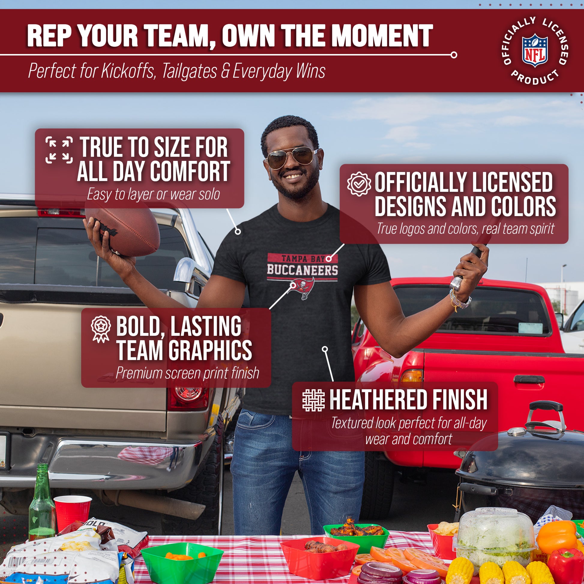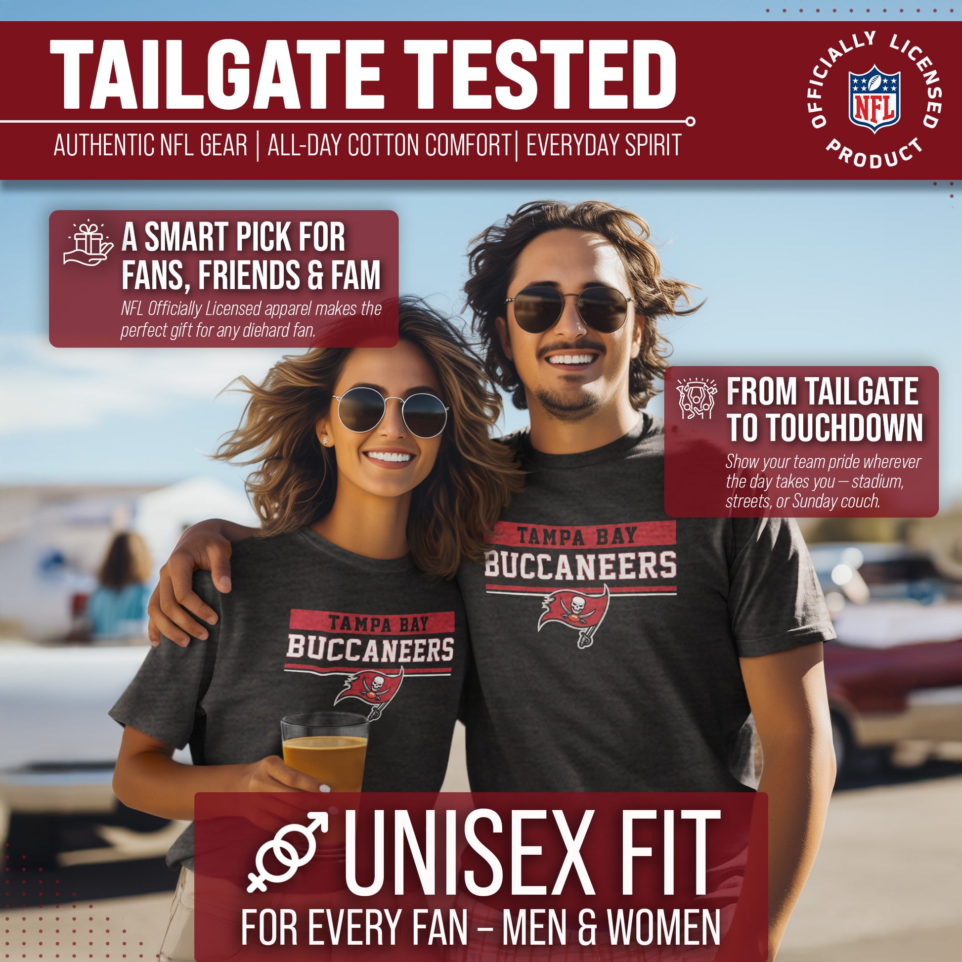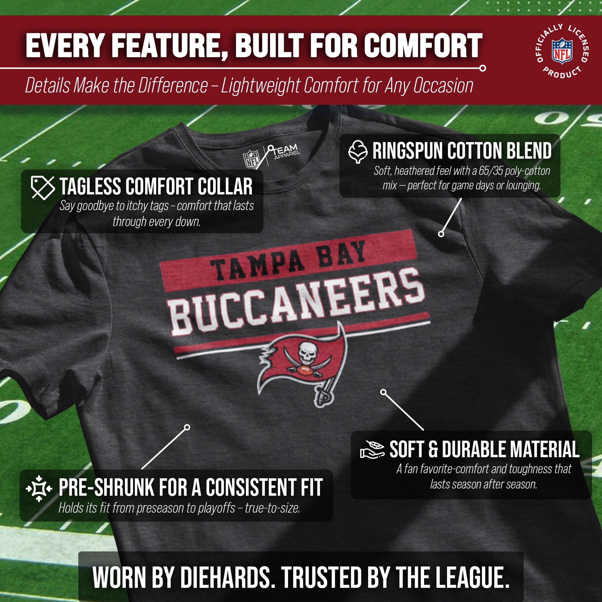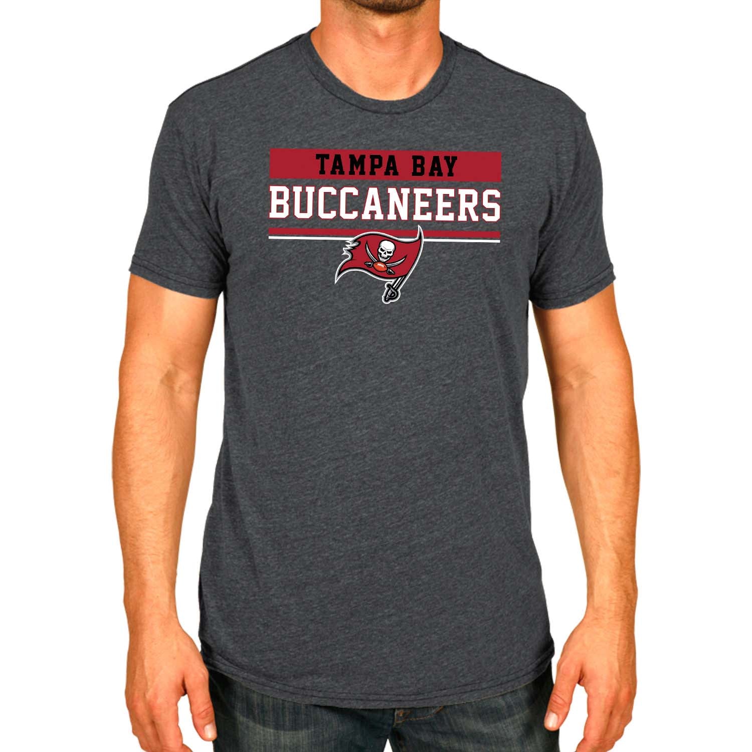 Heather/charcoal wordmark womens and mens Tampa Bay Buccaneers t shirts are the ultimate light, soft, and comfortable tee. These Tampa Bay Buccaneers tshirts are the most versatile football apparel. Let us help you celebrate and showcase team pride with our durable and lightweight Tampa Bay Buccaneers t shirts for men and women. This tee features a quality, screen printed wordmark that will last wear after wear. The official wordmark design gives you the look of a loyal and seasoned sports fan and the unique heather, dual-blended material gives a trendy, distressed look without that heavy printed feel. Made of 50% ringspun cotton and 50% polyester, the dual blend material is extremely soft, smooth and comfortable. These Tampa Bay Buccaneers shirts for men and women comes without a tag, so you'll never feel annoyed or irritated by those pesky neck tags again!     This tee is essential apparel for any football fan. This classic Tampa Bay Buccaneers t shirt will stand out and is perfect for the gameday tailgate, hanging out with friends, or wearing to the gym. The unisex fit and design makes it ideal for both men and women! Quality [team short] t shirt makes the best birthday, Christmas, or graduation gifts for [team short] fans; Our Tampa Bay Buccaneers shirts run true to size. All quality logos and colors are officially licensed and are of the highest quality. Show off your team pride with this official short sleeve Tampa Bay Buccaneers t shirt!