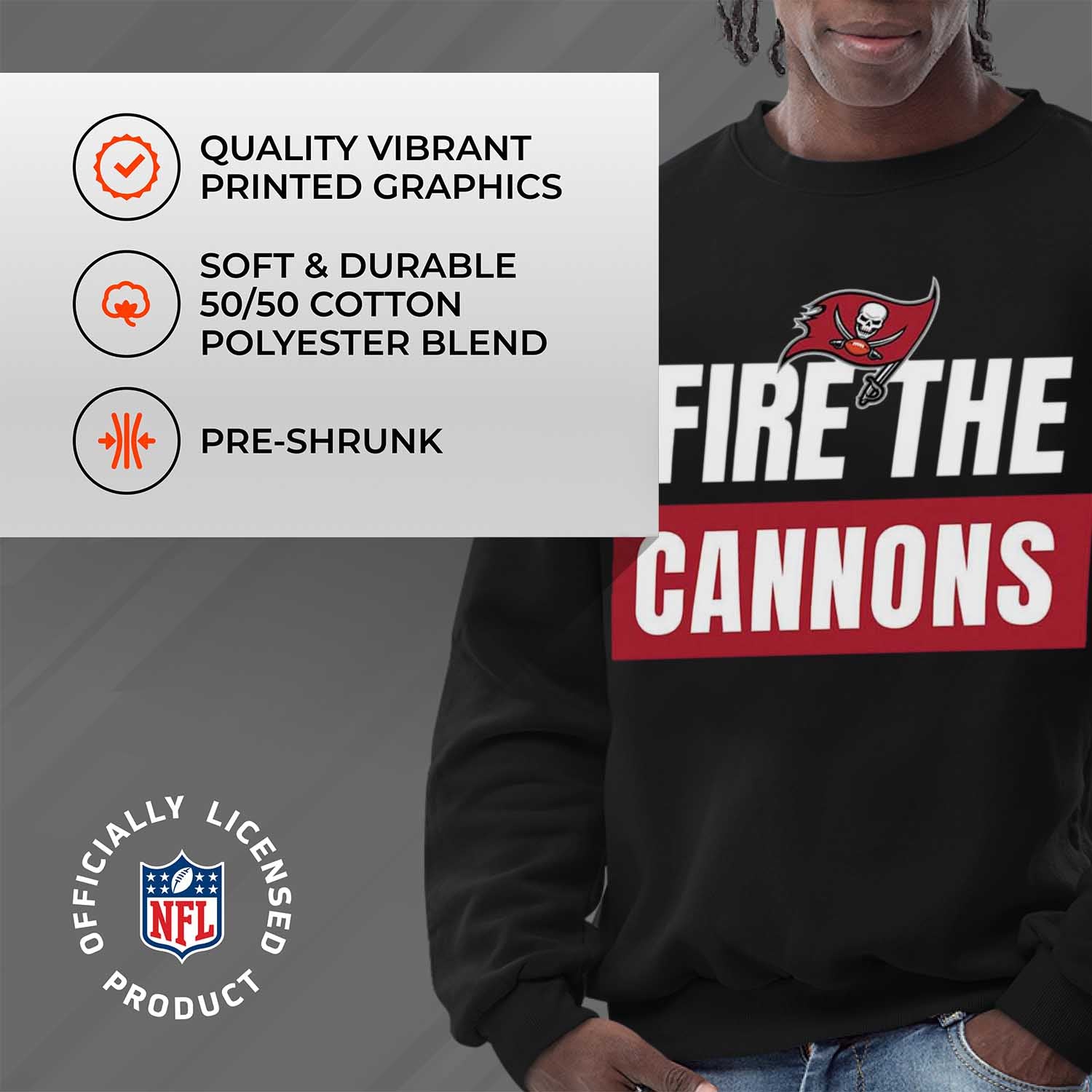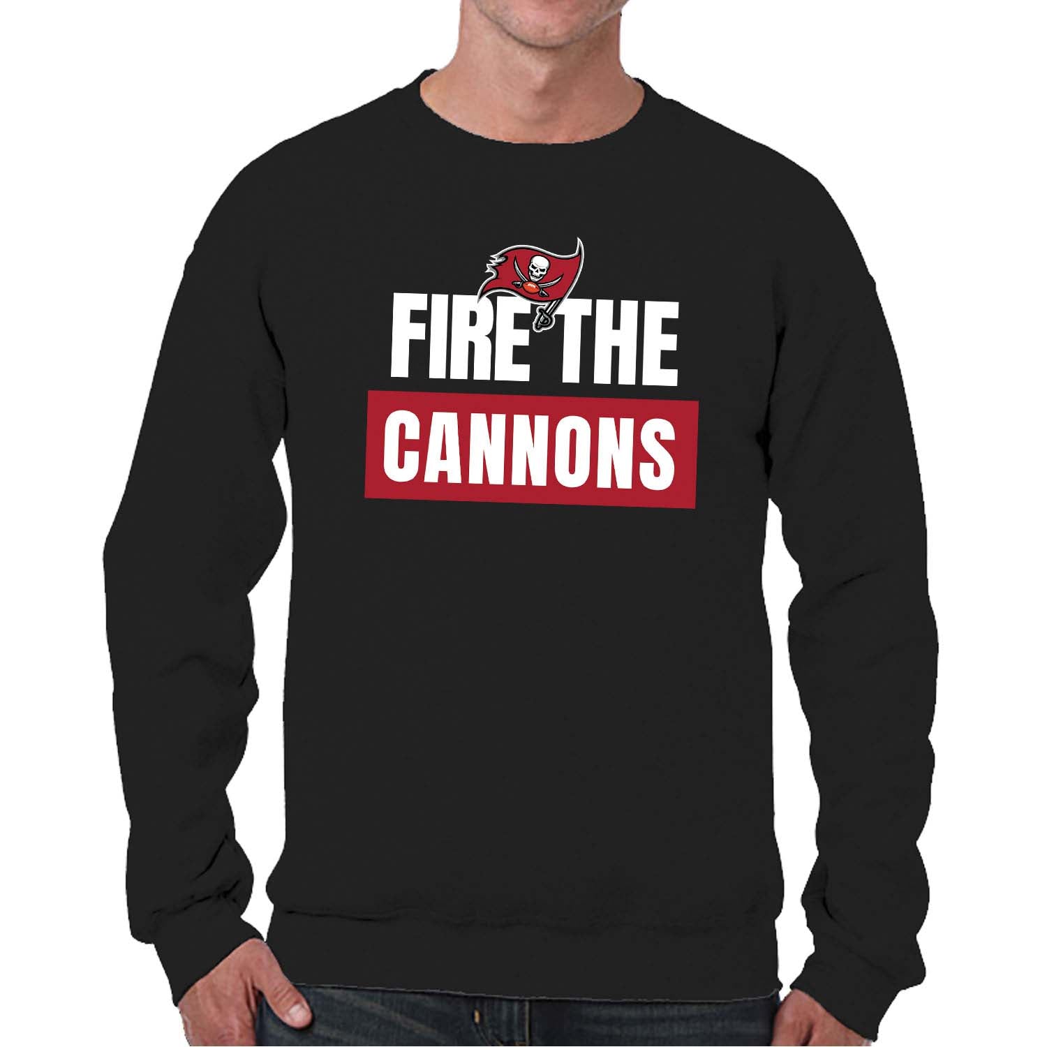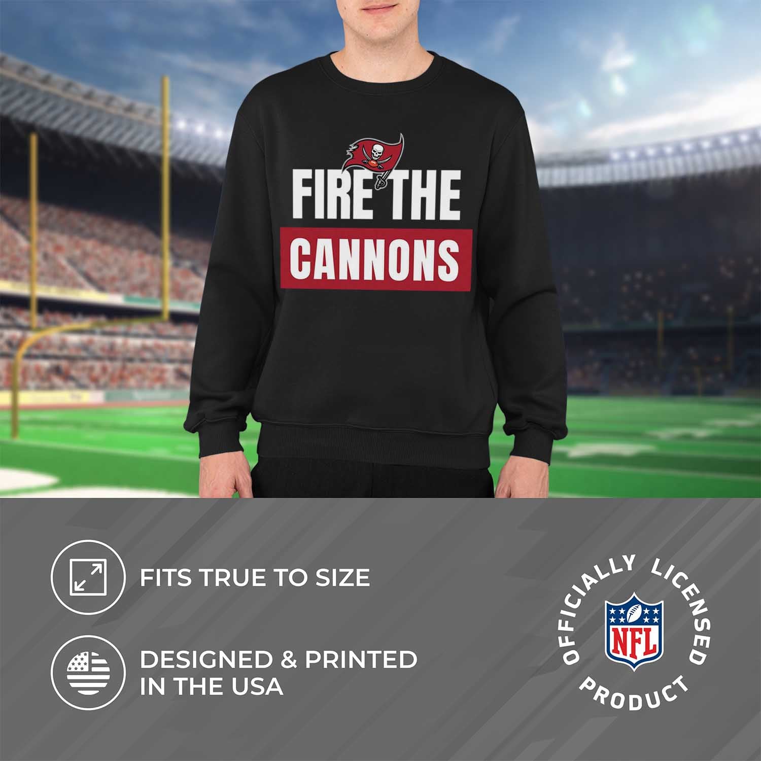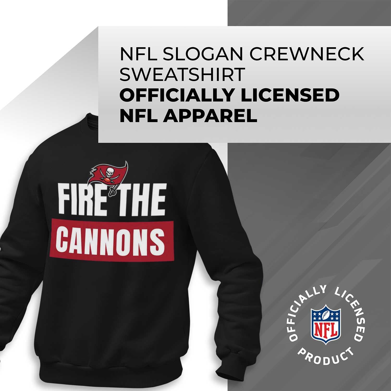 This Tampa Bay slogan pullover crewneck sweatshirt is a cold-weather friendly jacket made from 50% ringspun cotton and 50% polyester. Our mens and womens football sweater is super comfortable, runs true to size, and is great for showing your team pride all year long.    This comfy crewneck features the official Tampa Bay Buccaneers slogan; graphics will stay crisp and wear after wear and year after year. All colors and fonts are officially licensed and are of the highest of quality. These crew neck sweatshirts are made with air jet yarn for a softer feel and reduced pilling. This tagless slogan crewneck sweatshirt is perfect for tailgates, games, and showing off your team spirit. Our slogan pullover crewnecks are ideal Tampa Bay gifts for men and women football fans. The unisex fit of our crewneck is ideal for both men and women. This slogan crew is essential apparel for protecting yourself from the elements at a football game. The fleece material, ribbed cuffs, and waistband keep all the warmth in, which means there's no need for an extra jacket in the fall months– our crew neck sweaters have you covered.    This Tampa Bay sweatshirt crewneck pullover is pre-shrunk and is ideal for that tailgate or game day when the temperature drops. Our crewneck pro football sweatshirts for women and men help you gear up and get ready to cheer the Tampa Bay Buccaneers to victory.