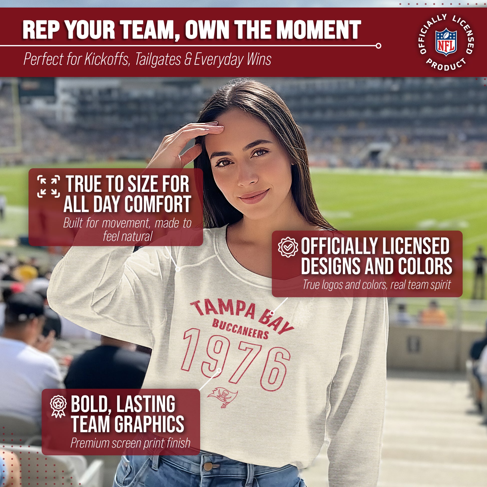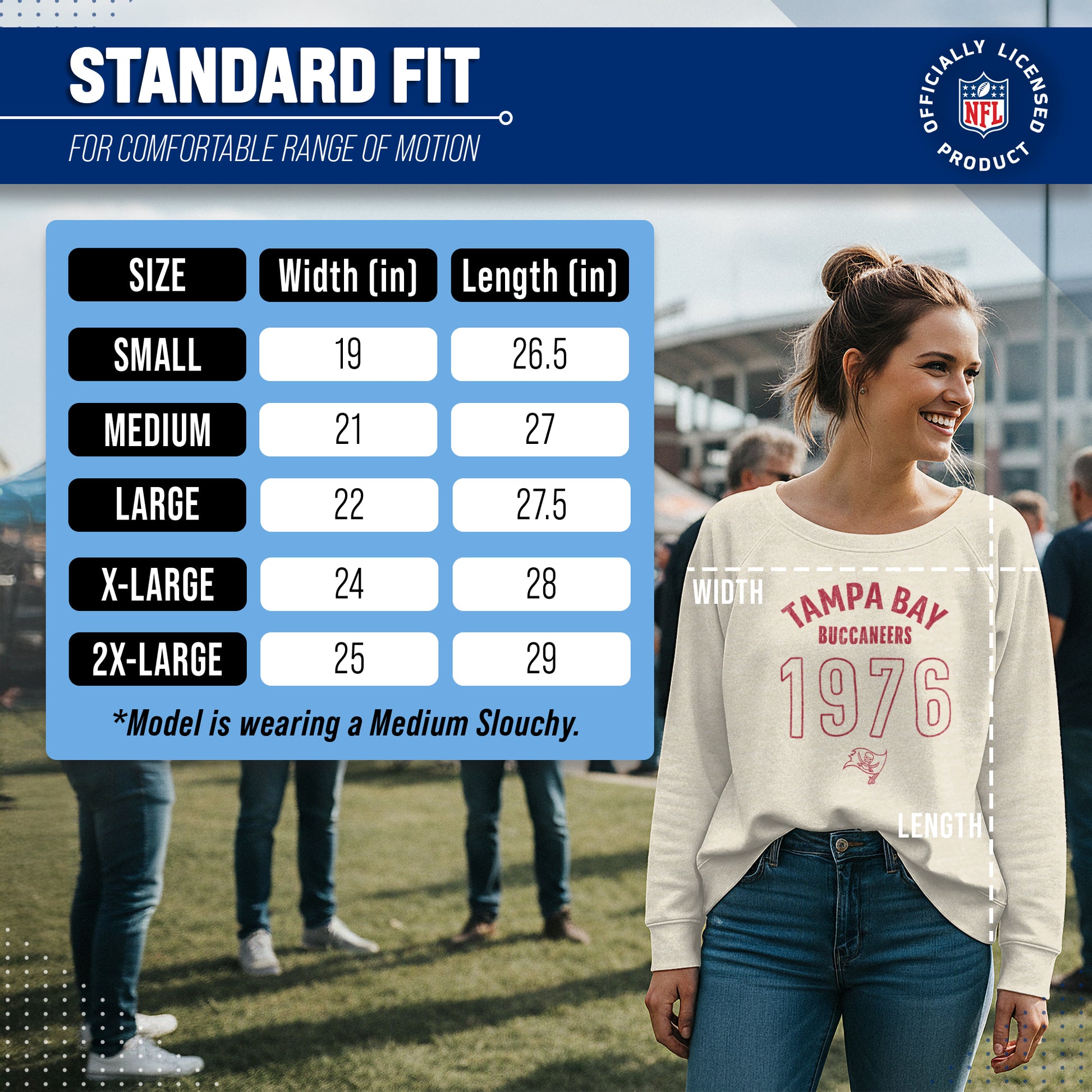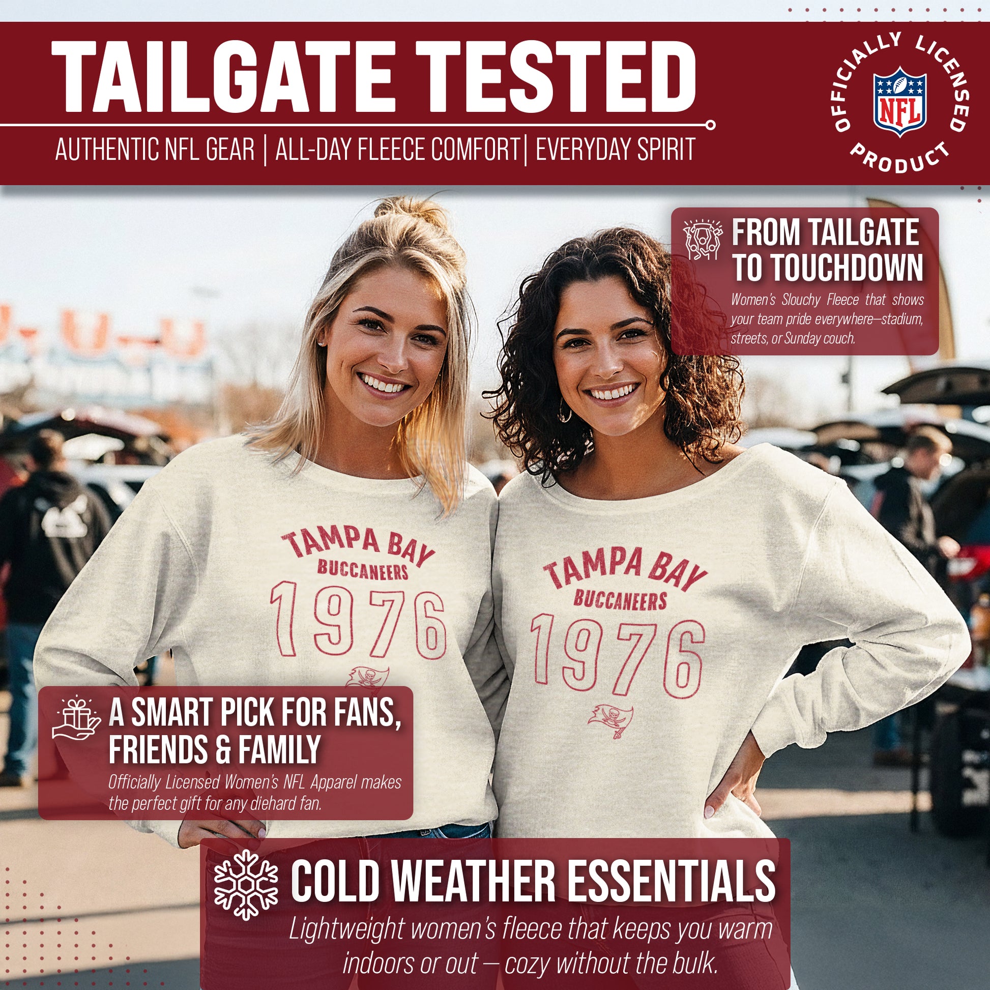 Hey there, fellow lady football fans! Show off your team pride in style with our Team Fan Apparel Tampa Bay Buccaneers NFL Women's Big Date Slouchy Crewneck Fleece Pullover. Made with extra soft cotton polyester fleece material, this long sleeve pullover sweatshirt will keep you warm and cozy on game day or any chilly day. With a tagless design, you won't have to worry about any annoying tags distracting you from cheering on your team.  Featuring the year your favorite team was established in a large font design and relaxed fit, this pullover adds a touch of fashion to your game day wardrobe. Available in a range of women's sizes, it's the perfect addition to any fan's closet. Whether you're headed to the stadium or watching from home, stay cool and stylish with this must-have piece of Buccaneers apparel. Don't let snow or cold weather dampen your team spirit - grab one for yourself or as a gift for the ultimate football-loving lady in your life! Go Buccaneers!