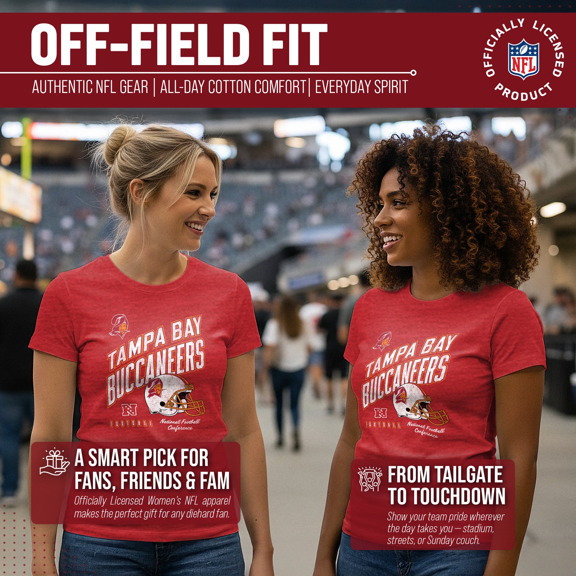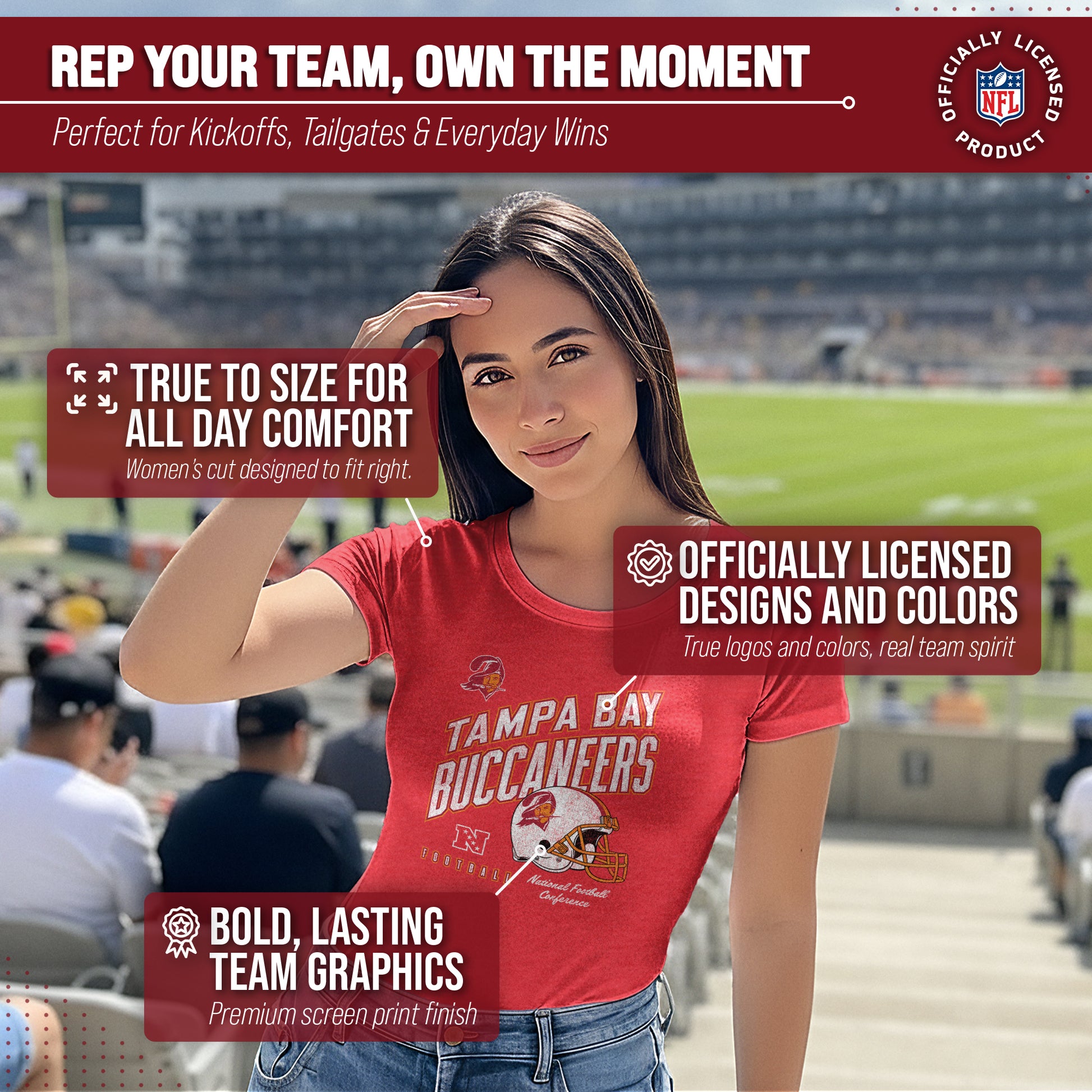 Calling all ladies! Get ready to rock game day with the Women's Team Fan Apparel Distressed Helmet T-Shirt! This comfortable and stylish Tampa Bay Buccaneers womens tee is perfect for any female football fan, whether you're cheering on your favorite team at the stadium or watching from home. Made from a super soft cotton fabric , this shirt will keep you cool and comfortable all game long.  The helmet, team name, team logo and official team color adds a touch of retro flair, while the tag-less design ensures itch-free wear. Whether you're a die-hard fan or just love a good simple look, this shirt is perfect for showing off your team spirit. Available in a wide range of women's sizes, it's suitable for all shapes and sizes!  So grab your girlfriends and get ready to cheer on your team in style with the Women's Team Fan Apparel Distressed Helmet T-Shirt!