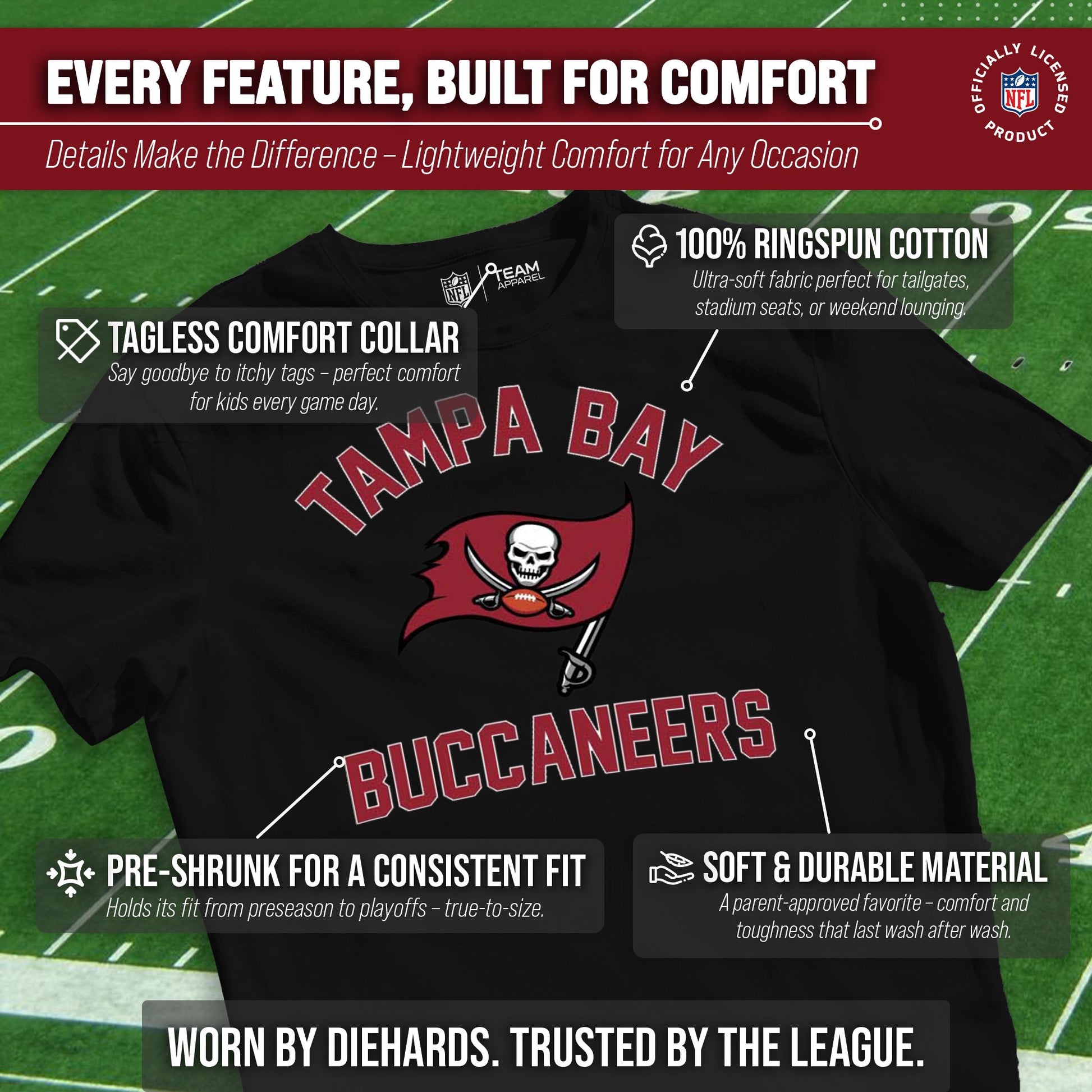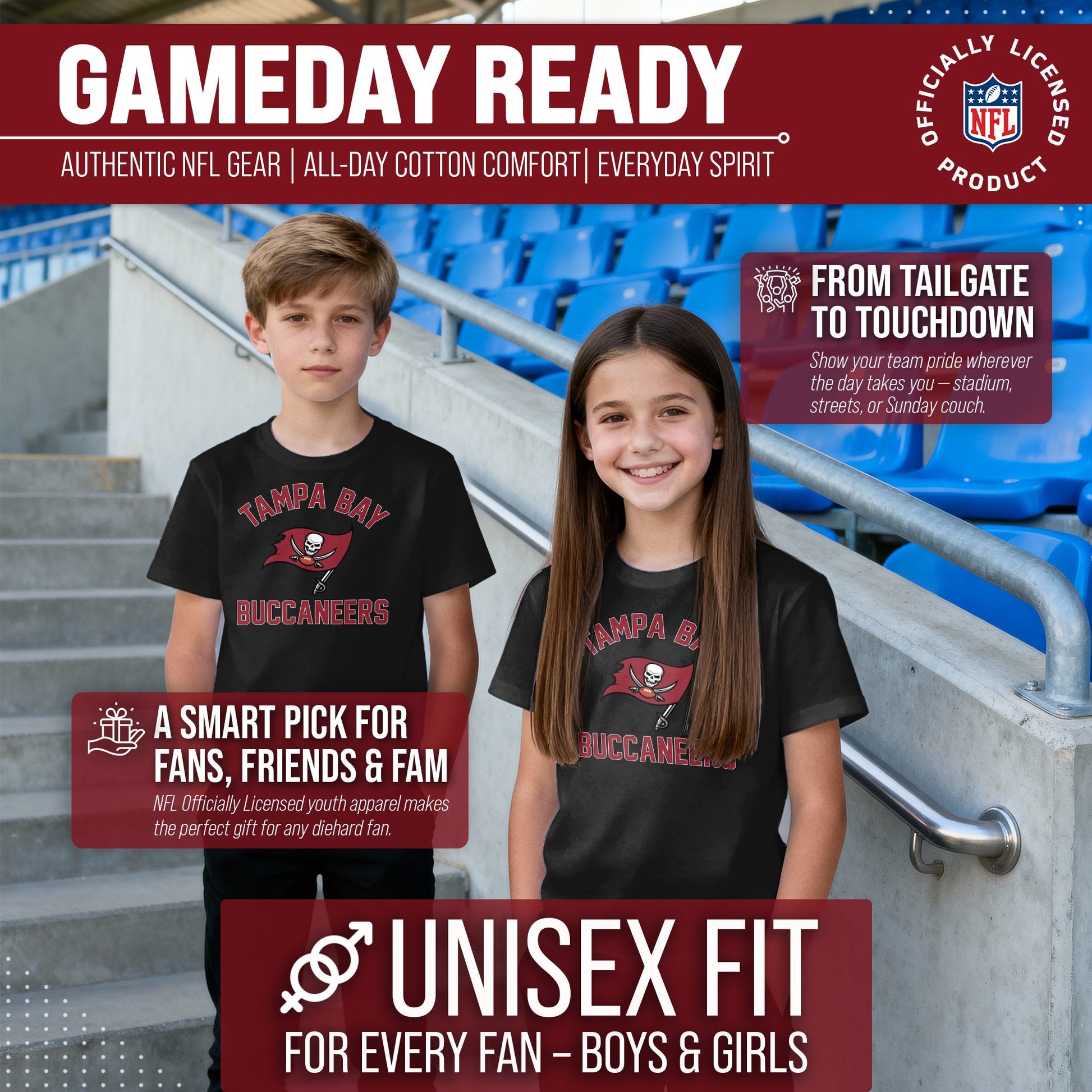 There's nothing more exciting than a much-anticipated gameday. Our Youth Gameday Tampa Bay Buccaneers football tshirt is the ideal shirt to wear on gameday whether you're at the game, or watching from the comfort of your own home. This Tampa Bay tshirt is super comfortable, runs true to size, and is great for showing team pride all year long! The semi-fitted style makes this the perfect Buccaneers youth shirt for both boys and girls. Our shirts really are the perfect fan apparel for school and sports games. The youth gameday shirt is lightweight and ideal for warmer weather or as an extra layer during colder months. Our Buccaneers shirts for boys and girls are essential apparel for young football fans. Our tagless Tampa Bay Buccaneers youth shirt ensures the most comfortable fit. This semi-fitted tshirt is made from a 50/50 cotton/polyester blend; contrast shoulder to shoulder neck tape and 1x1 rib knit neck makes for comfortable fit around the neck and shoulders. This high quality shirt for kids features a double-needle sleeve and bottom hems. These are high quality Buccaneers graphic shirts for girls and boys. The vivid graphics will stay crisp wear after wear, and year after year. The thermal printed graphics are high definition, official true team colors, and also resist fading. This Tampa Bay tshirt is made with high stitch density for smoother printing surface. Our official shirts for boys and girls make the best gifts. This piece of Tampa Bay Buccaneers apparel is the perfect birthday or Christmas gift for any young football fan. This tee is absolutely perfect for school, stadium fun, or watching the game at home.